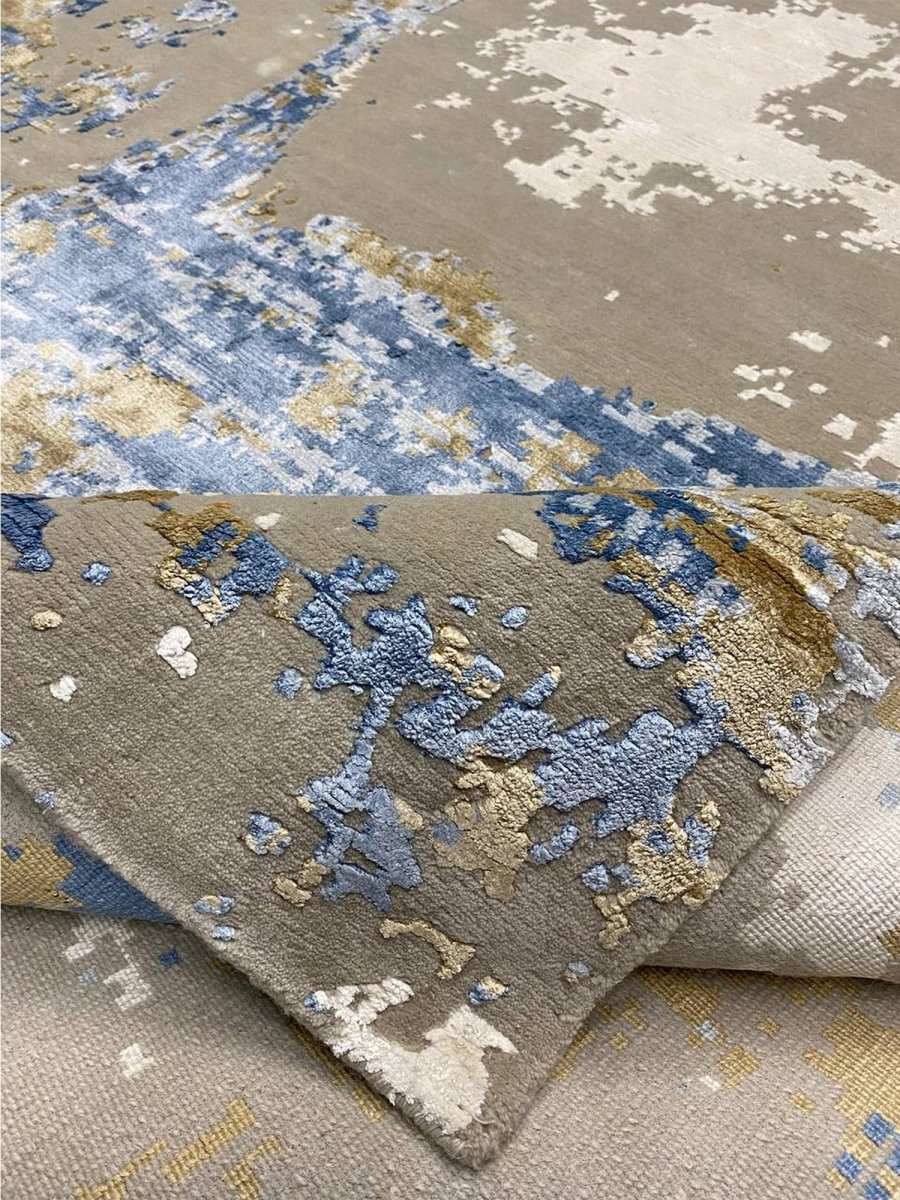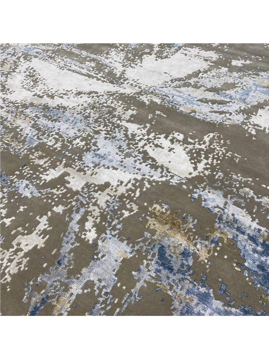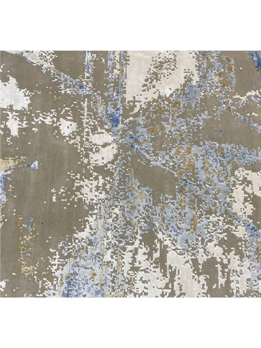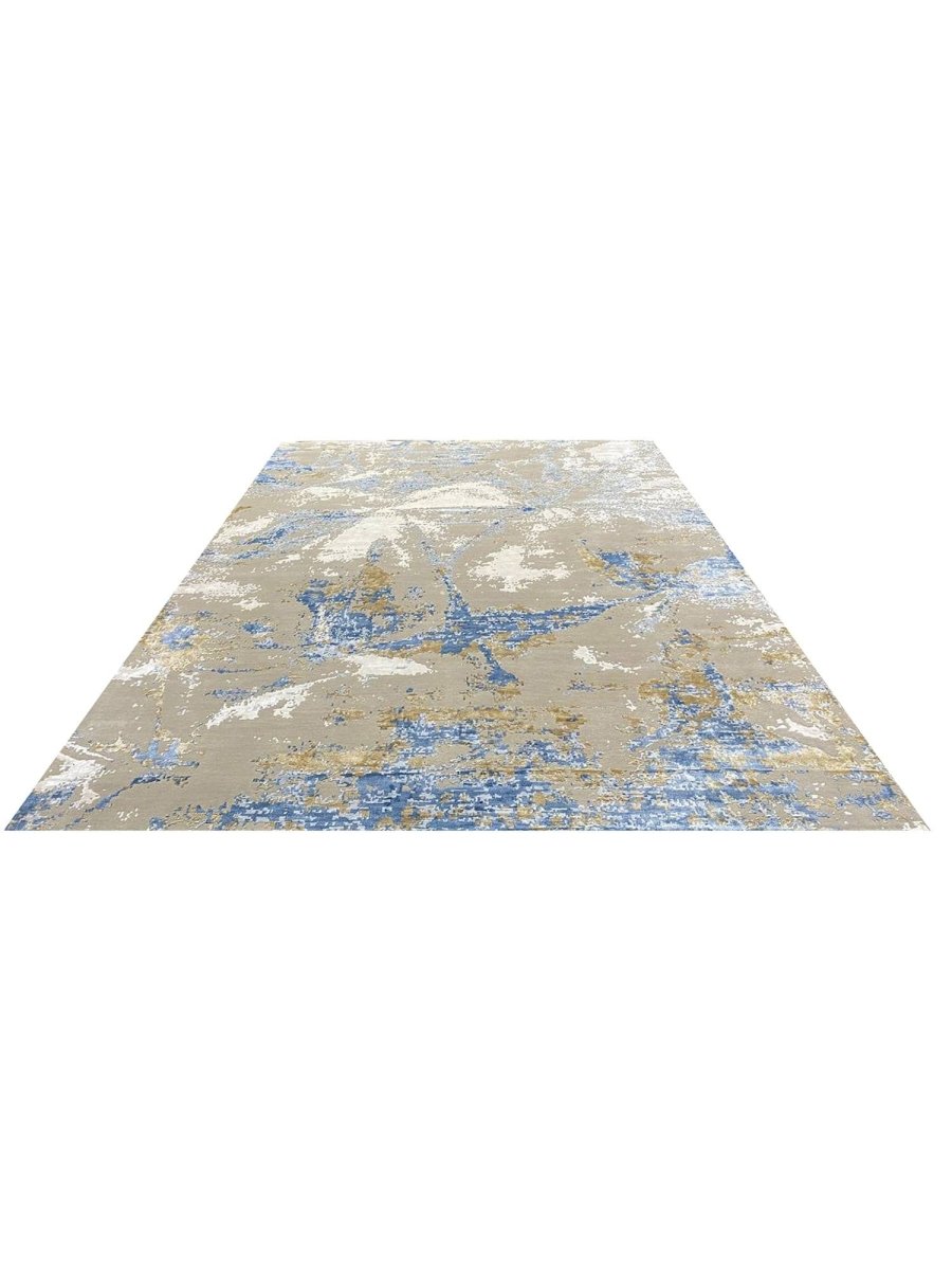 Add a touch of casual style to your home with this 9x12 Modern Abstract Area Rug, crafted in India. This classic rug features a captivating abstract pattern, showcasing a simple yet effective design in a soft ivory, warm gray, beige, brown, and blue palette. Its durable wool and bamboo silk construction ensures longevity and easy care, while the clean finish reflects quality craftsmanship and design. Effortlessly enhancing any interior, this piece adds warmth, texture, and a relaxed yet sophisticated feel. A harmonious blend of timeless design and practical function, it elevates any space with subtle artistry. Enjoy free shipping across the United States. Each rug offers a distinct character, with subtle variations inherent to its handmade creation.