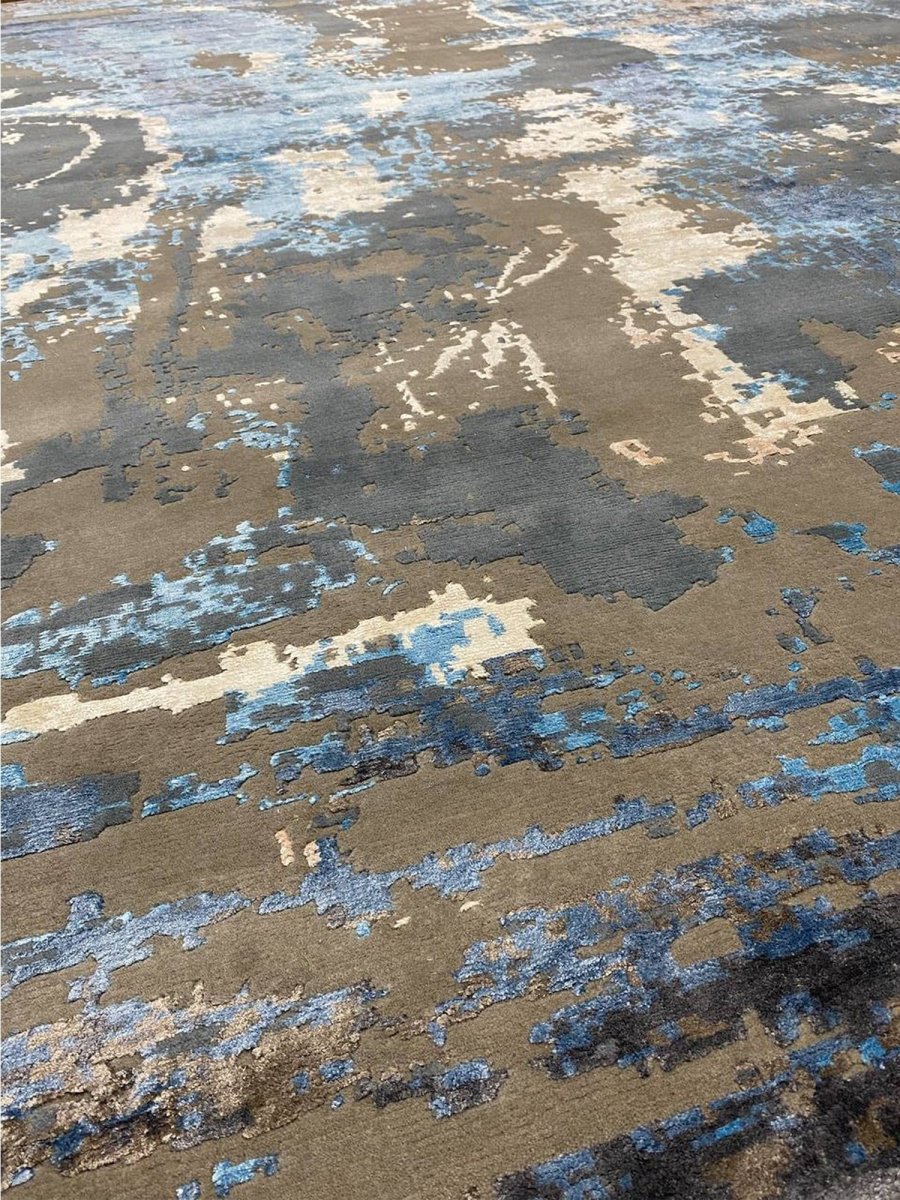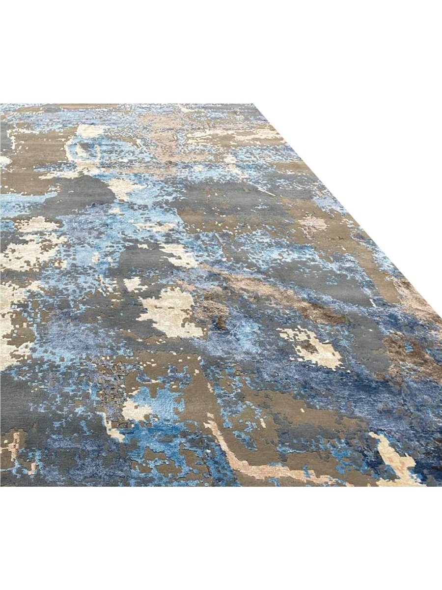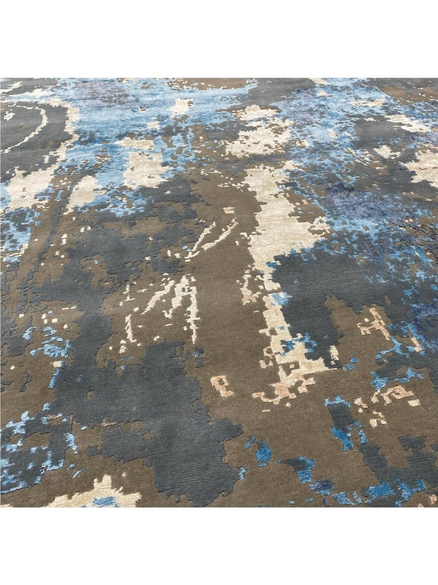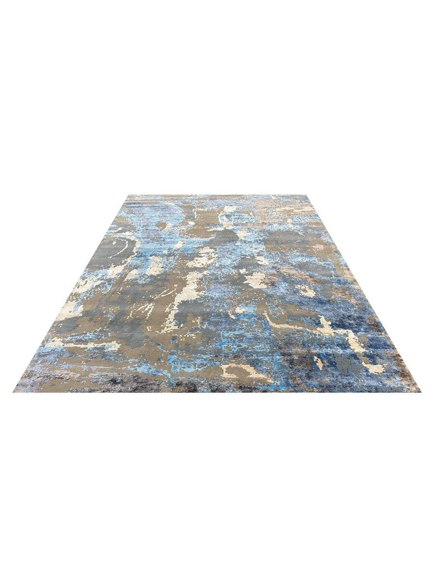 Add a touch of casual style to your home with this 9x12 Modern Abstract Area Rug, crafted in India. This modern rug features a captivating abstract pattern with a simple yet effective design in a soft beige, brown, blue, and charcoal palette. Its durable wool and bamboo silk construction ensures longevity and easy care, while the clean finish reflects quality craftsmanship and thoughtful design. This piece effortlessly brightens any interior, adding warmth, texture, and a relaxed feel. A perfect balance of style and function, it enhances a wide range of decor aesthetics. Enjoy free shipping across the United States, with each rug offering a distinct look through subtle variations inherent to its creation.