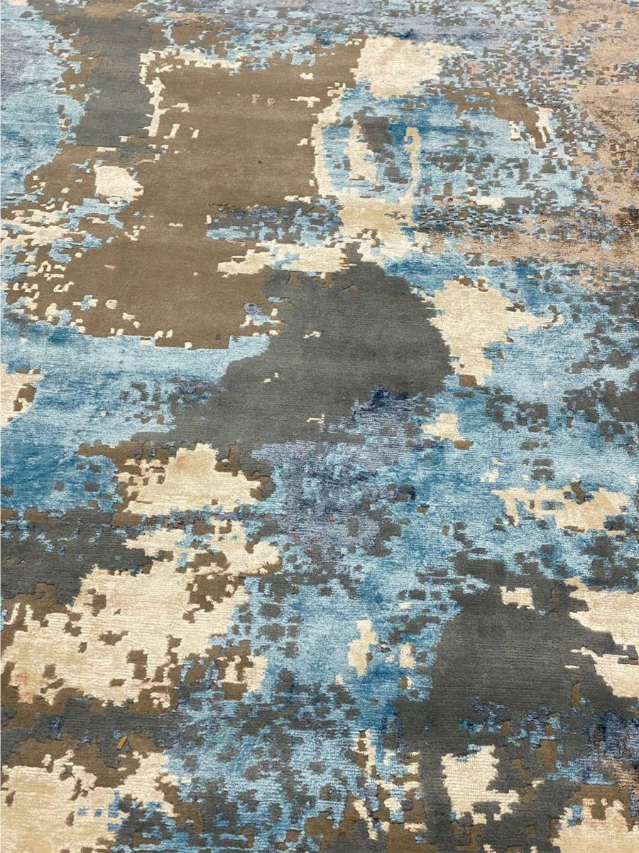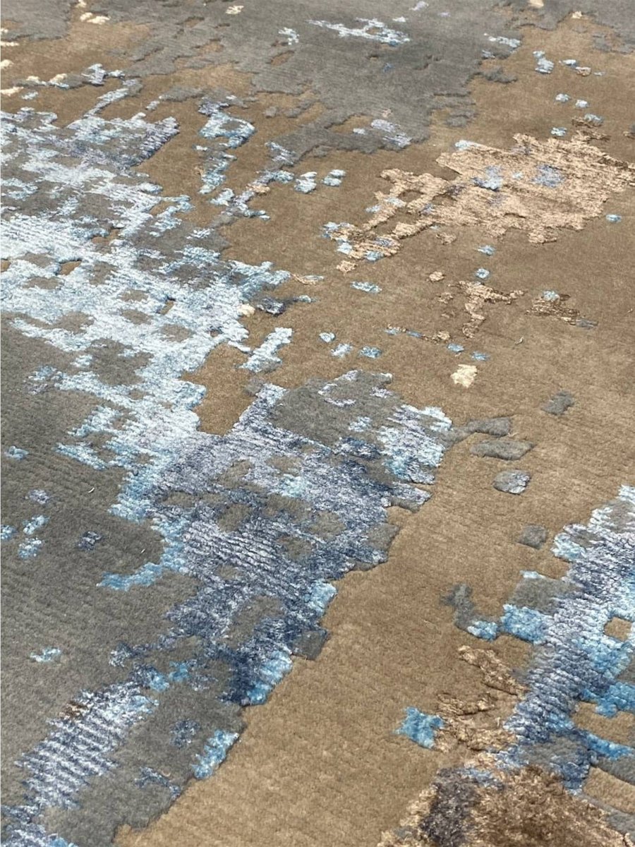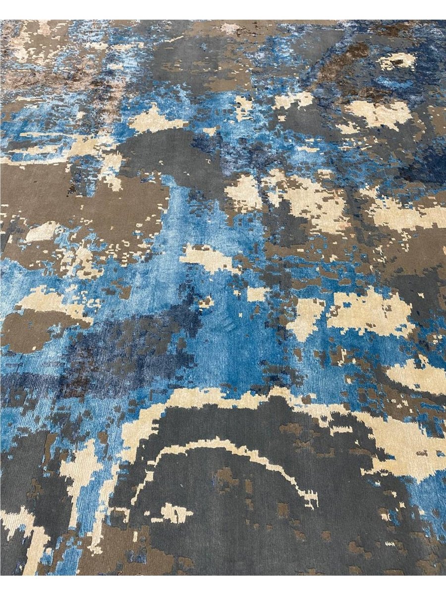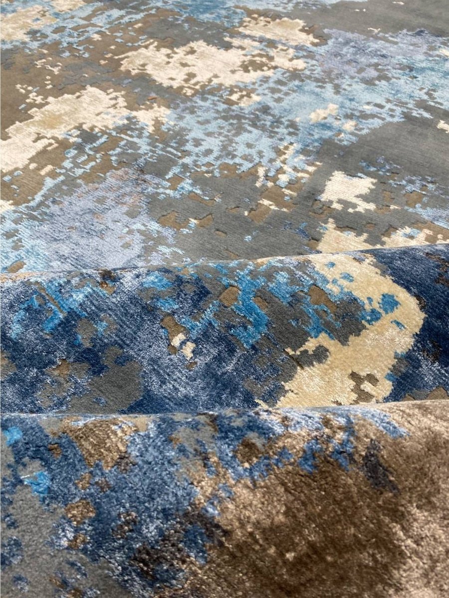 Add a touch of casual style to your home with this 9x12 Modern Abstract Area Rug, crafted in India. This modern rug features a captivating abstract pattern with a simple yet effective design in a soft beige, brown, blue, and charcoal palette. Its durable wool and bamboo silk construction ensures longevity and easy care, while the clean finish reflects quality craftsmanship and thoughtful design. This piece effortlessly brightens any interior, adding warmth, texture, and a relaxed feel. A perfect balance of style and function, it enhances a wide range of decor aesthetics. Enjoy free shipping across the United States, with each rug offering a distinct look through subtle variations inherent to its creation.