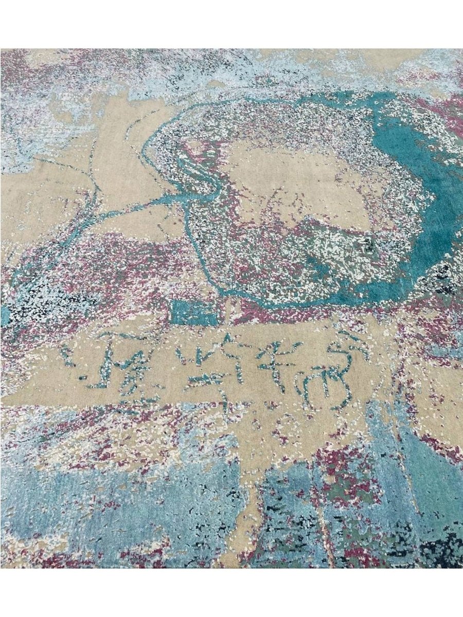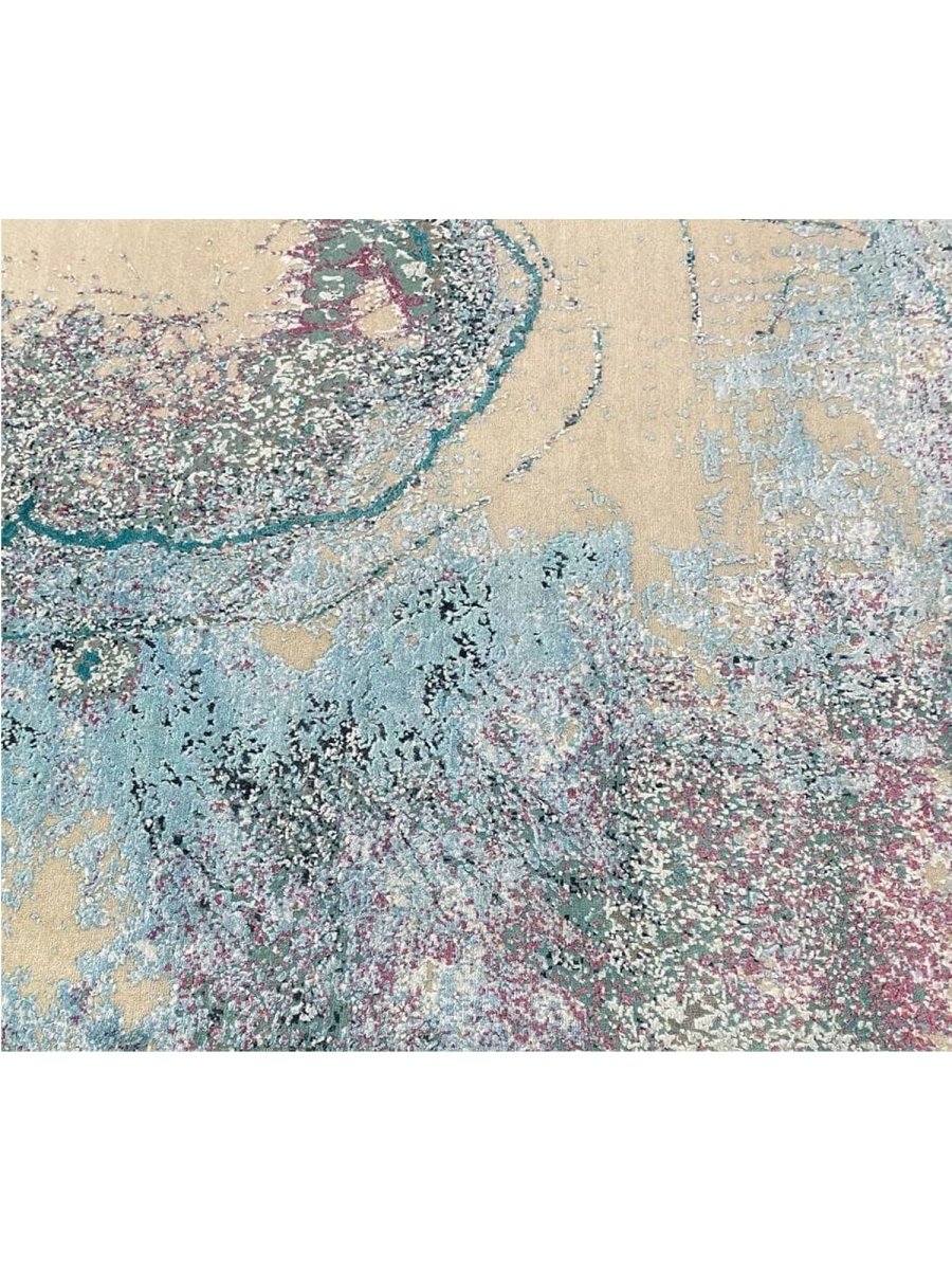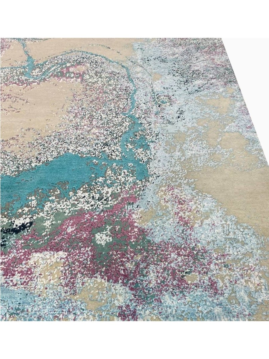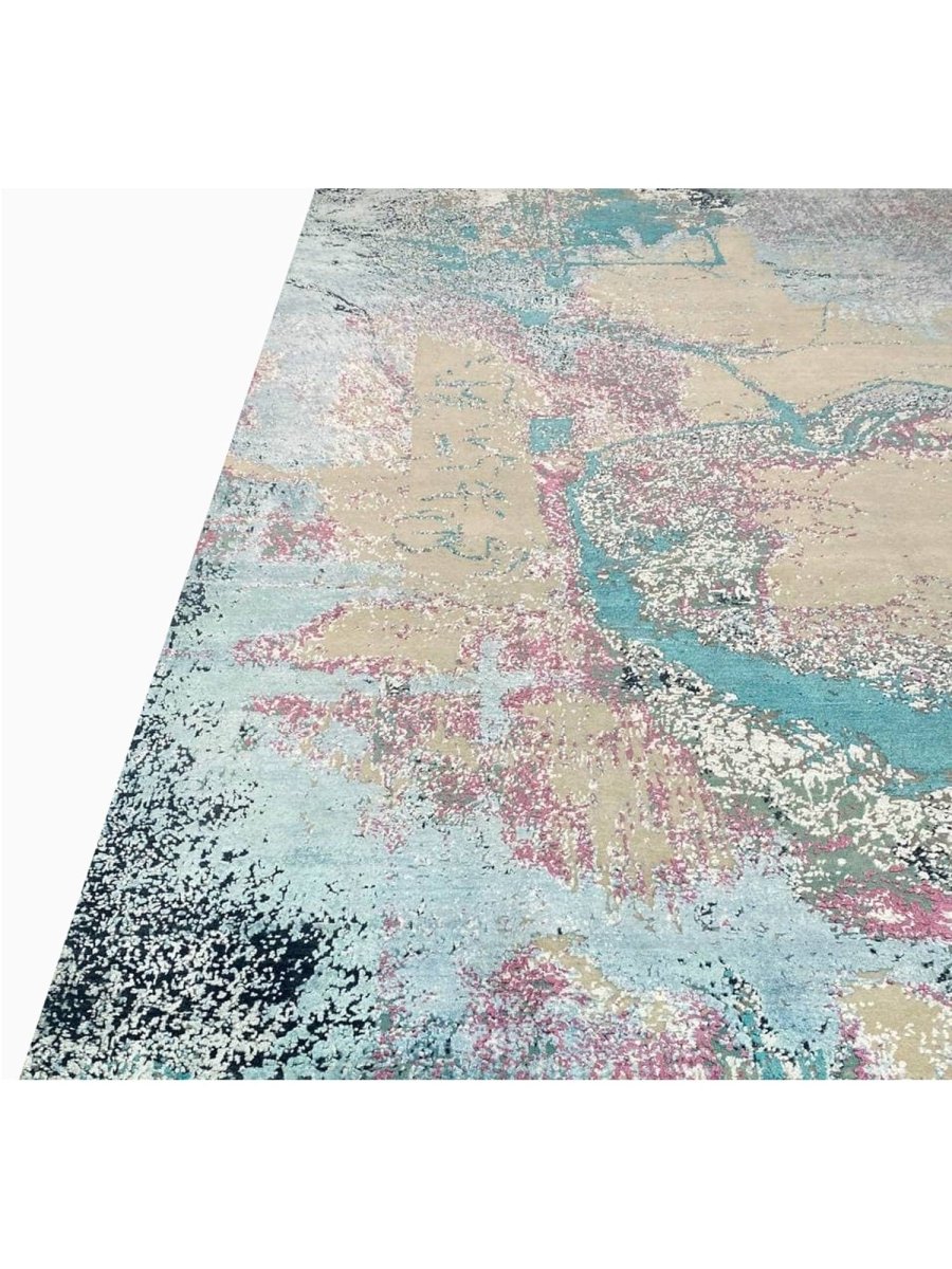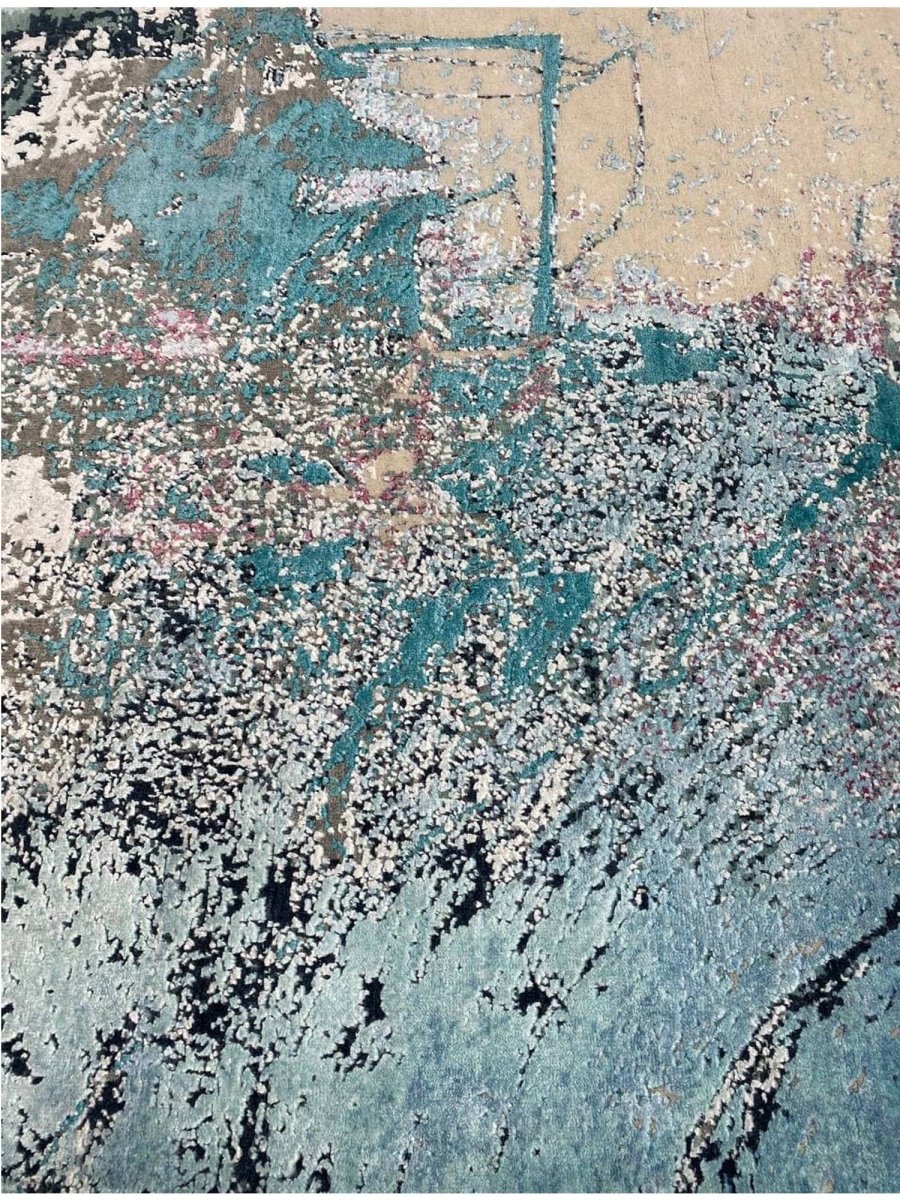 Make a bold artistic statement with this 9x12 modern abstract area rug, featuring a striking blend of beige, teal, soft blue-gray, sage green, black, and dusty rose tones. Its vibrant abstract pattern brings depth and personality to any space, creating a visually captivating focal point. Crafted from premium-quality fibers, this rug is hand-knotted from wool and bamboo silk, offering a soft, durable surface underfoot.