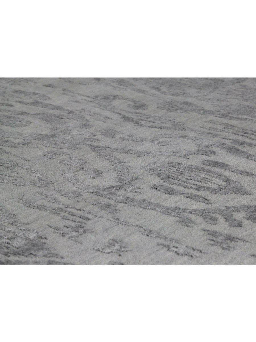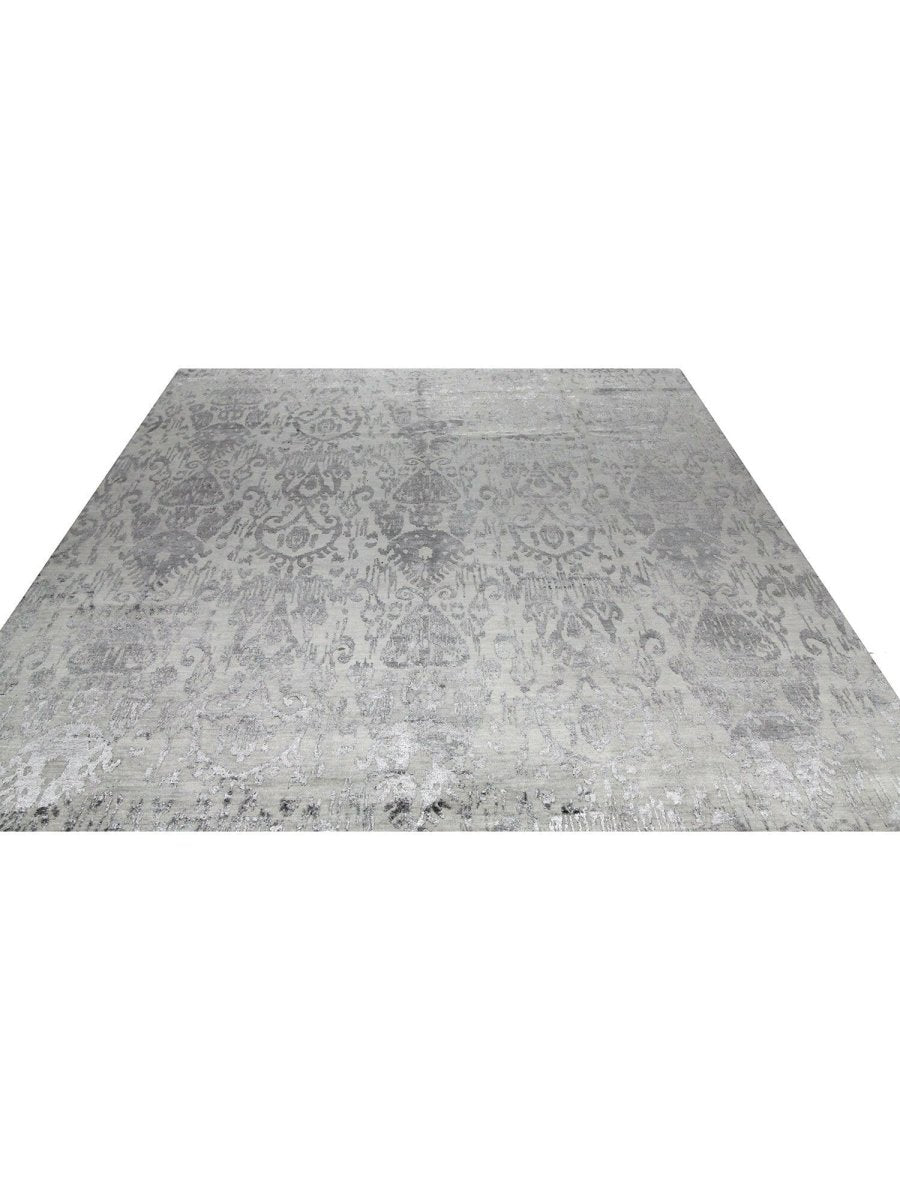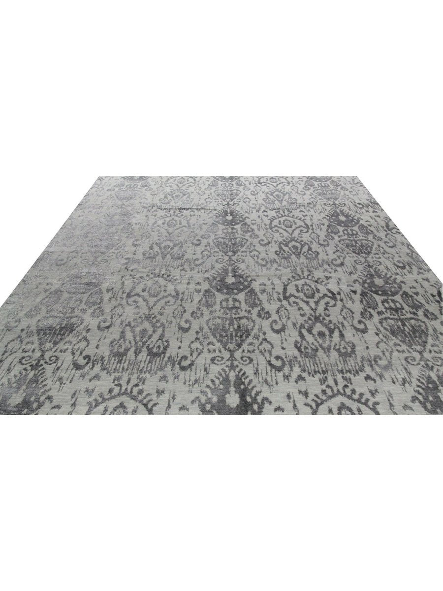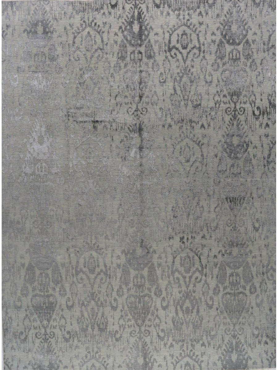 Immerse your space in the intricate beauty of this magnificent 9x12 Modern Ikat Area Rug. Hand-knotted by skilled artisans in India from a luxurious blend of premium wool and bamboo silk, this new rug offers a soft underfoot feel and exceptional durability. The captivating Ikat geometric pattern features stylized, repeating motifs with a distinct geometric influence, presented in harmonious blends of gray and silver, creating a visually compelling and artistic statement that effortlessly enhances any room. This versatile rug seamlessly integrates into various decor styles, adding a touch of refined artistry to your home. This hand-knotted rug is a true testament to the skilled artistry of Indian weaving, promising to be a cherished element that elevates the aesthetic and comfort of your home.