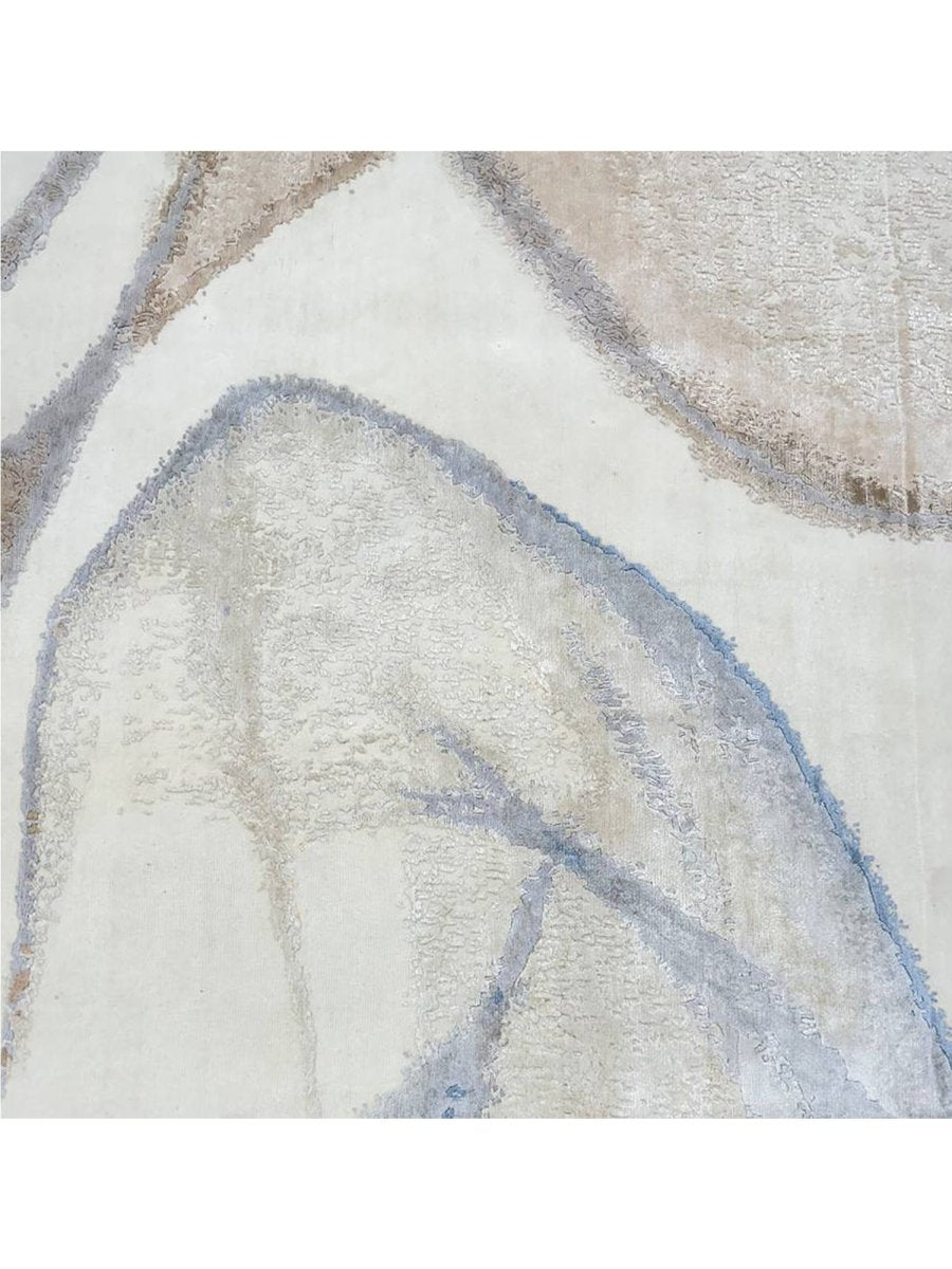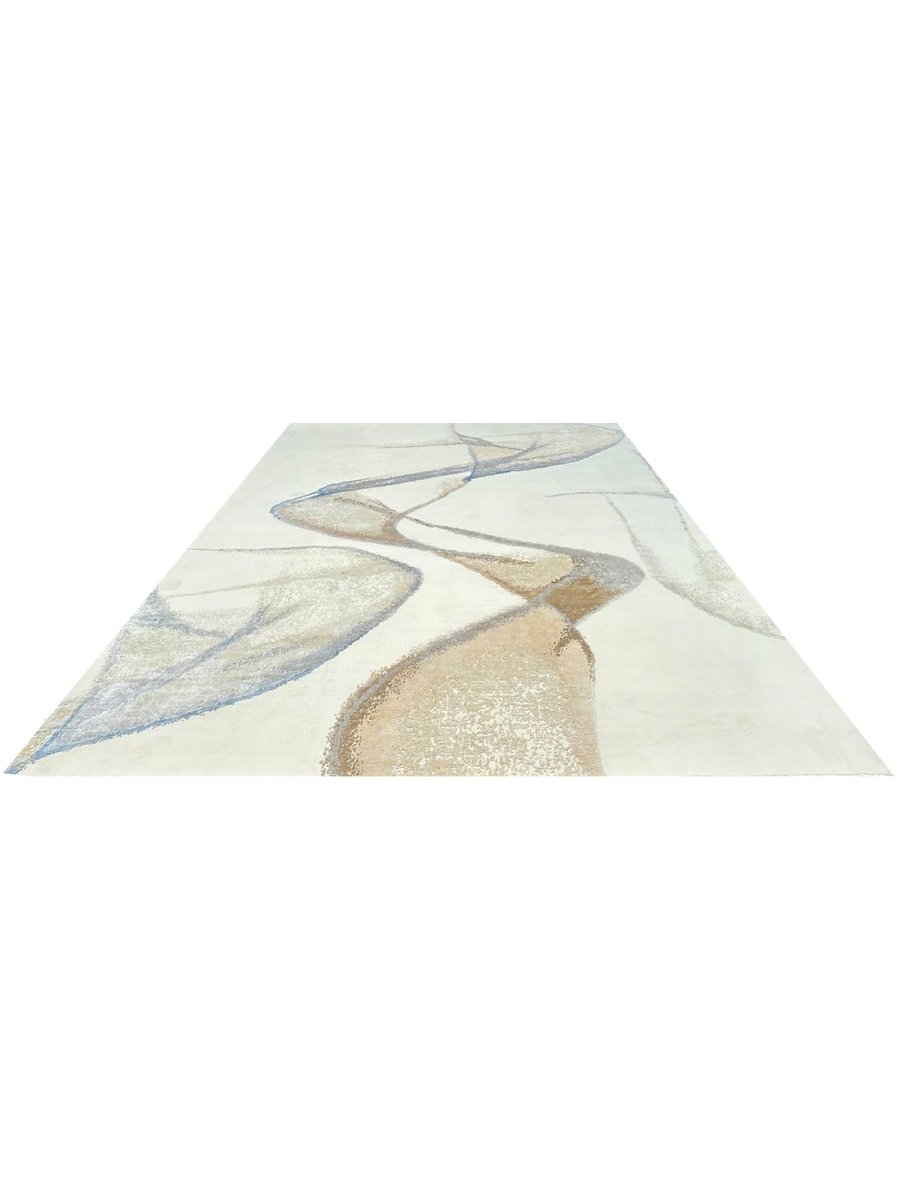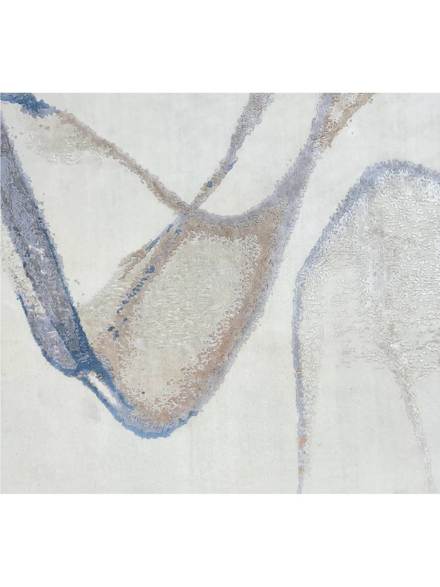 Immerse your space in the unique artistry of this magnificent 10x14 modern abstract area rug. Hand-knotted in India, this piece showcases exceptional craftsmanship and a distinct artistic vision. The intriguing abstract pattern features flowing lines and organic shapes set against a pristine white ground, accented with subtle shades of light blue and brown for a visually engaging yet serene aesthetic.