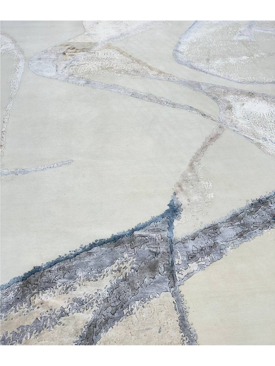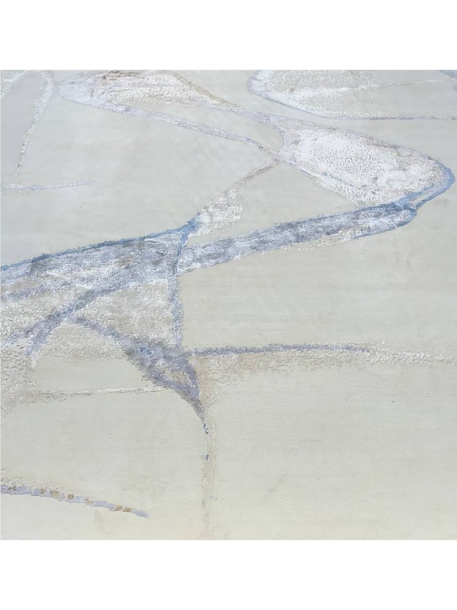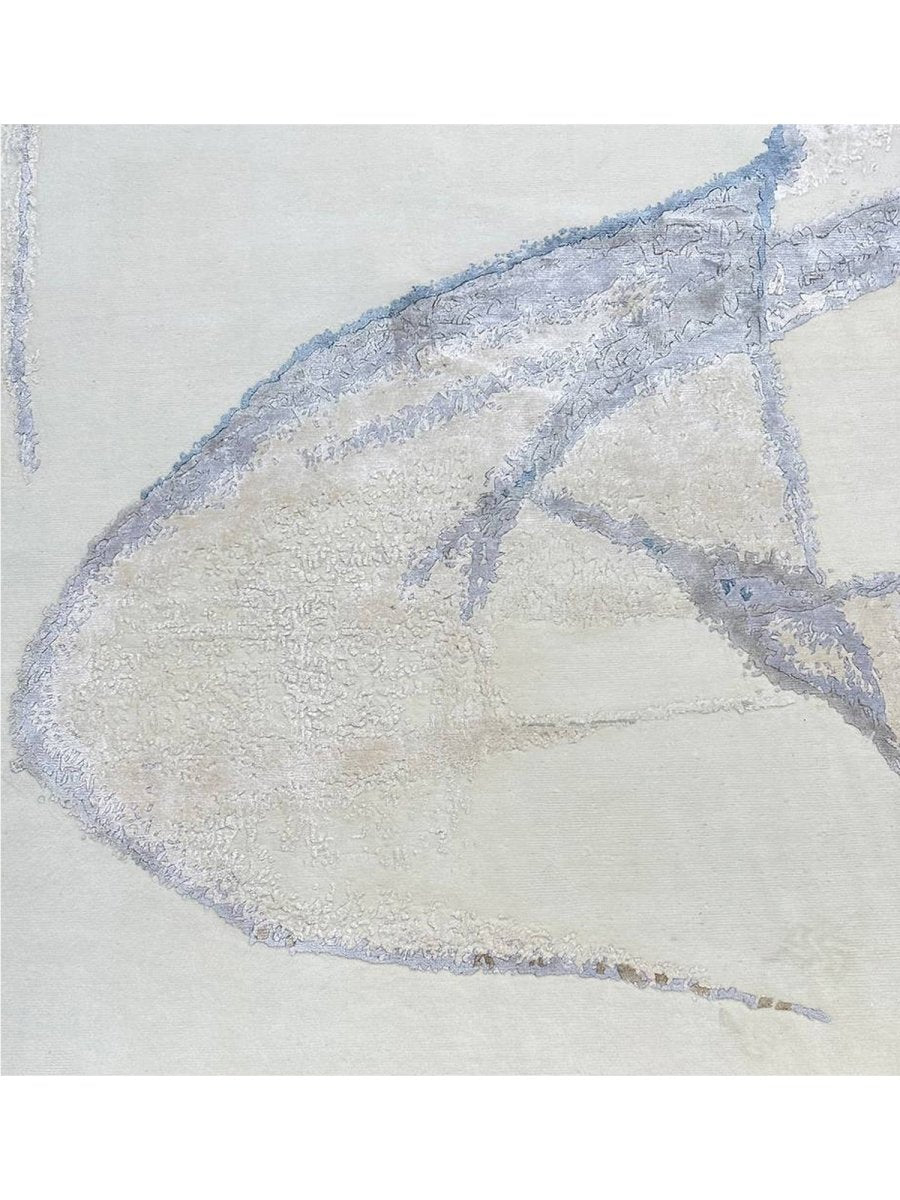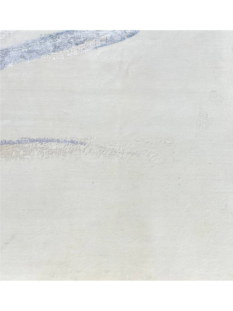 Immerse your space in the unique artistry of this magnificent 10x14 modern abstract area rug. Hand-knotted in India, this piece showcases exceptional craftsmanship and a distinct artistic vision. The intriguing abstract pattern features flowing lines and organic shapes set against a pristine white ground, accented with subtle shades of light blue and brown for a visually engaging yet serene aesthetic.