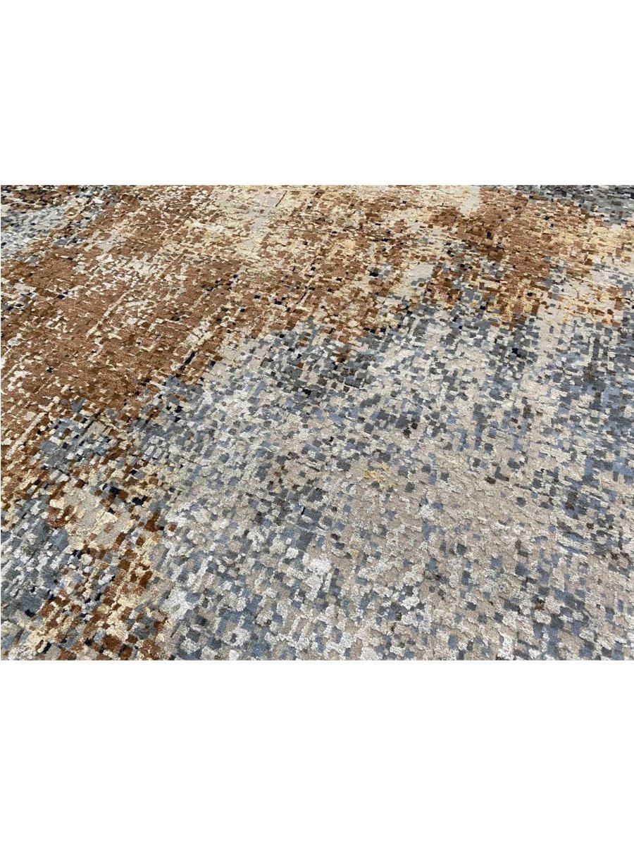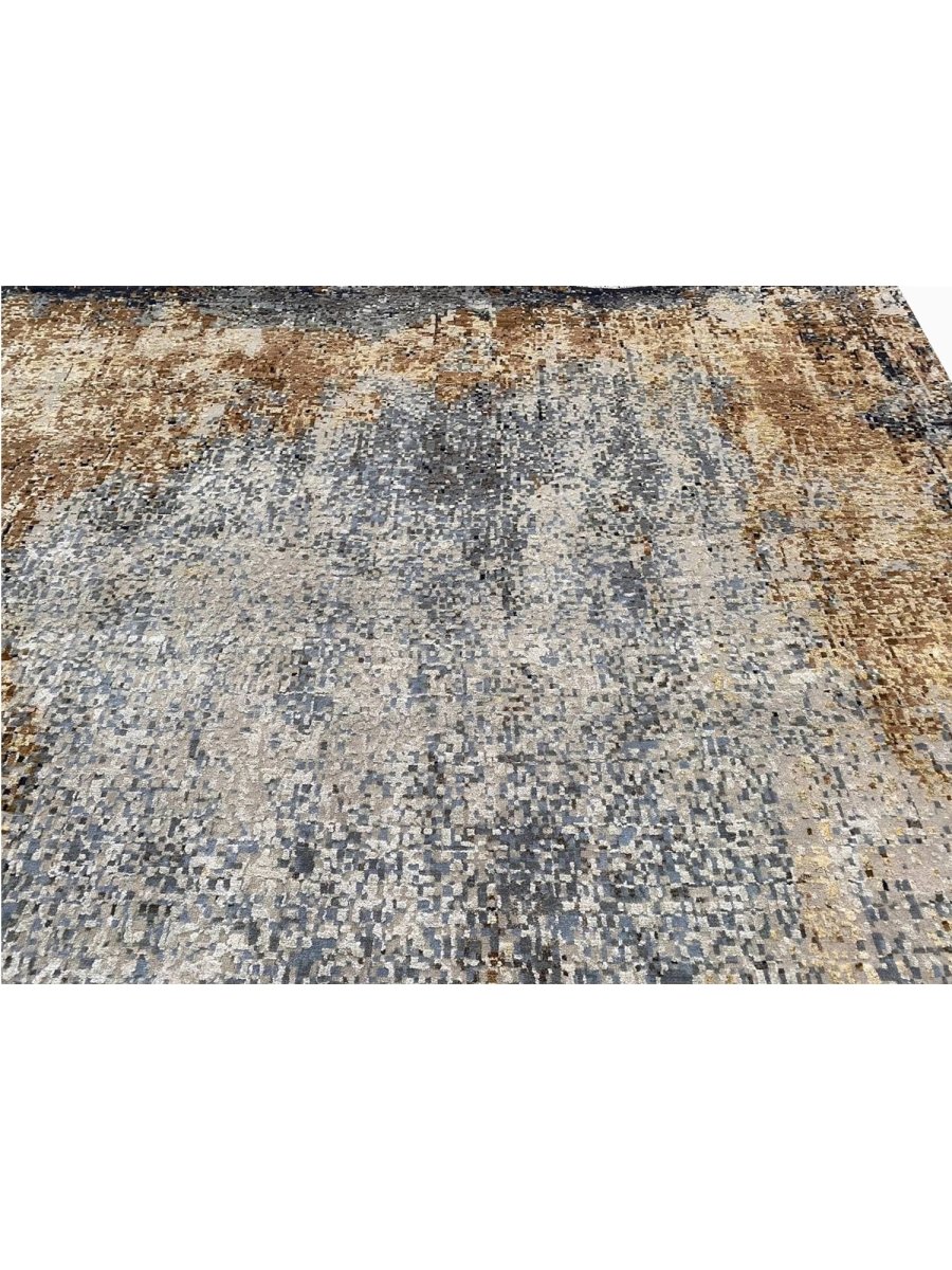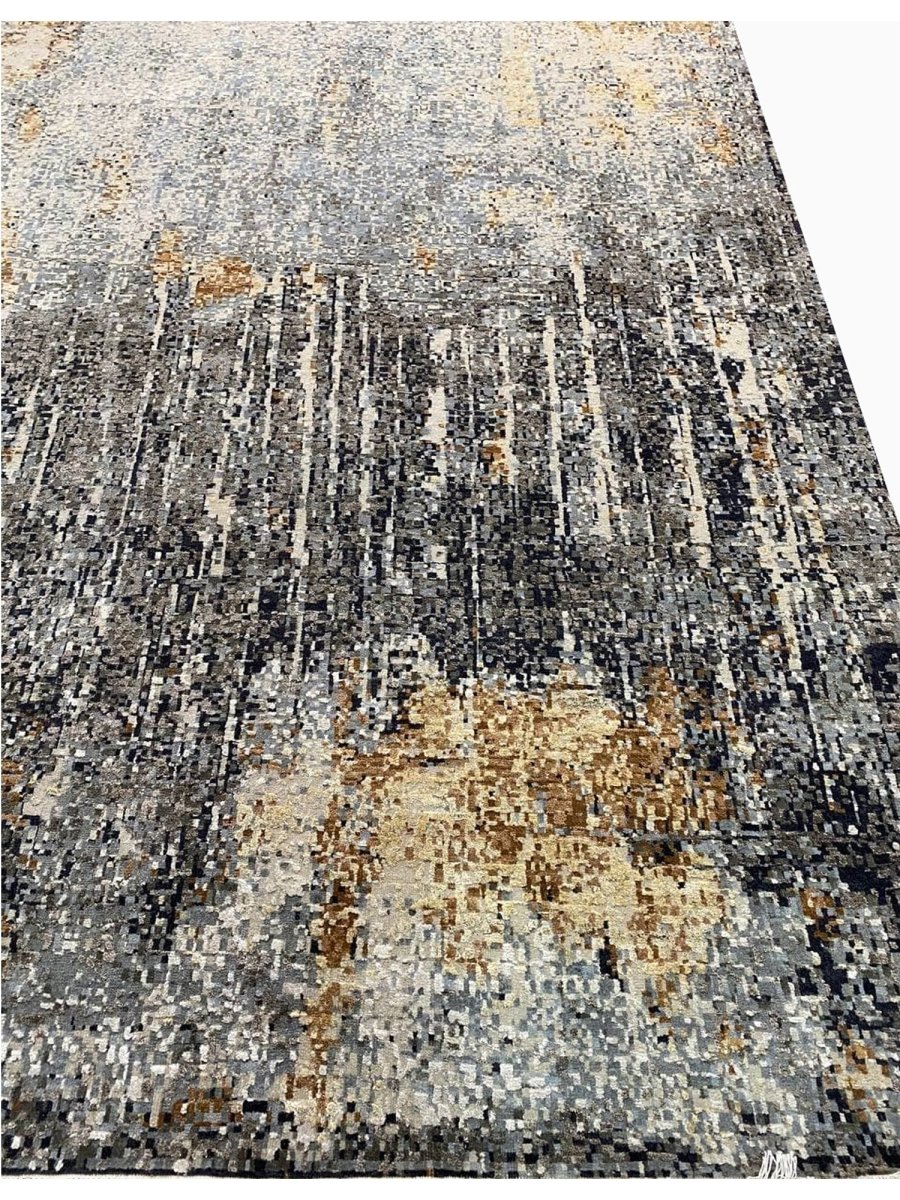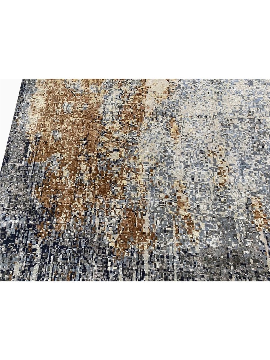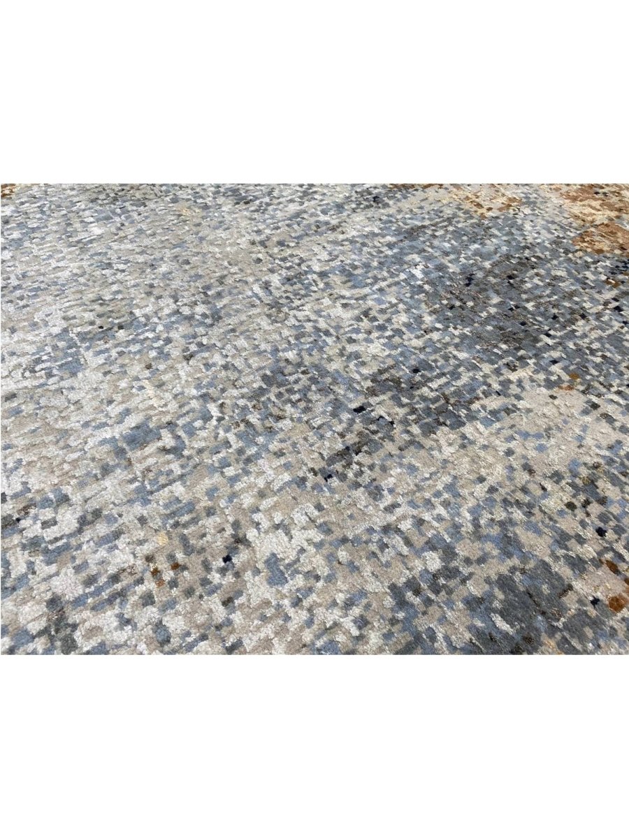 The 10x14 Modern Abstract Area Rug is a unique treasure that embodies the rich history of Indian weaving. Made from high-quality wool and bamboo silk, this exquisite rug features an abstract design that seamlessly complements any interior style. Its striking blend of gray, blue, charcoal, beige, brown, and ivory adds depth and character, creating a warm and inviting atmosphere. This versatile piece is a multipurpose addition to any space, serving as both a functional floor covering and a stunning work of art that elevates your home. Enjoy the elegance and craftsmanship of this hand-knotted rug, with free U.S. delivery included.