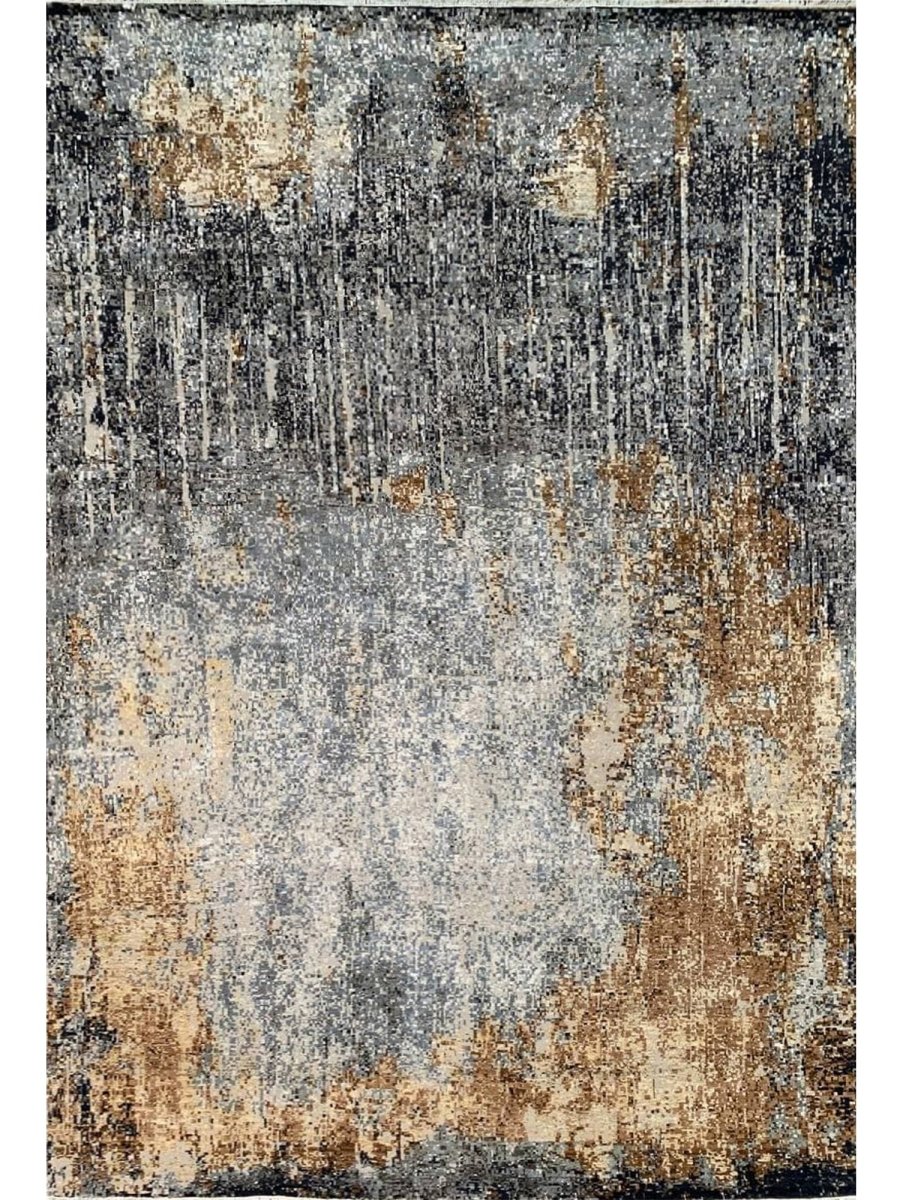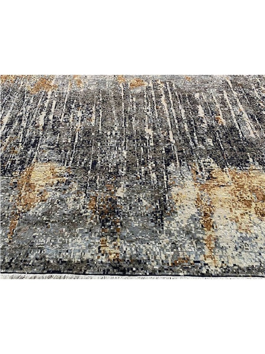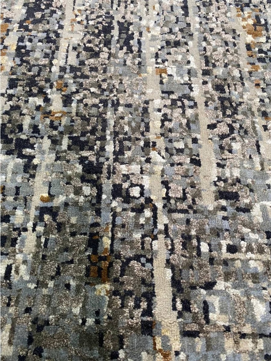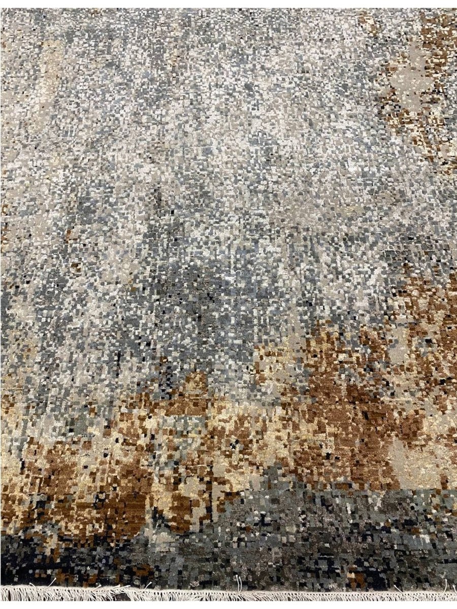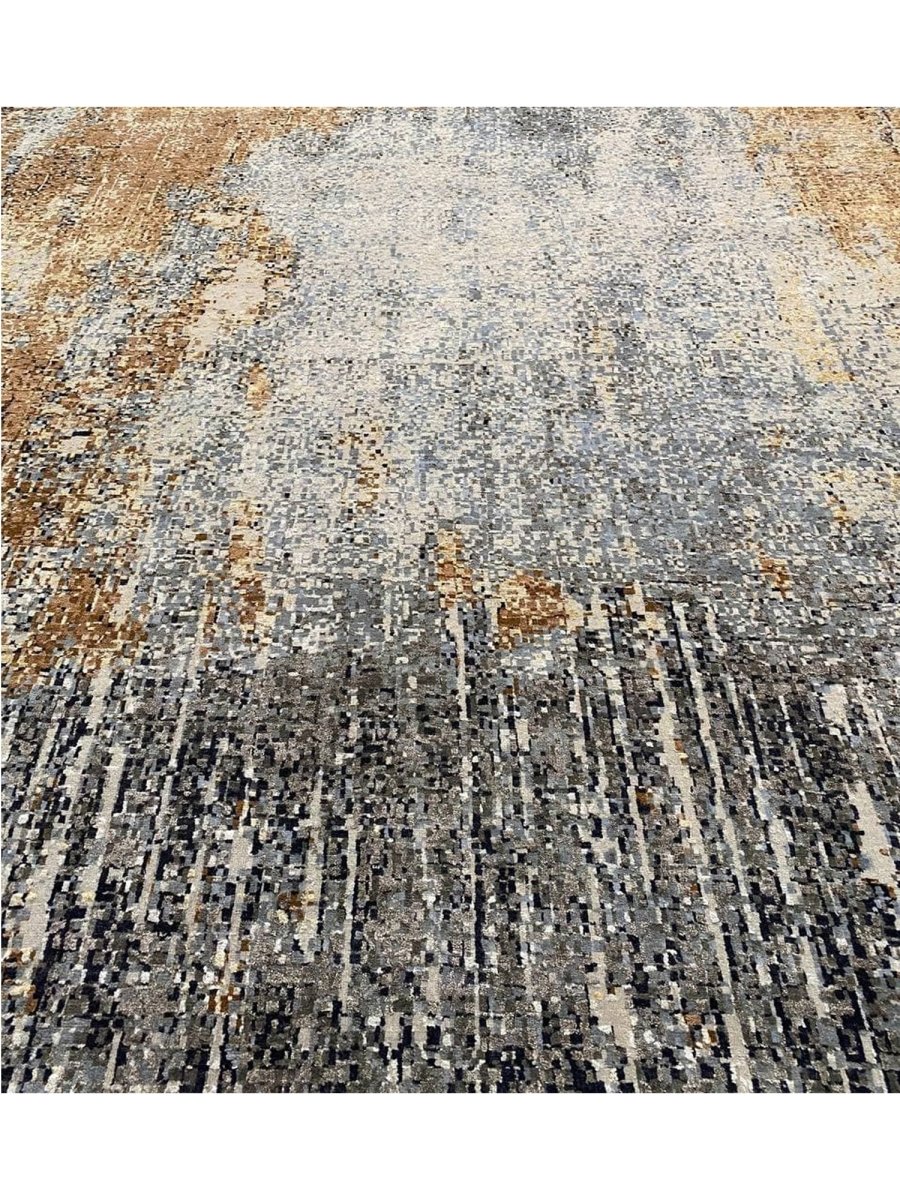 The 10x14 Modern Abstract Area Rug is a unique treasure that embodies the rich history of Indian weaving. Made from high-quality wool and bamboo silk, this exquisite rug features an abstract design that seamlessly complements any interior style. Its striking blend of gray, blue, charcoal, beige, brown, and ivory adds depth and character, creating a warm and inviting atmosphere. This versatile piece is a multipurpose addition to any space, serving as both a functional floor covering and a stunning work of art that elevates your home. Enjoy the elegance and craftsmanship of this hand-knotted rug, with free U.S. delivery included.