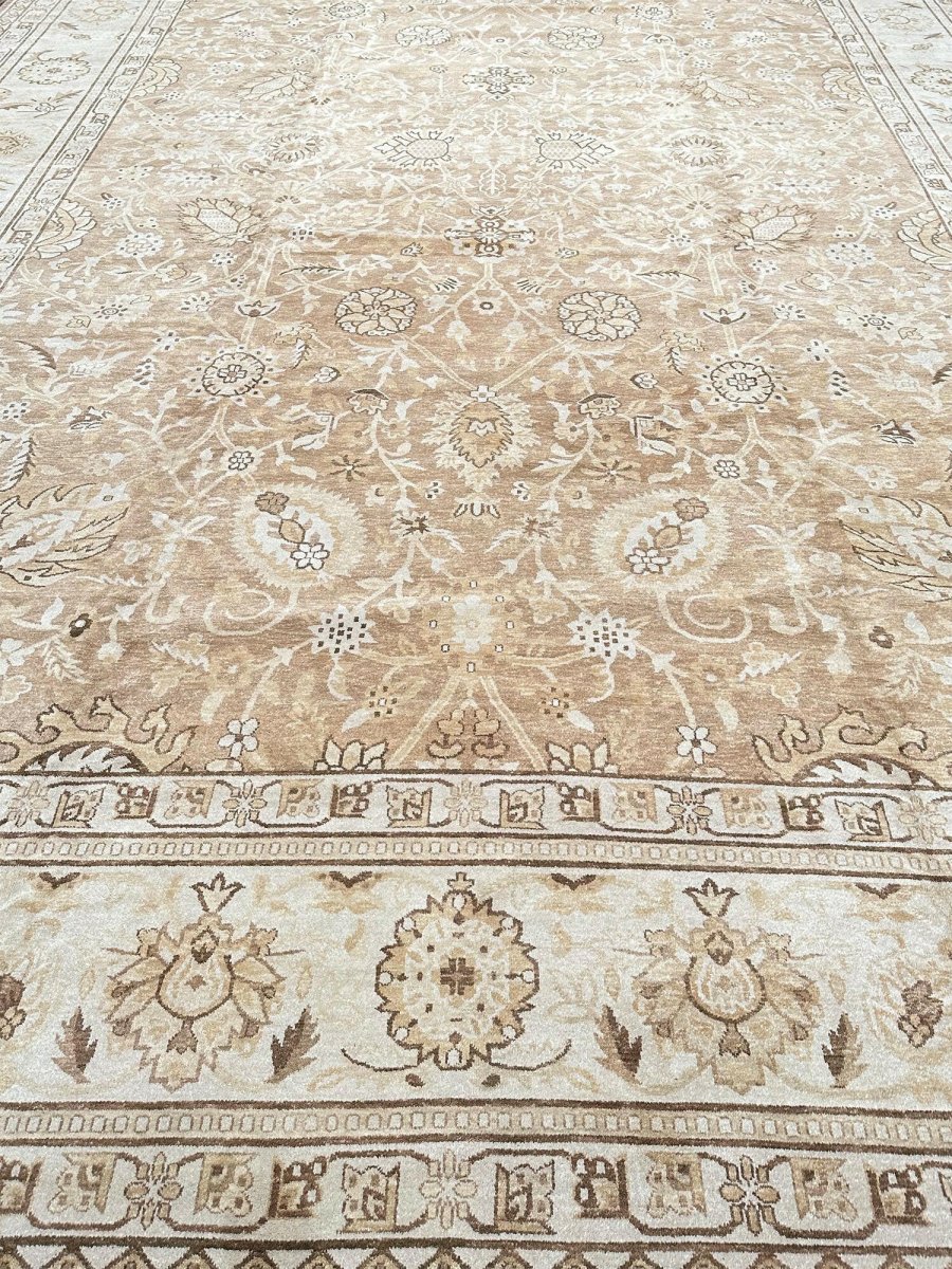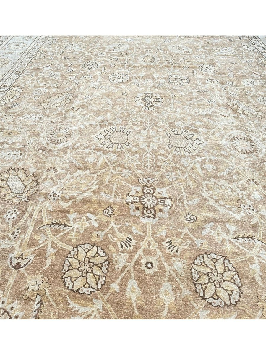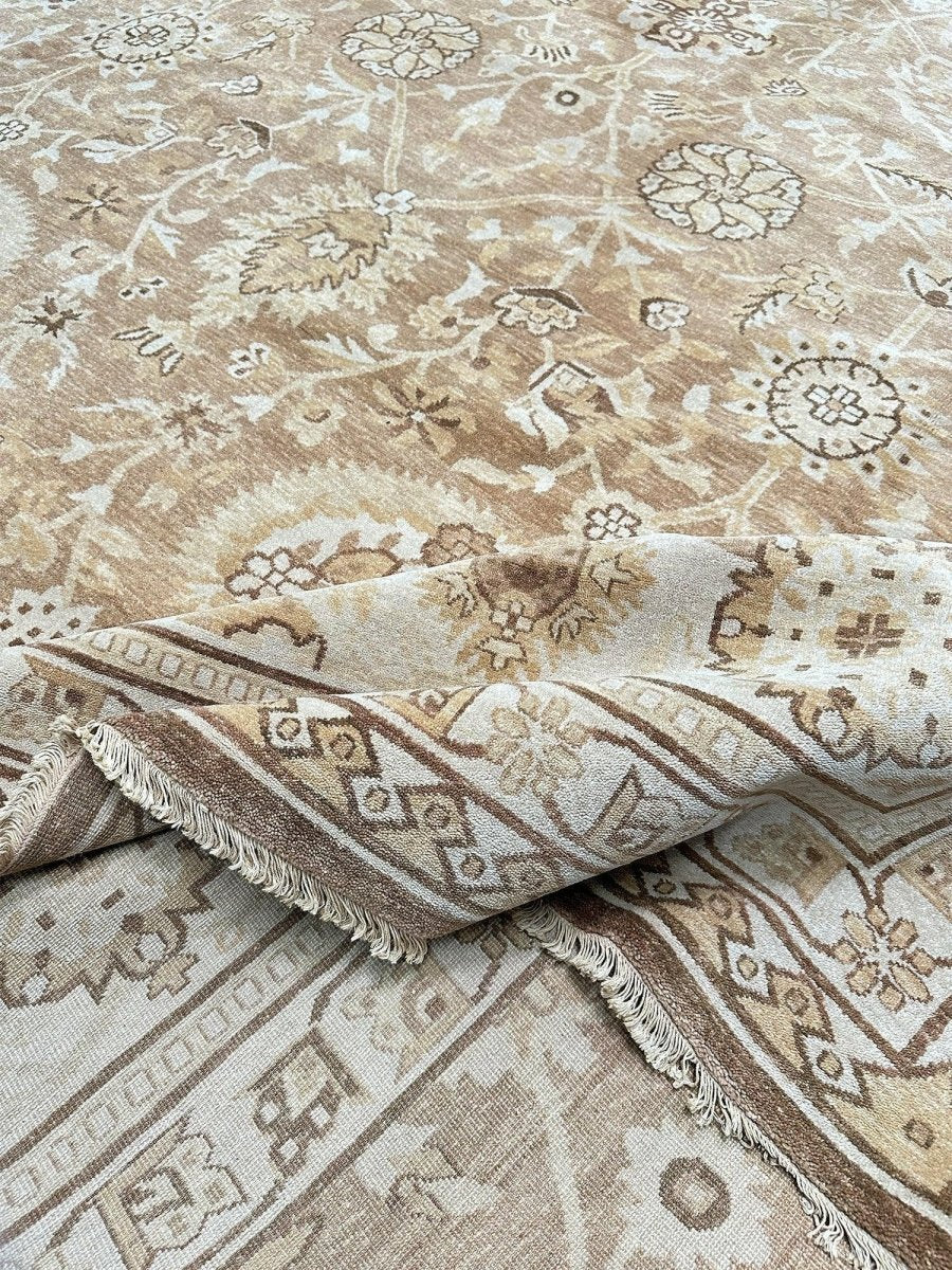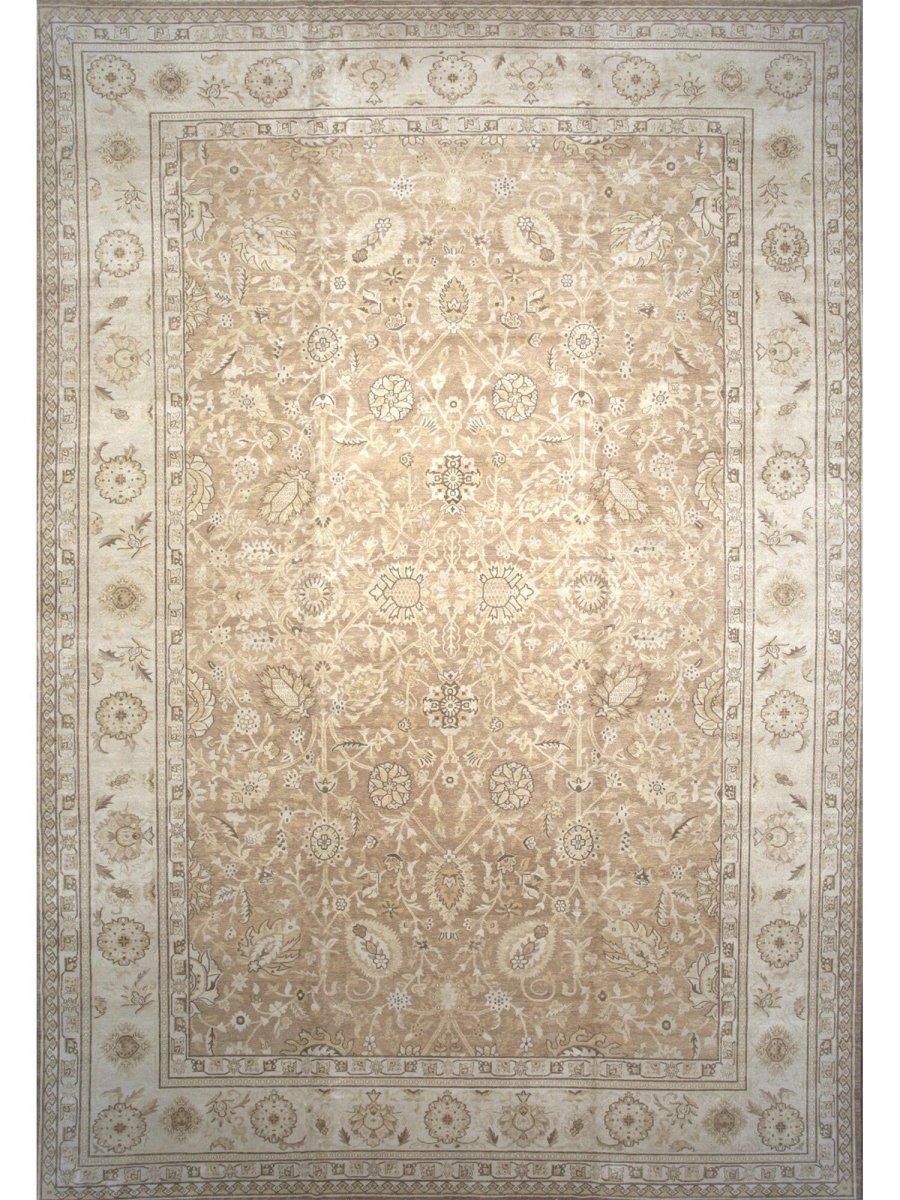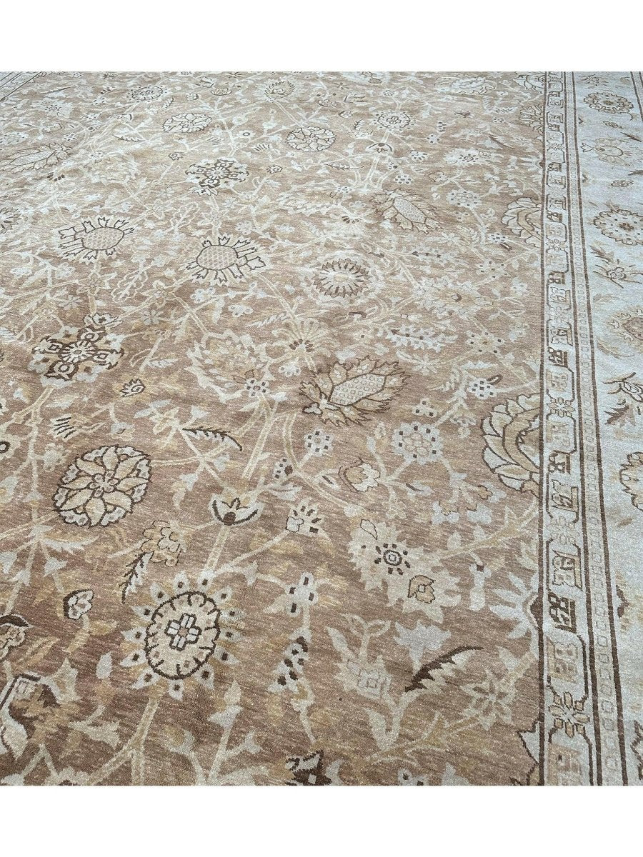 Command attention in your grand space with this magnificent 14x20 Mahal Style area rug, expertly hand-knotted in China. This large rug features a captivating all-over pattern that spans its vast surface, bringing intricate design and sophisticated texture. Reflecting classic Mahal aesthetics, the repeating motifs create a sense of continuous beauty. The field and border are rendered in a beautiful palette of light beige and tan, providing a warm and inviting foundation. The all-over pattern details are picked out in subtly darker shades of beige and brown, adding depth without overwhelming the serene feel. This substantial 14x20 size is perfect for anchoring the largest living rooms or expansive open areas, creating a truly luxurious statement. Enjoy free US shipping.