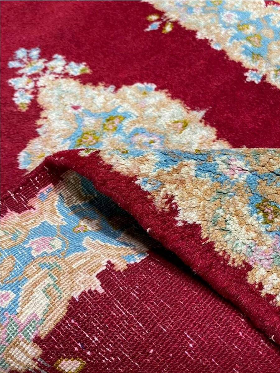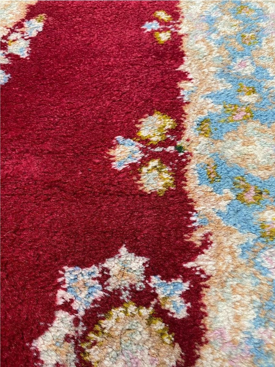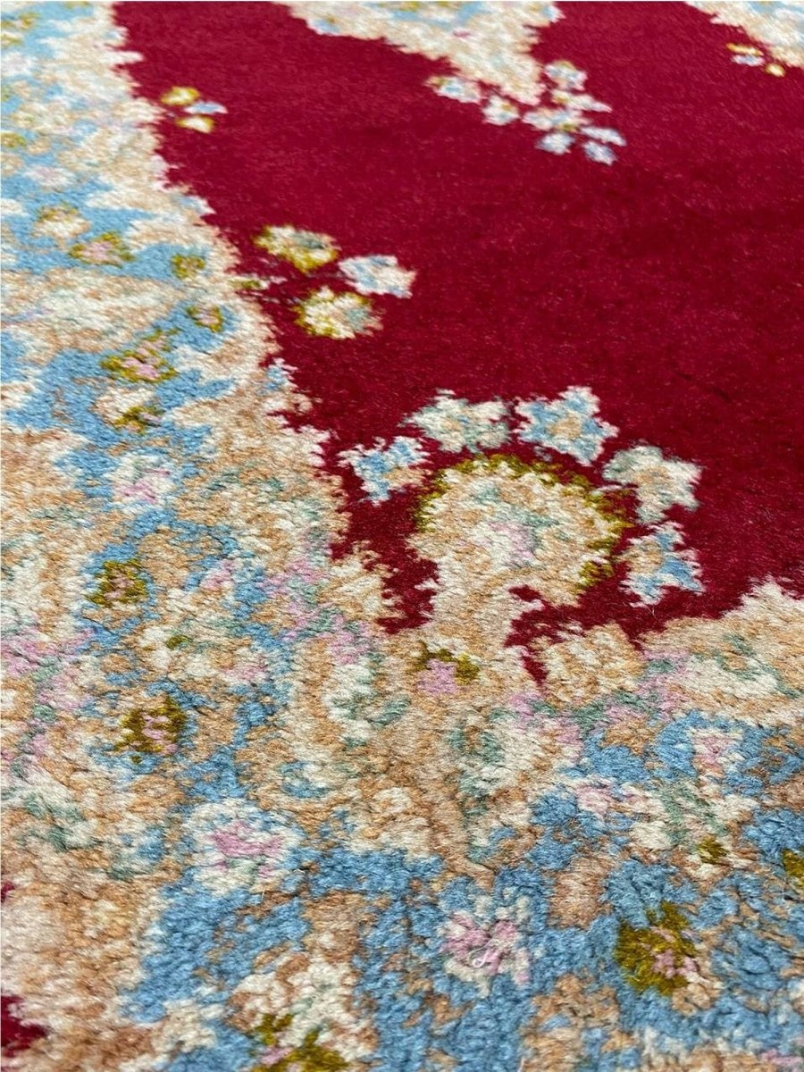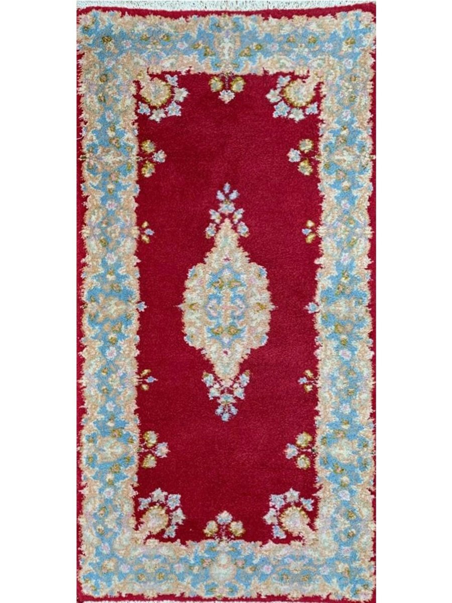 Uncover the charming beauty of this 2x4 Old Persian Kerman area rug. Hand-knotted in Persia, this small rug features a striking central medallion pattern. Intricately detailed medallion set against a vibrant red field, creating a bold and beautiful backdrop. Field adorned with delicate floral motifs around a medallion. A contrasting border surrounds the rug, featuring shades of soft light blue, warm beige, hints of yellow, and crisp white, complementing the central design. Colors within the medallion, floral patterns echo those in the border, adding visual interest. Crafted with traditional techniques, likely fine wool, this rug offers lasting durability and a soft feel underfoot Enjoy free US shipping.