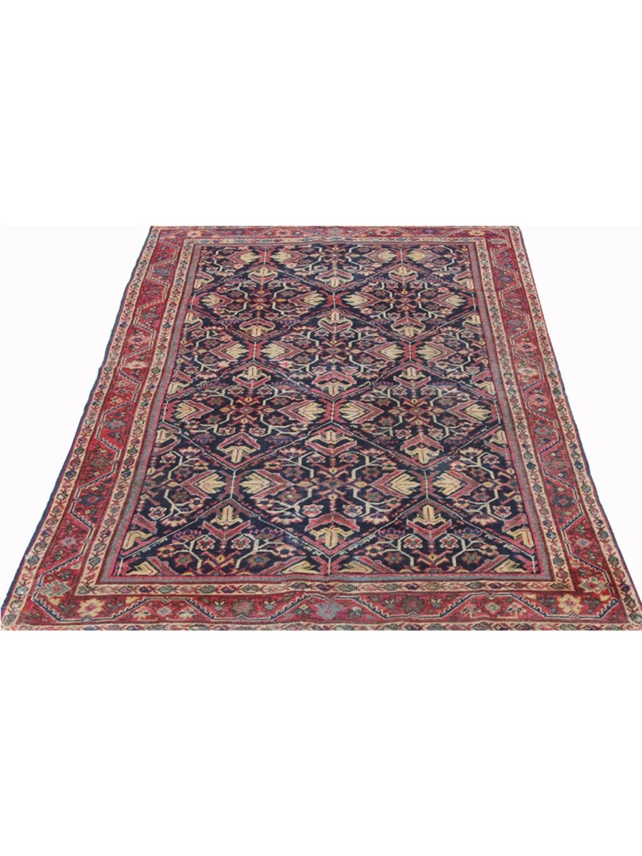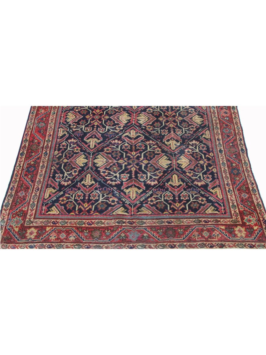 Introduce charm with this 4x7 Antique Persian Mahal area rug. Hand-knotted in Persia, this beautiful rug features a captivating geometric pattern across its surface. The intricate design of repeating shapes and motifs brings traditional artistry. The field is a rich, deep navy blue, providing a striking contrast to patterns. Geometric motifs within the pattern are colored with a palette that includes red, pink, warm gold, soft beige, light blue, and green, adding visual complexity. This versatile size fits well in entryways, bedrooms, or smaller seating areas, adding comfort and style. Crafted with traditional techniques and fine wool, this rug provides lasting durability and a soft, luxurious feel underfoot. Enjoy free US shipping.