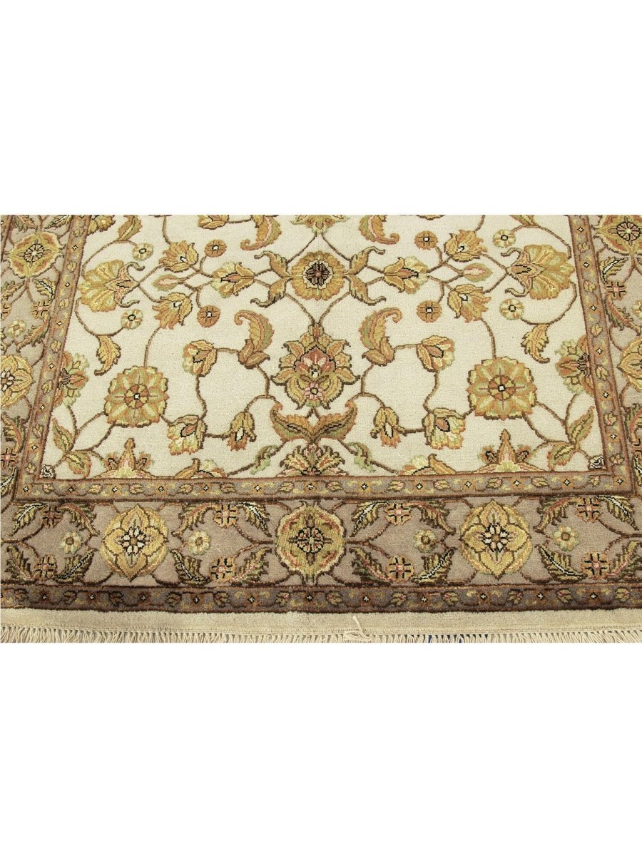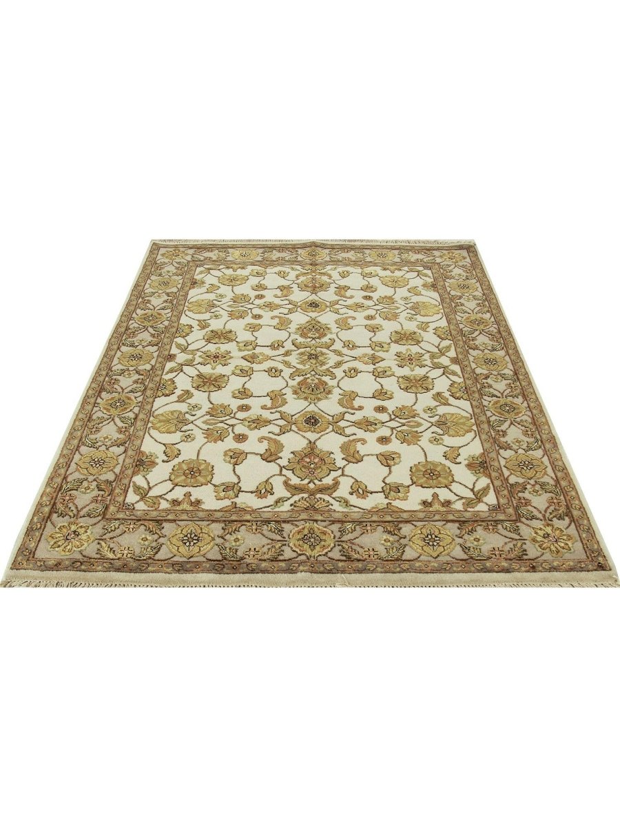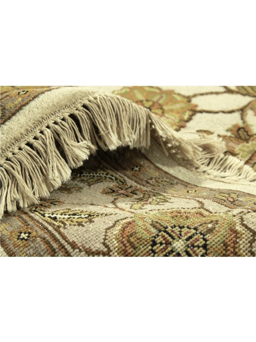 Add a touch of serene beauty to your home with this 5x7 Handwoven Tabriz Style Area Rug, crafted in India. This rug features a captivating geometric pattern showcasing traditional motifs, in a soft ivory, beige, and muted yellow palette. Its hand-knotted wool and silk construction ensures durability, lasting beauty, and is perfect for living rooms, bedrooms, and dining spaces. The intricate border detail reflects the artisan's skill and timeless design heritage. This piece effortlessly complements, adding warmth, texture, and sophistication. A true blend of artistry and function, it easily brings heritage charm into any space. Enjoy the benefit of free shipping across the United States. Each rug has one-of-a-kind subtle variations highlighting its handmade nature.