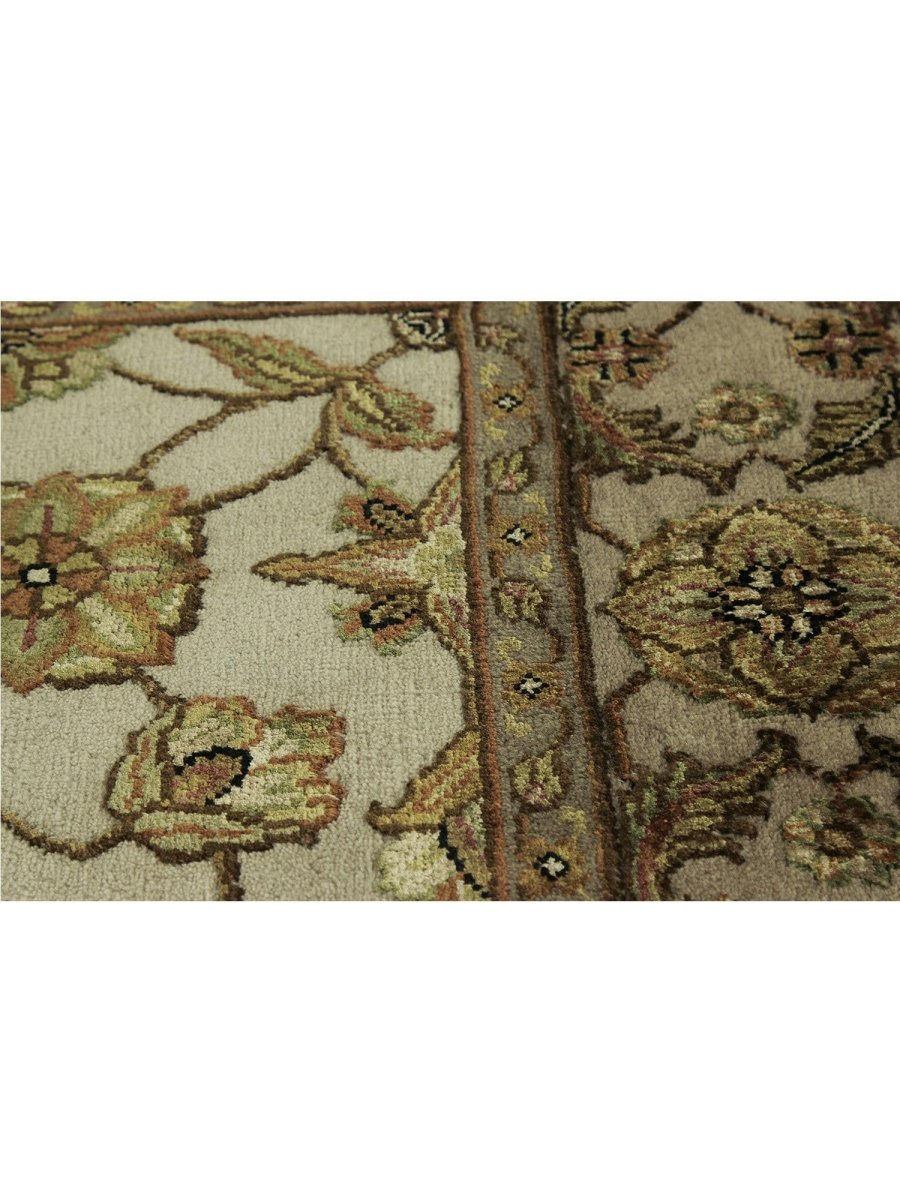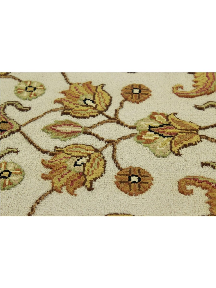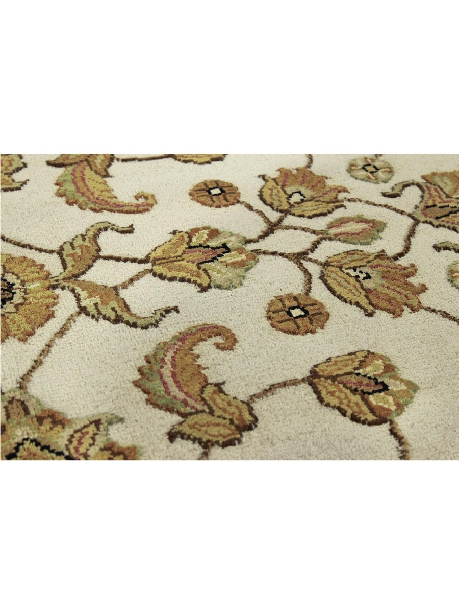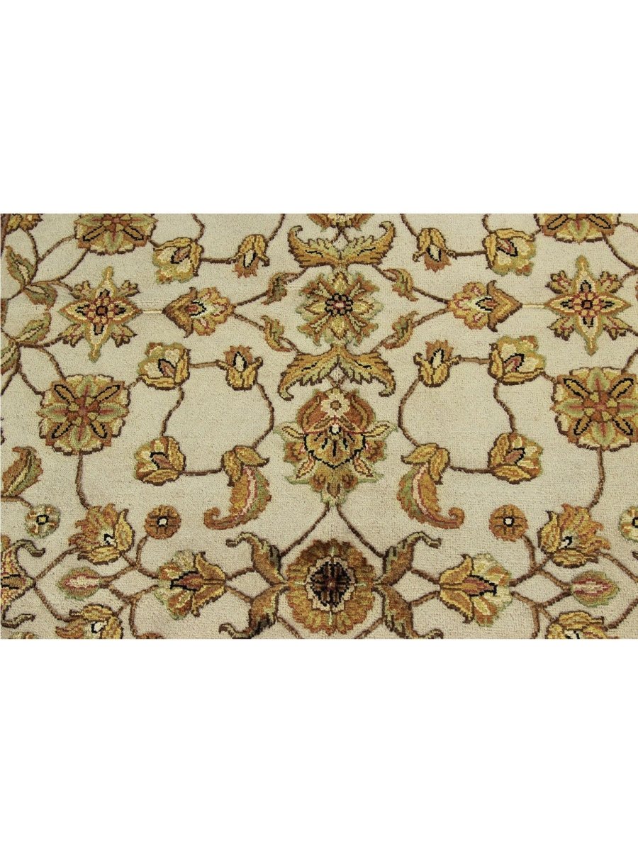Add a touch of serene beauty to your home with this 5x7 Handwoven Tabriz Style Area Rug, crafted in India. This rug features a captivating geometric pattern showcasing traditional motifs, in a soft ivory, beige, and muted yellow palette. Its hand-knotted wool and silk construction ensures durability, lasting beauty, and is perfect for living rooms, bedrooms, and dining spaces. The intricate border detail reflects the artisan's skill and timeless design heritage. This piece effortlessly complements, adding warmth, texture, and sophistication. A true blend of artistry and function, it easily brings heritage charm into any space. Enjoy the benefit of free shipping across the United States. Each rug has one-of-a-kind subtle variations highlighting its handmade nature.