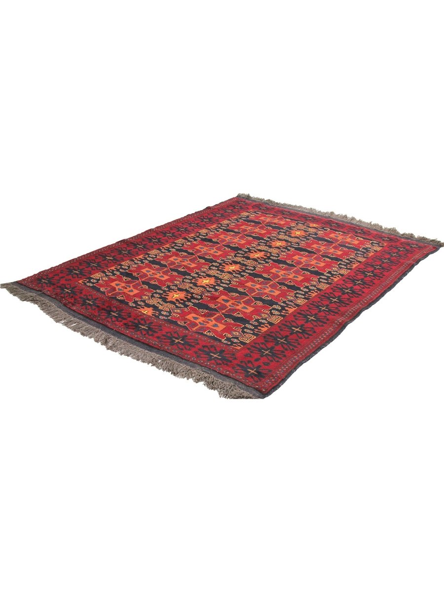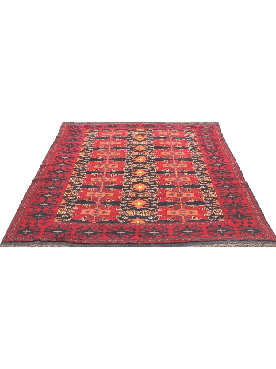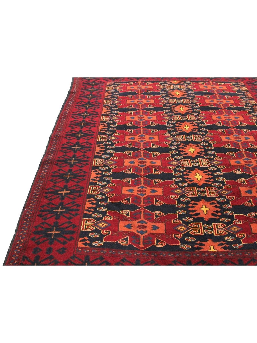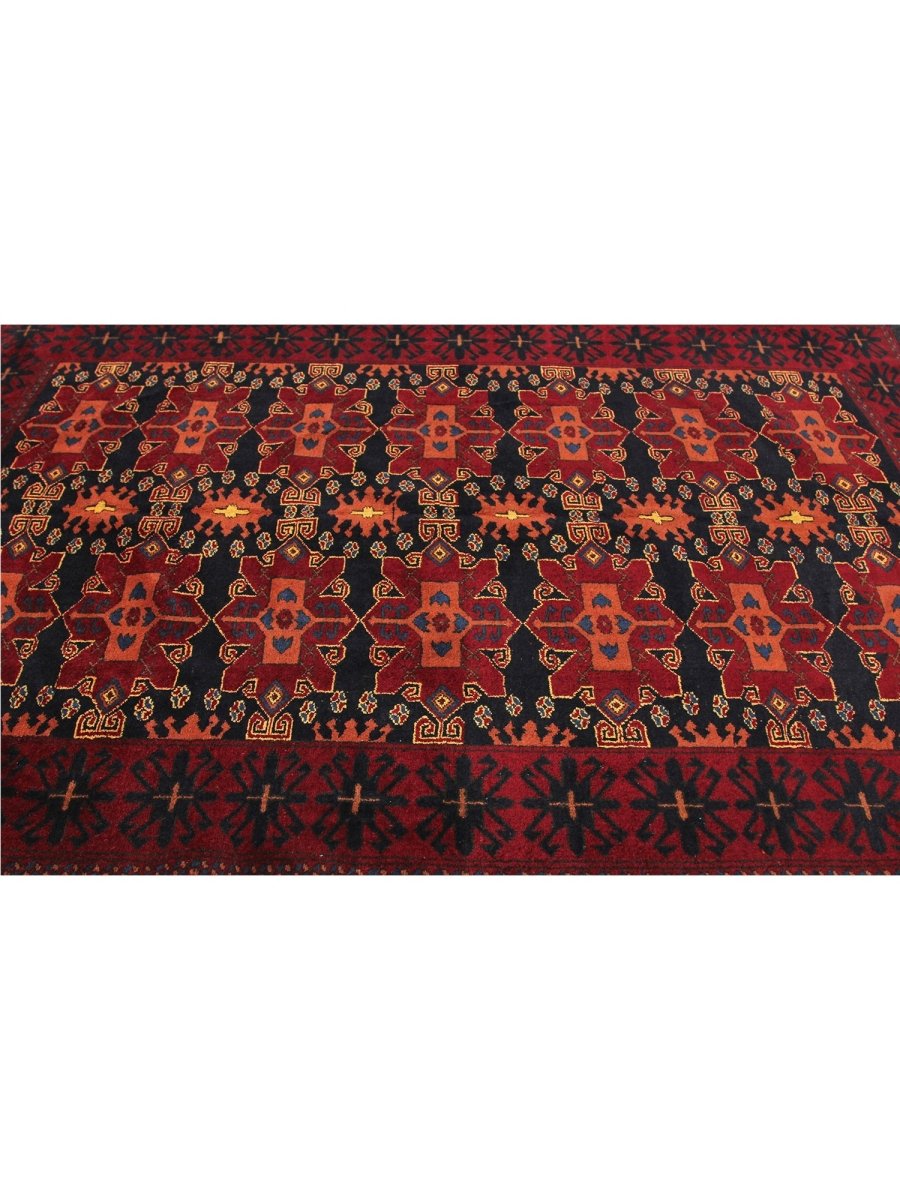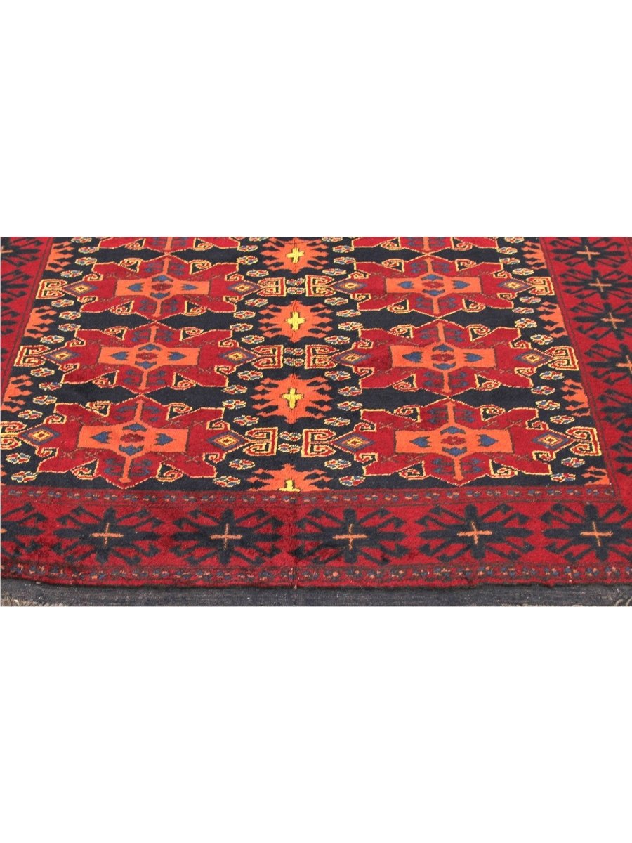Decorate your space with this exquisite 5x6 Old Afghani Area Rug. Hand-knotted in Afghanistan, this exceptional rug features a classic geometric and an intricate pattern. The field is rich, with a deep red hue, providing a luxurious and vibrant backdrop. The complex border frame composition is beautifully featured, showcasing shades of black, peach, and ivory. Crafted with meticulous hand-knotting of fine wool, this rug provides lasting durability and a soft, luxurious feel underfoot. This traditional rug is a testament to enduring artistry. Enjoy free US shipping.
