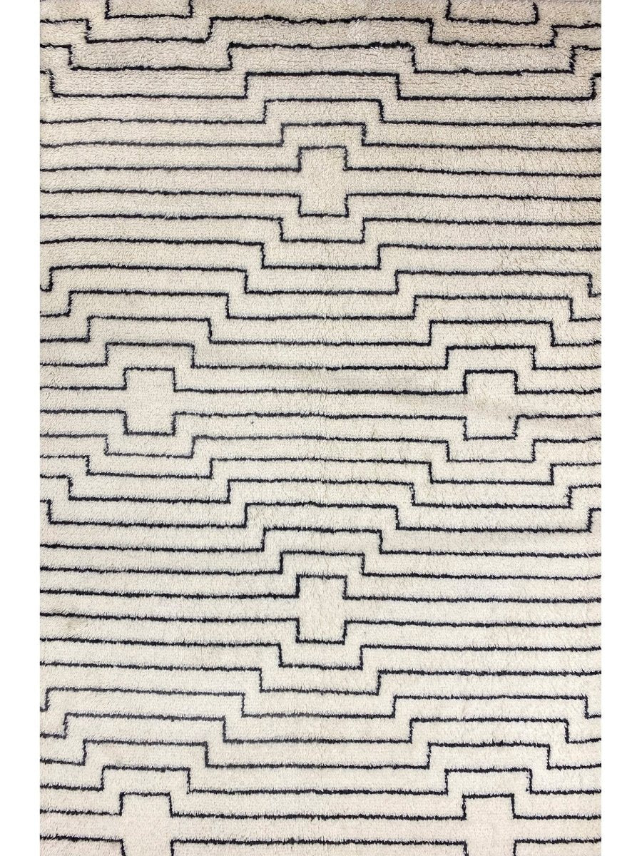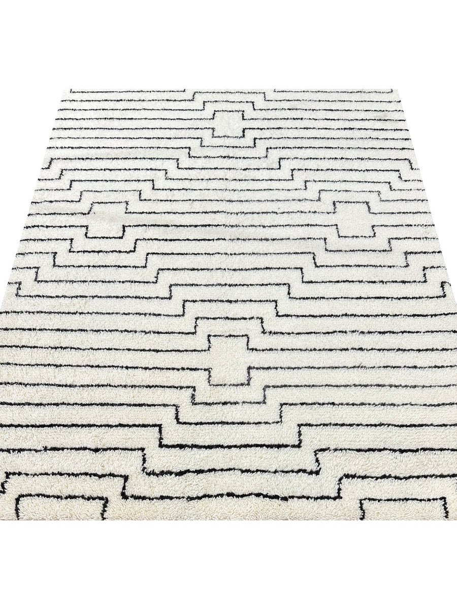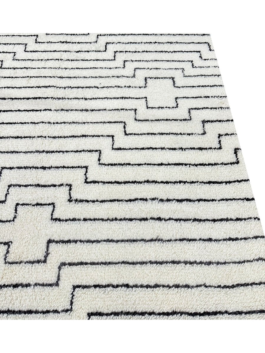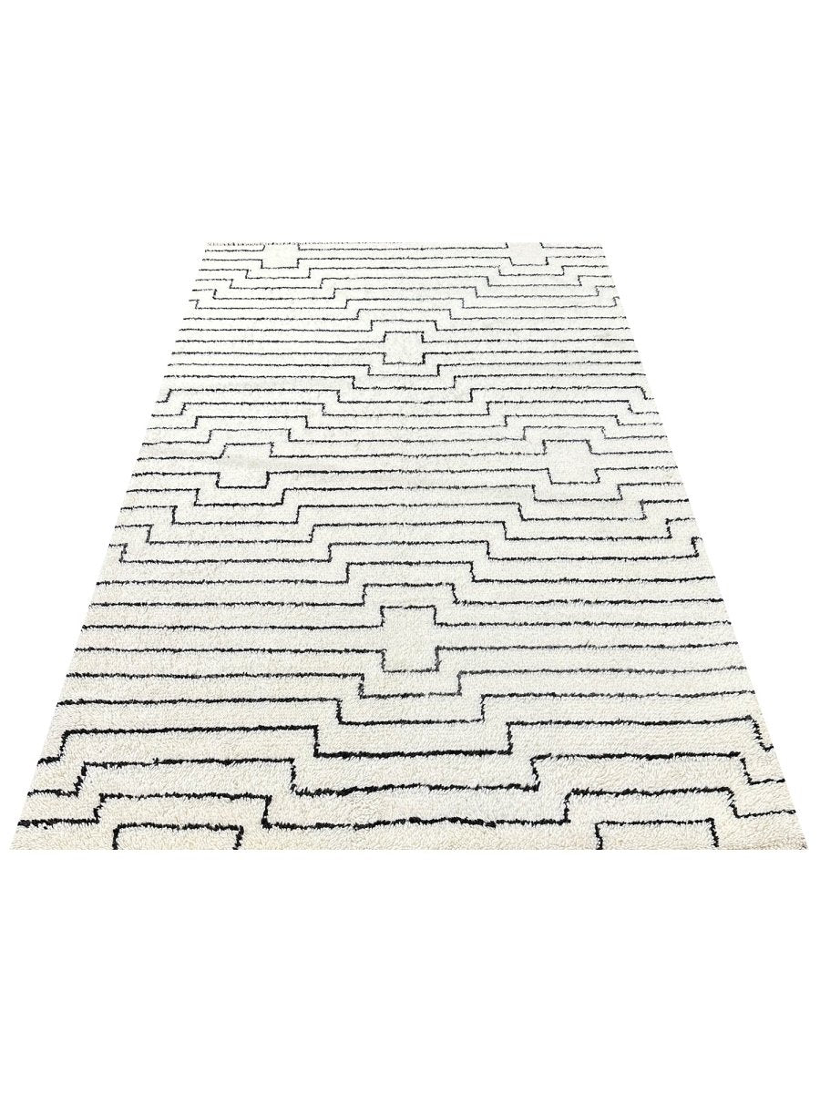 Add a touch of casual style to your home with this 5x8 Moroccan-style area rug, crafted in India. This rug features a captivating geometric pattern, showcasing a simple yet effective design in a soft ivory and black palette. Its durable wool construction ensures longevity and easy care, perfect for small living rooms, under coffee tables, and kids' rooms. The clean finish reflects quality craftsmanship and design. This piece effortlessly brightens, adding warmth, texture, and a relaxed feel. A blend of simple design and function, it easily enhances any space. Enjoy the benefit of free shipping across the United States. Each rug offers a distinct look, with subtle variations inherent to its creation.