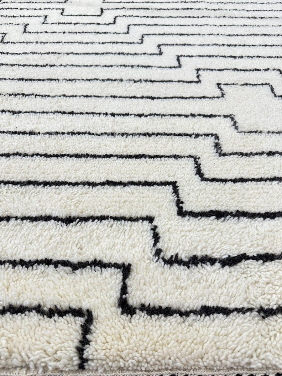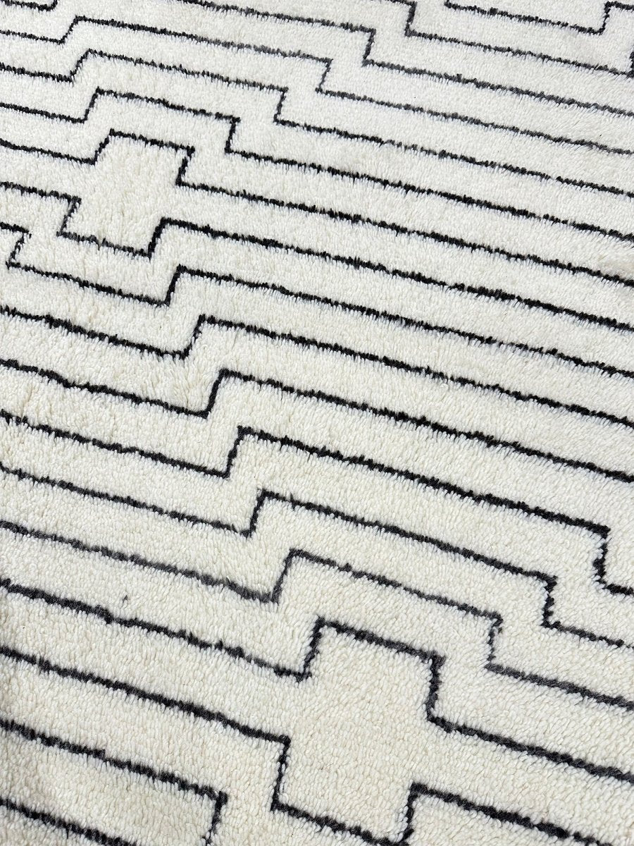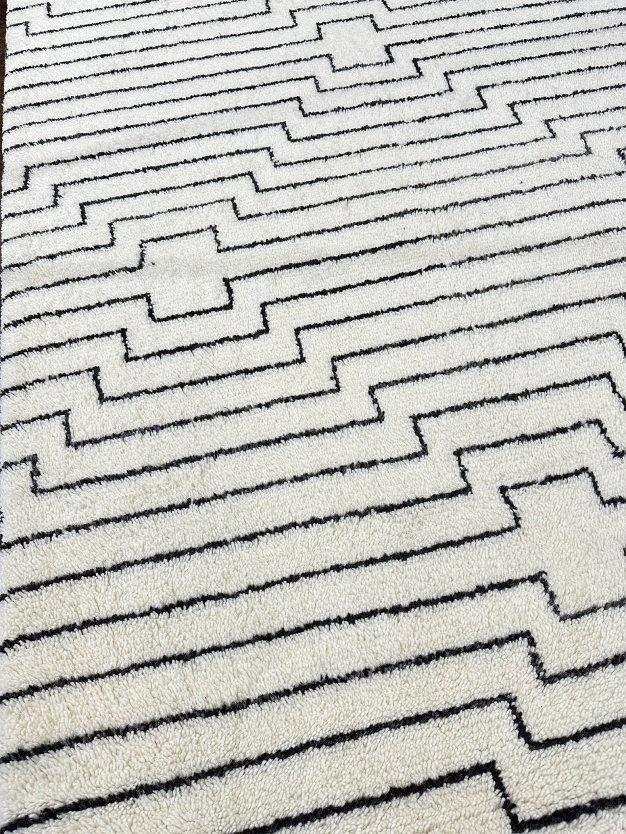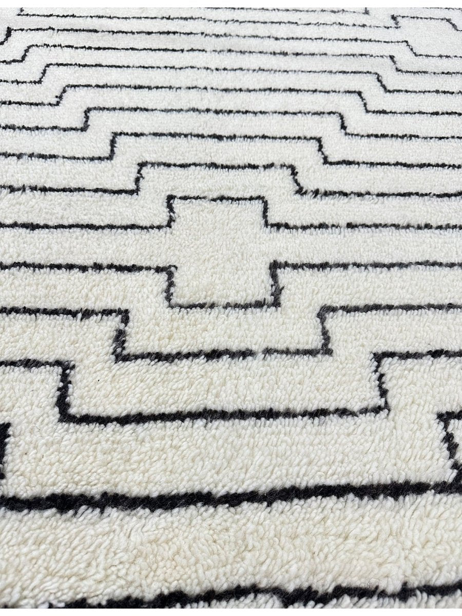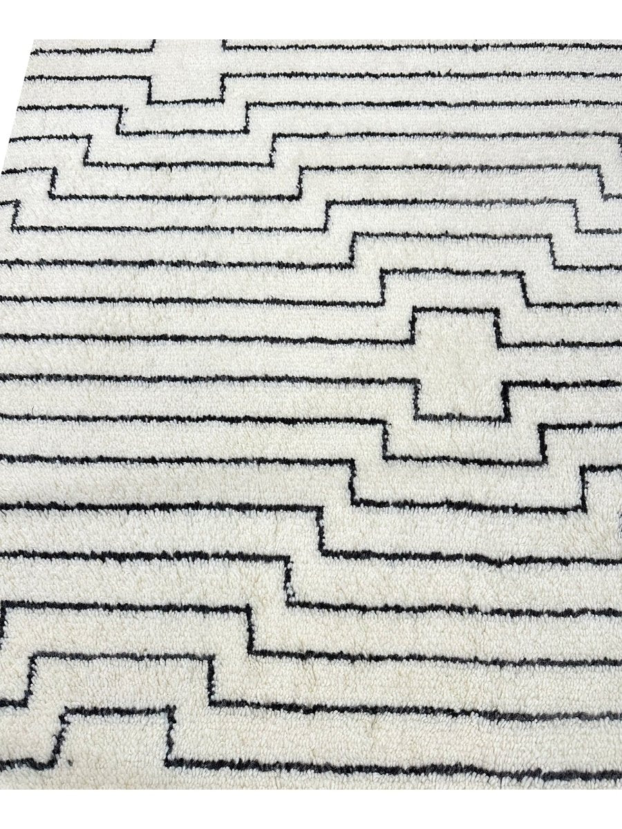 Add a touch of casual style to your home with this 5x8 Moroccan-style area rug, crafted in India. This rug features a captivating geometric pattern, showcasing a simple yet effective design in a soft ivory and black palette. Its durable wool construction ensures longevity and easy care, perfect for small living rooms, under coffee tables, and kids' rooms. The clean finish reflects quality craftsmanship and design. This piece effortlessly brightens, adding warmth, texture, and a relaxed feel. A blend of simple design and function, it easily enhances any space. Enjoy the benefit of free shipping across the United States. Each rug offers a distinct look, with subtle variations inherent to its creation.