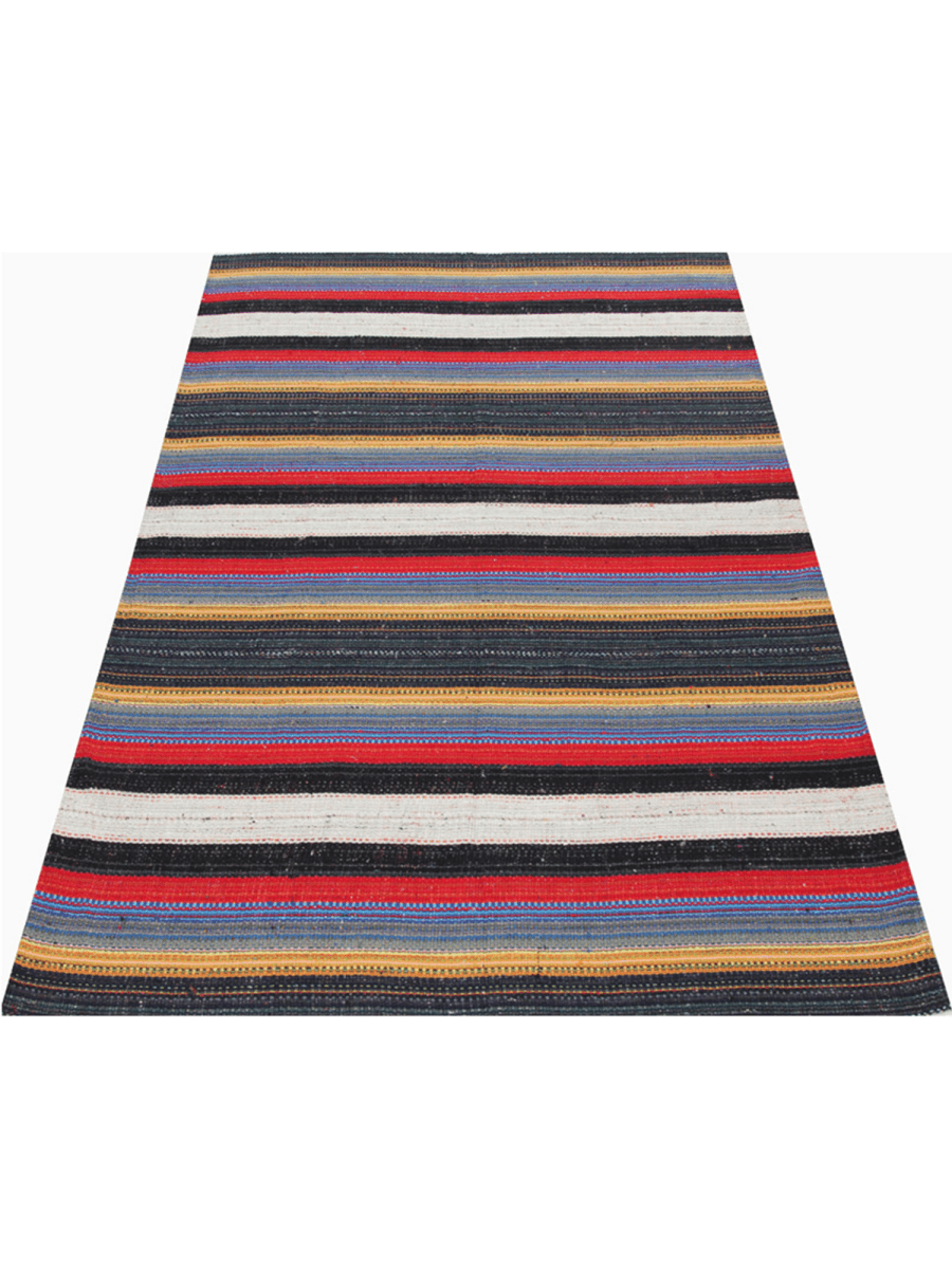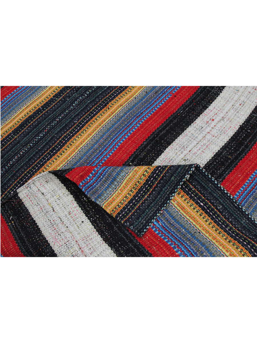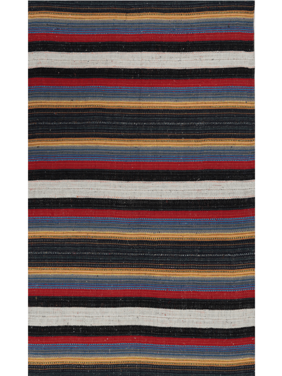 Enhance your living space with this 5x9 Persian Kilim area rug, a beautifully handcrafted flat-weave piece made from a durable cotton blend. The striking striped pattern features rich red, black, gray, yellow, and white hues, adding a bold yet refined touch to any room. This rug effortlessly complements various interior themes. Its lightweight yet sturdy construction ensures longevity and easy maintenance, making it a practical and stylish choice for any home. The intricate craftsmanship highlights the artistry of Persian weaving, offering a unique and timeless appeal. Whether used as a focal point or a grounding element, this rug enhances your space with warmth and character.