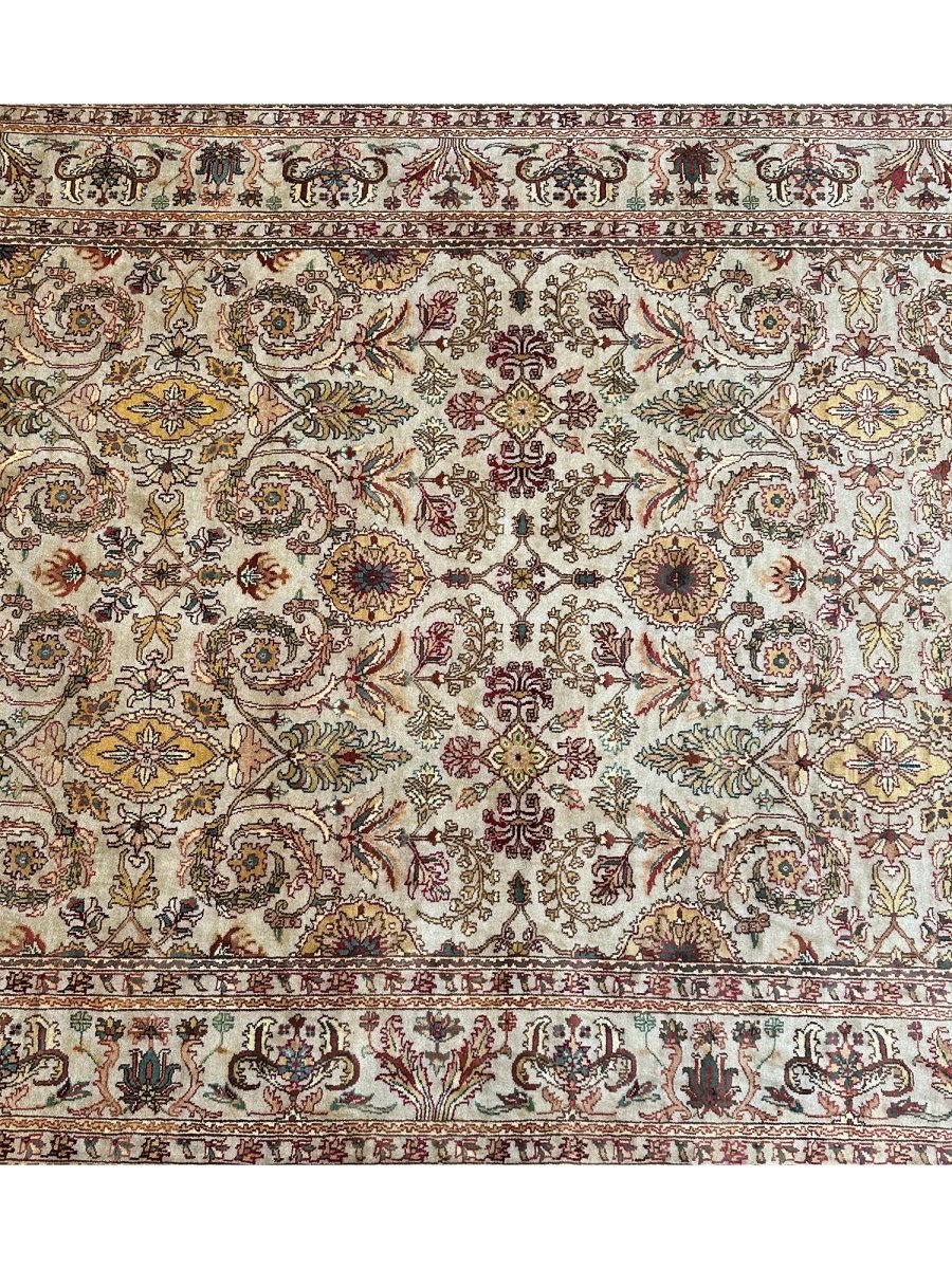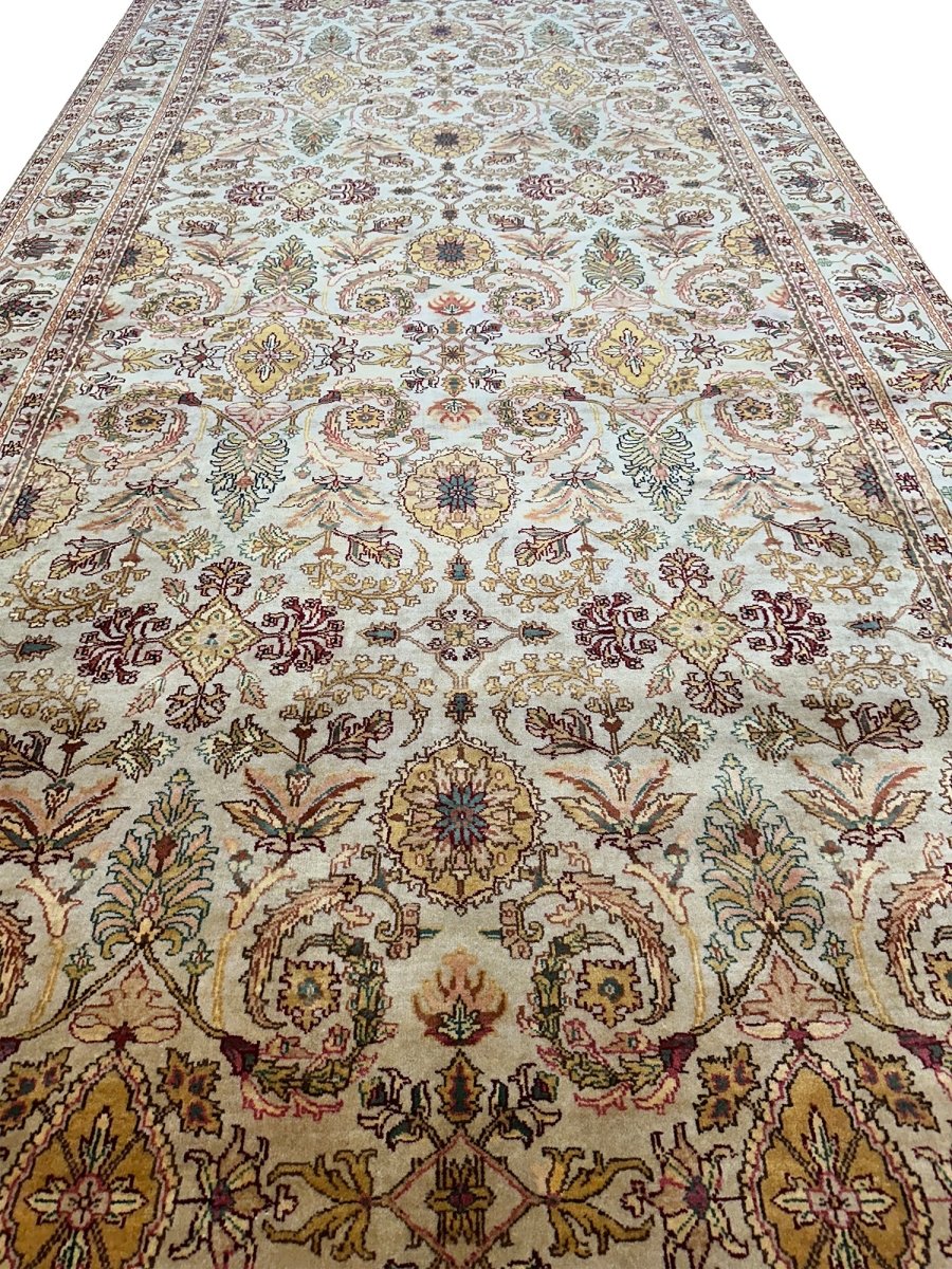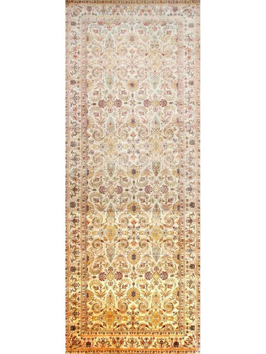 Grace your hallway with this elegant 6x16 Indian Agra runner rug, featuring a delightful floral pattern. Hand-knotted in India, this long rug showcases intricate blossoms and vines across its surface, bringing a sense of a blooming garden indoors. The field features a beautiful, light tone, reminiscent of soft beige, providing a luminous backdrop for the design. The dense floral pattern is rendered in a lovely palette including warm gold, various shades of red and pink, gentle greens, and subtle light blue accents, creating a vibrant yet harmonious look. Enjoy free US shipping.