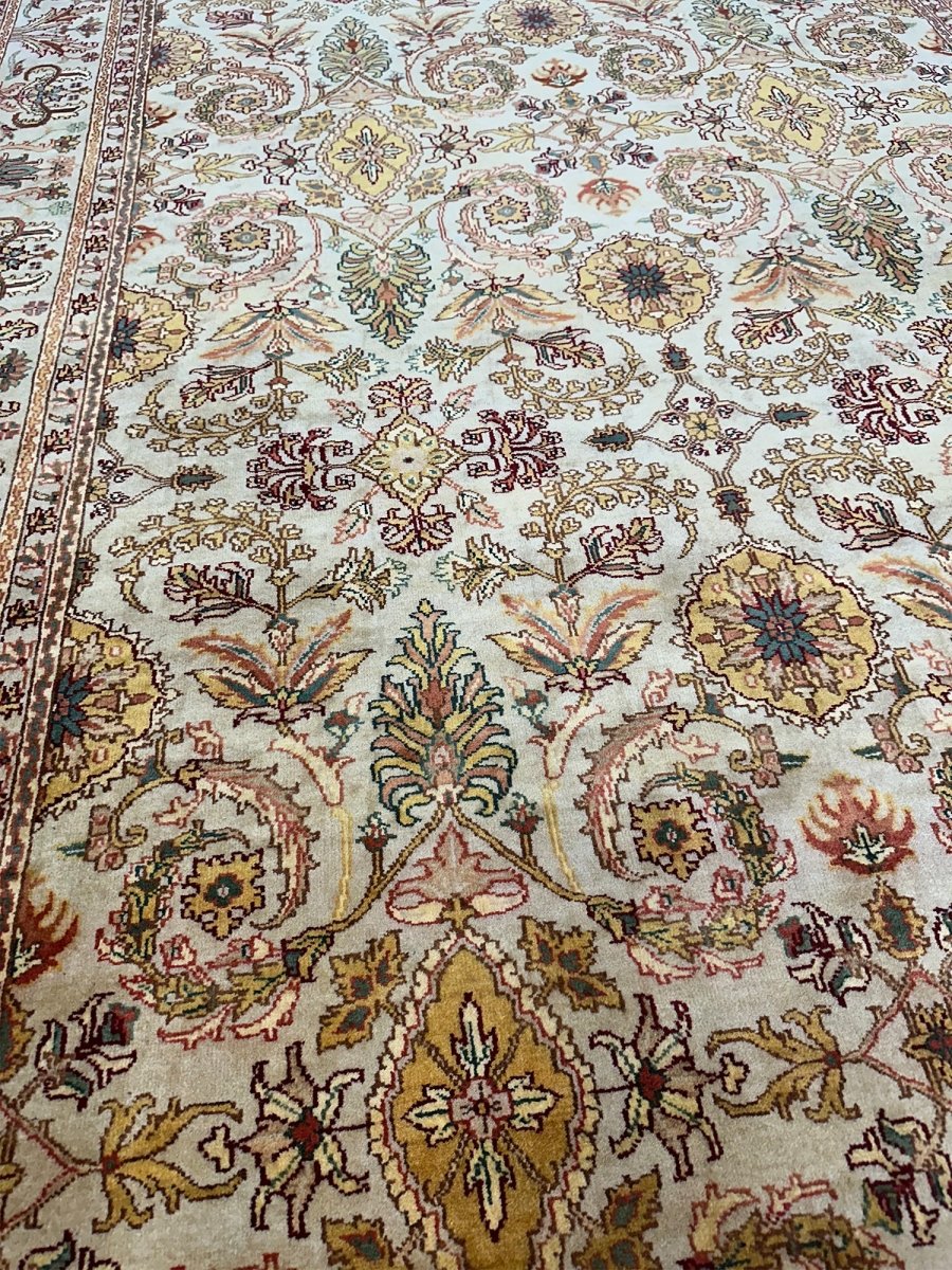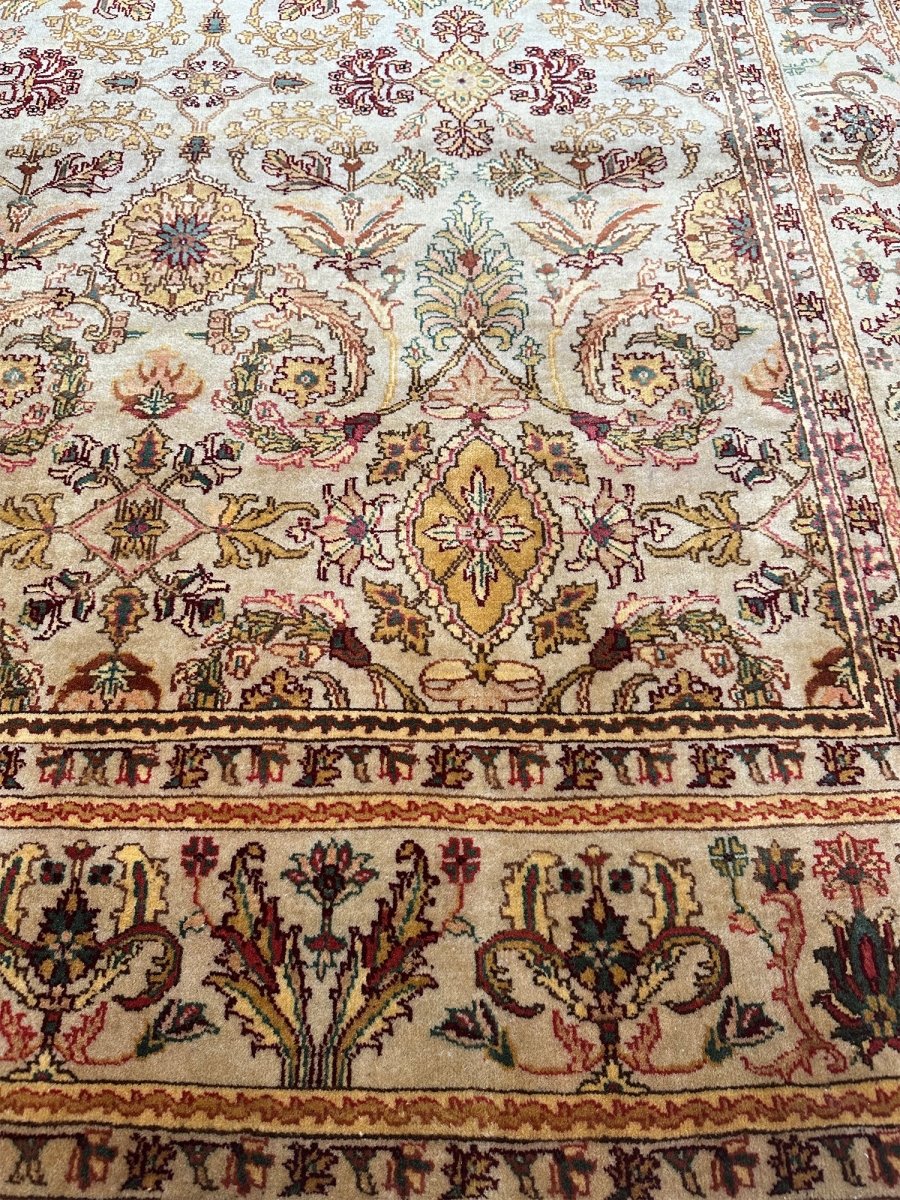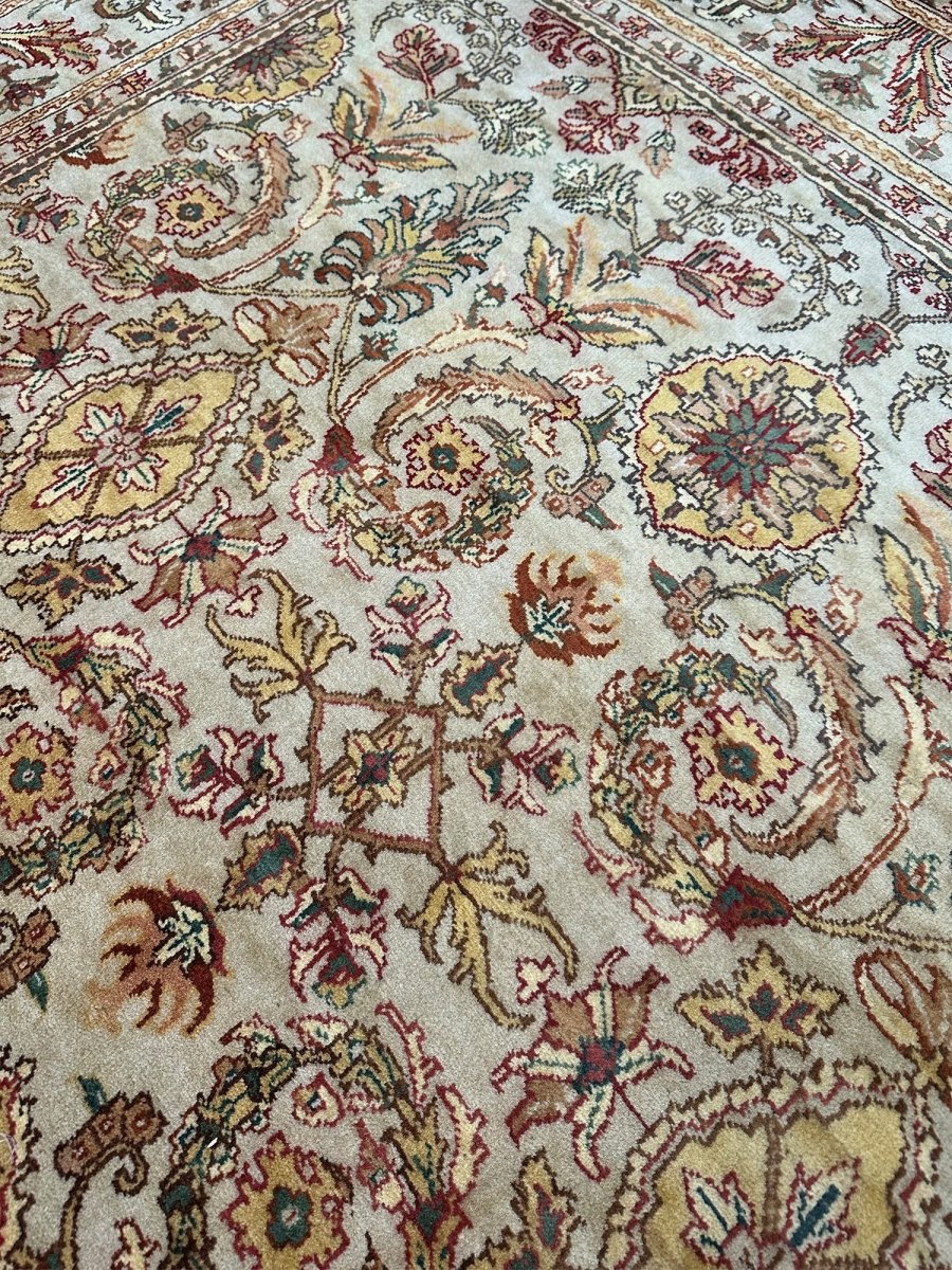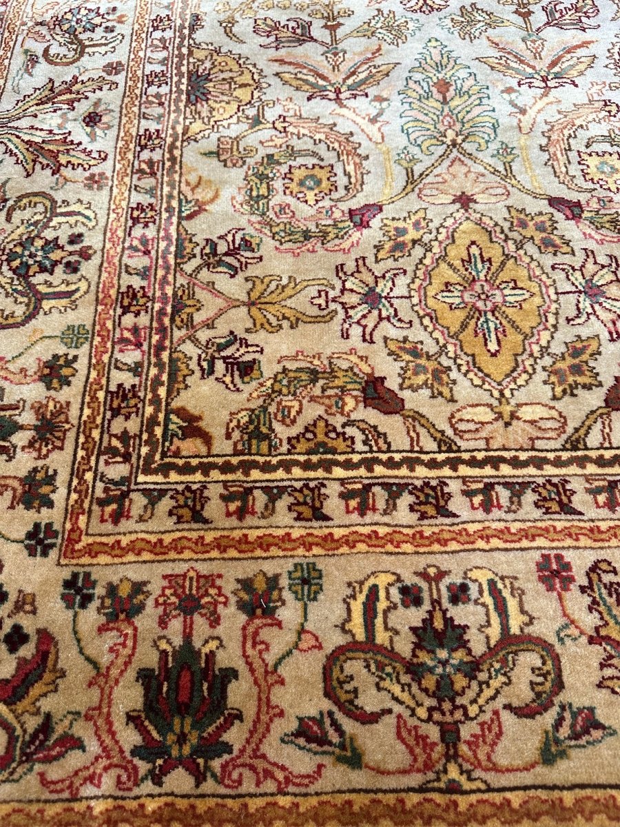 Grace your hallway with this elegant 6x16 Indian Agra runner rug, featuring a delightful floral pattern. Hand-knotted in India, this long rug showcases intricate blossoms and vines across its surface, bringing a sense of a blooming garden indoors. The field features a beautiful, light tone, reminiscent of soft beige, providing a luminous backdrop for the design. The dense floral pattern is rendered in a lovely palette including warm gold, various shades of red and pink, gentle greens, and subtle light blue accents, creating a vibrant yet harmonious look. Enjoy free US shipping.