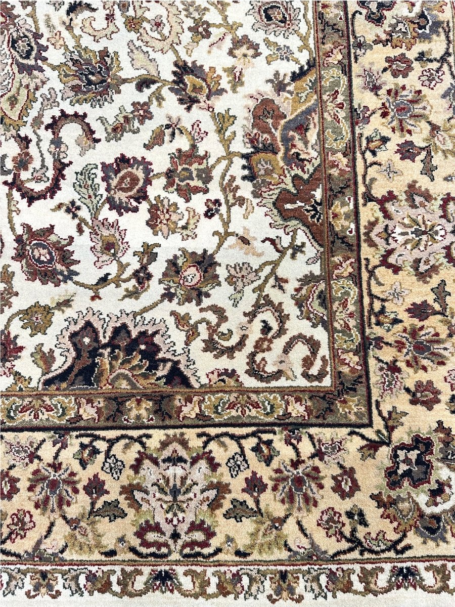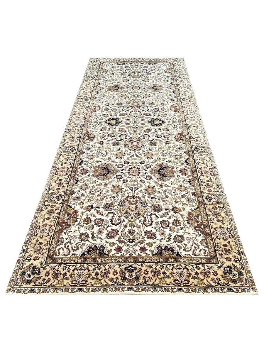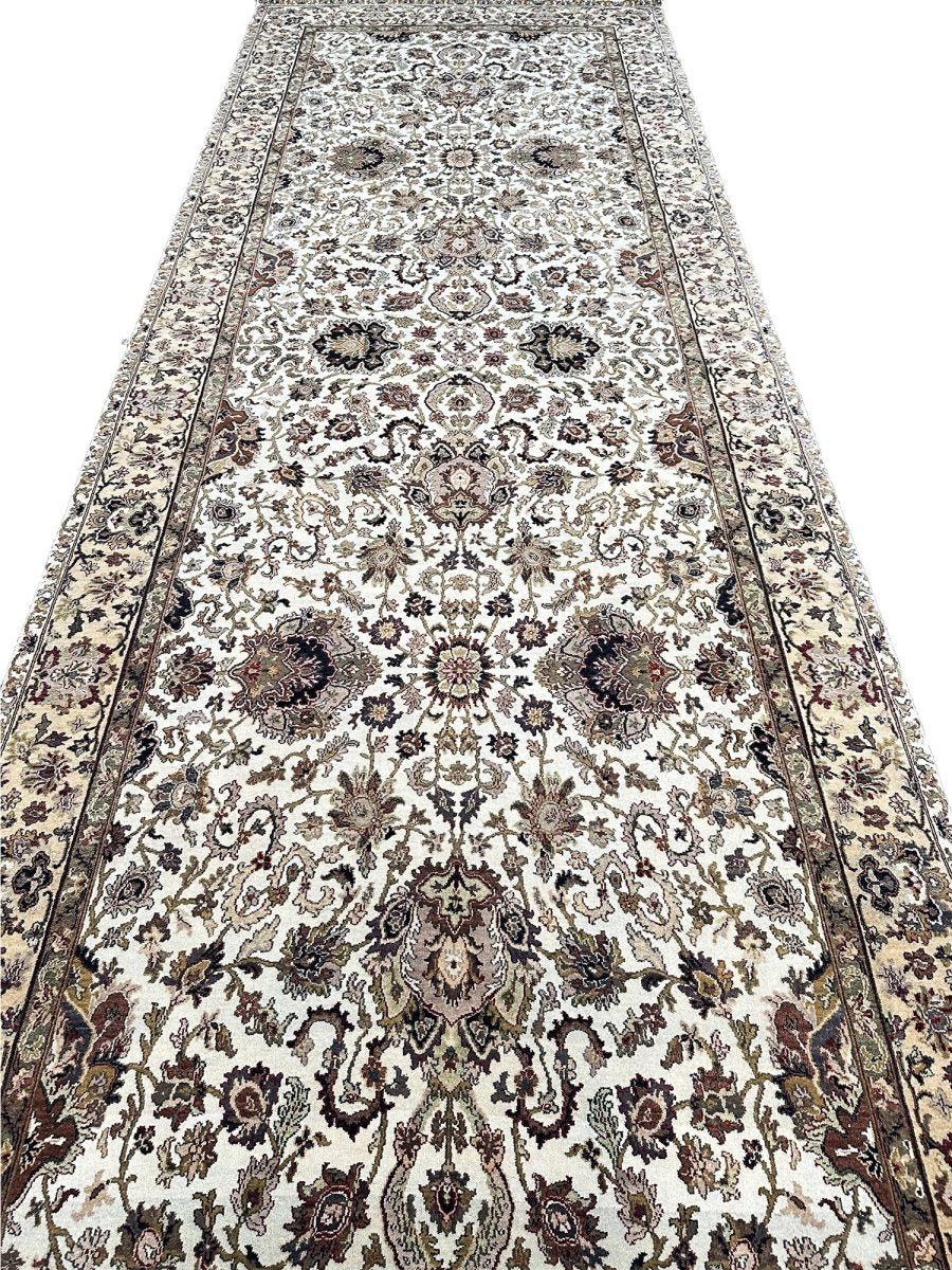Discover the timeless beauty of this 6x16 Indian Mughal runner rug, made in India. Hand-knotted, this elegant runner features a captivating all-over floral pattern that fills the entire field with intricate bloom and vine design. The color palette is soft and inviting, with a field in lovely ivory, and the all-over floral pattern rendered in shades of beige, red, and brown. Crafted from fine wool, this runner offers both exceptional durability and a comfortable texture underfoot. The all-over floral design creates a sense of continuous pattern and traditional charm, enhancing the aesthetic of any space. Enjoy the benefits of free US shipping.
