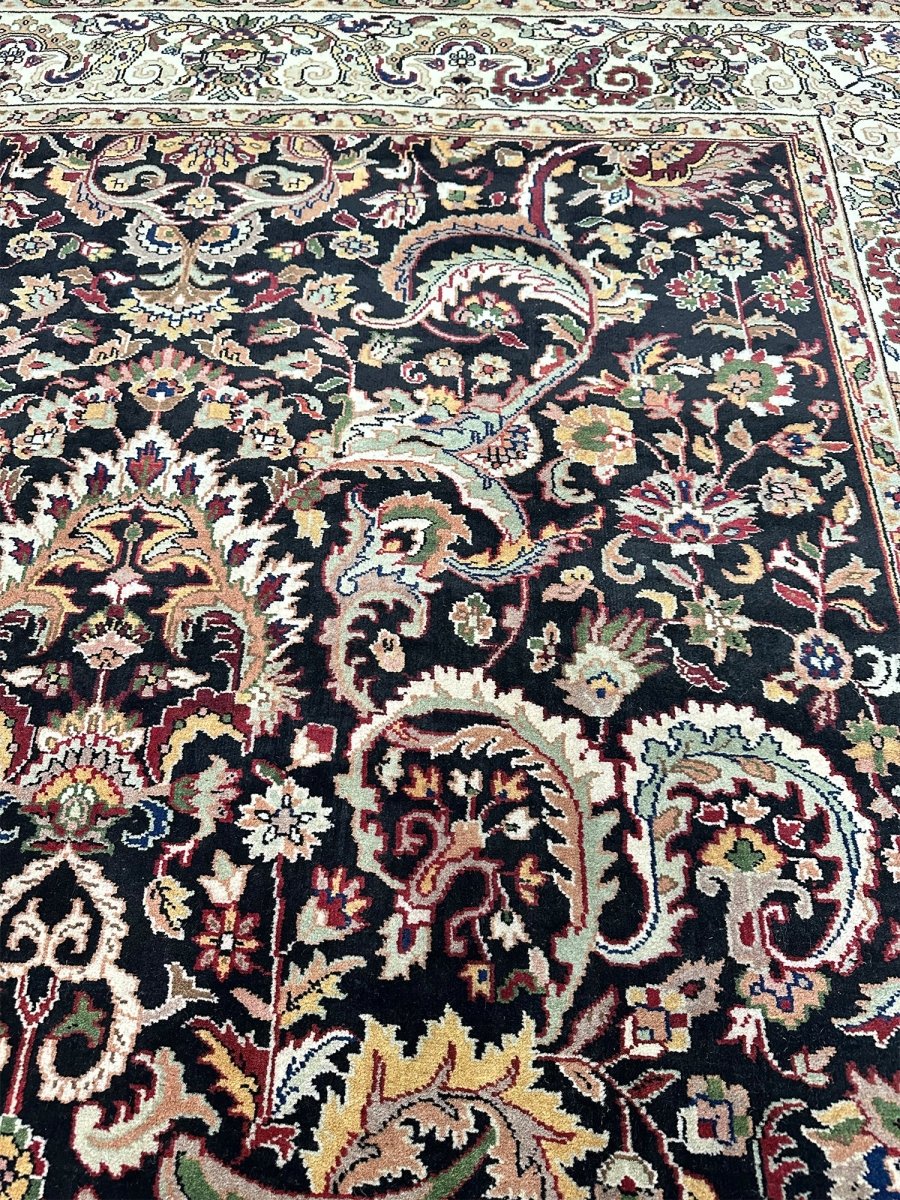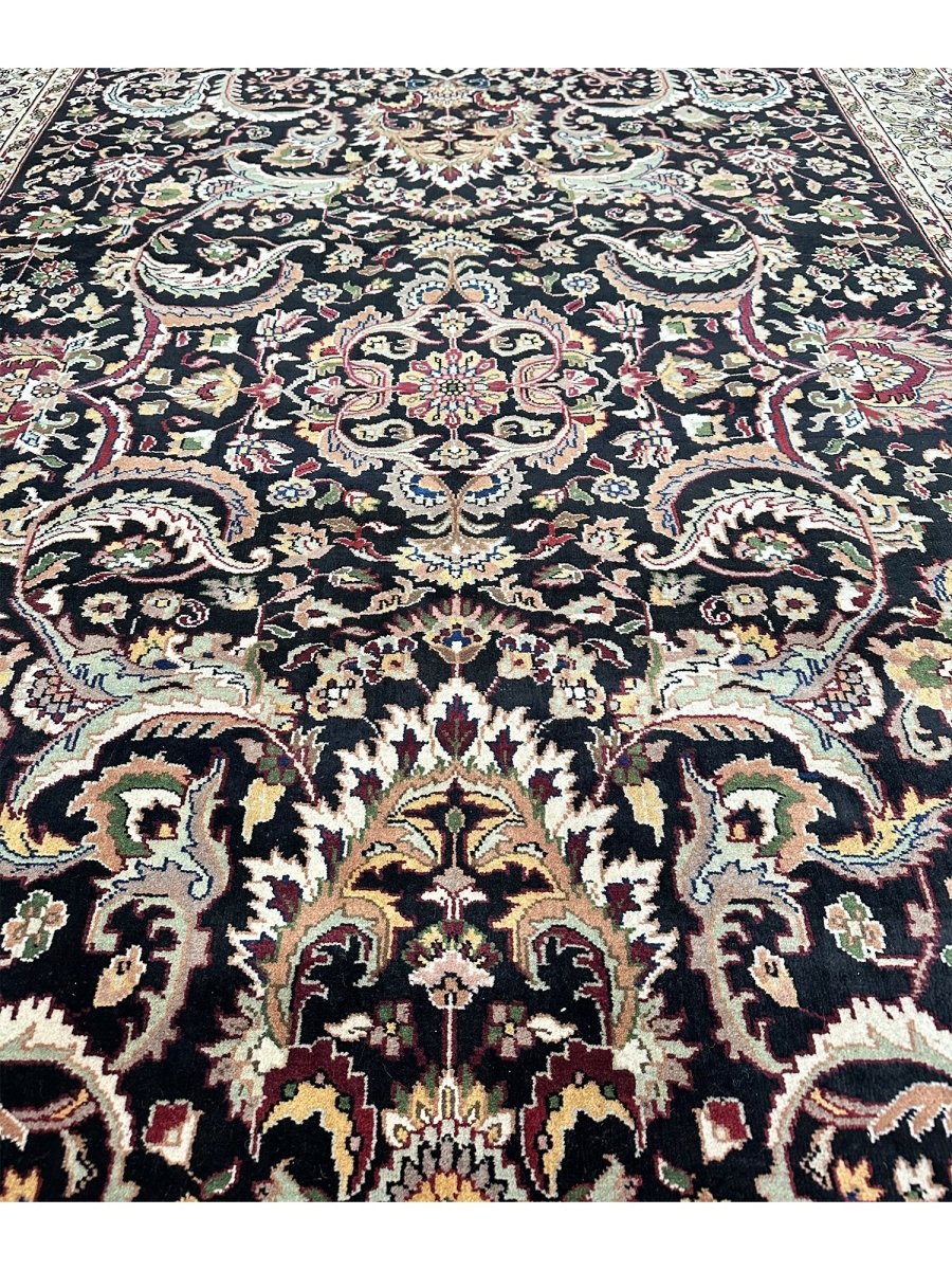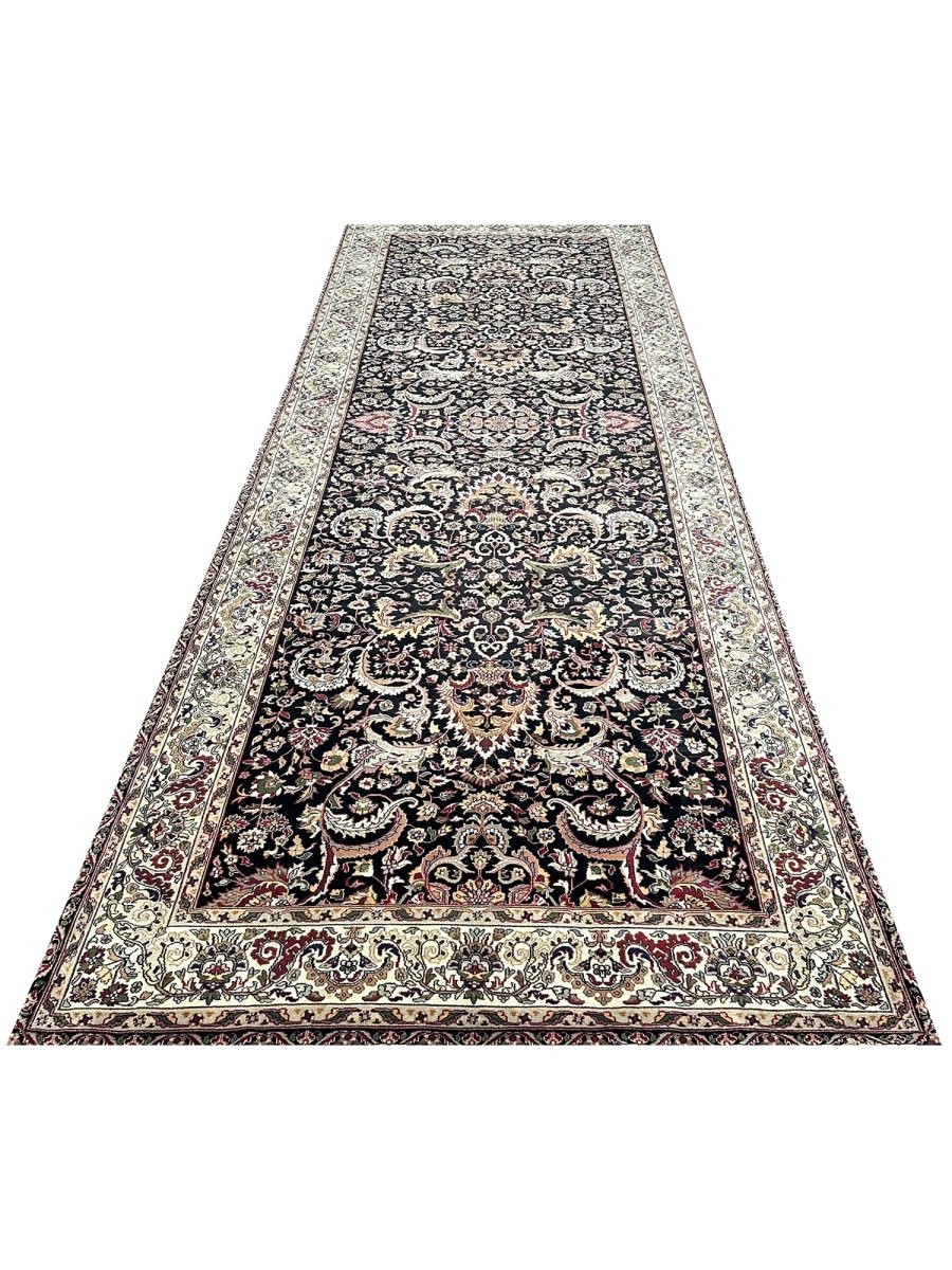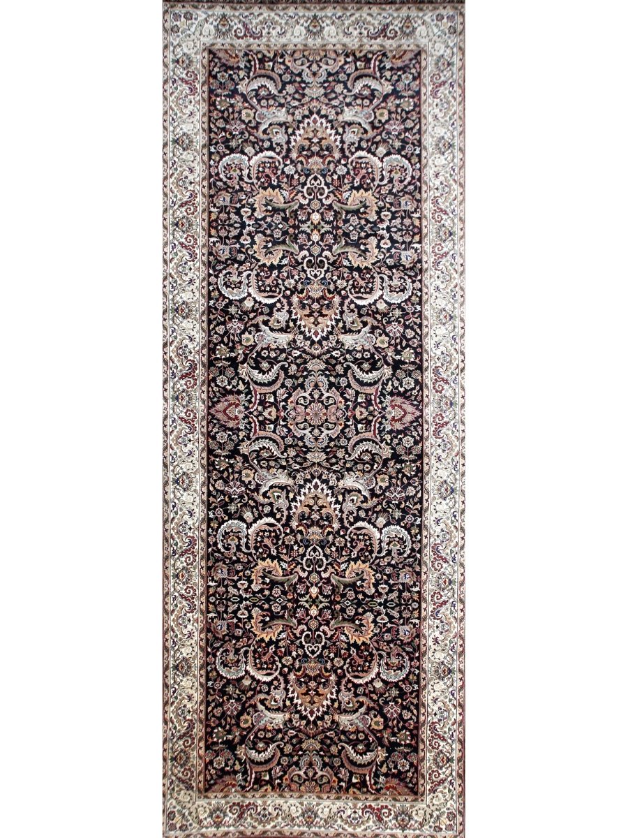 Define your long spaces with the exquisite beauty of this 6x17 Indian Agra runner rug, featuring a captivating floral pattern. Hand-knotted in India, this runner brings timeless elegance and intricate design to your home. The dense floral pattern, including delicate blossoms and graceful motifs, covers the entire field, creating a rich and detailed reflection of traditional artistry. The dark background of black provides a dramatic contrast that makes the lighter pattern details stand out beautifully. A light-colored border, in shades of beige, frames the rug and complements the central design. The pattern is filled with a lovely array of colors, including warm gold, rich red, soft beige, and subtle hints of green or blue adding both a luxurious feel and defining the area. Enjoy the convenience of free US shipping.