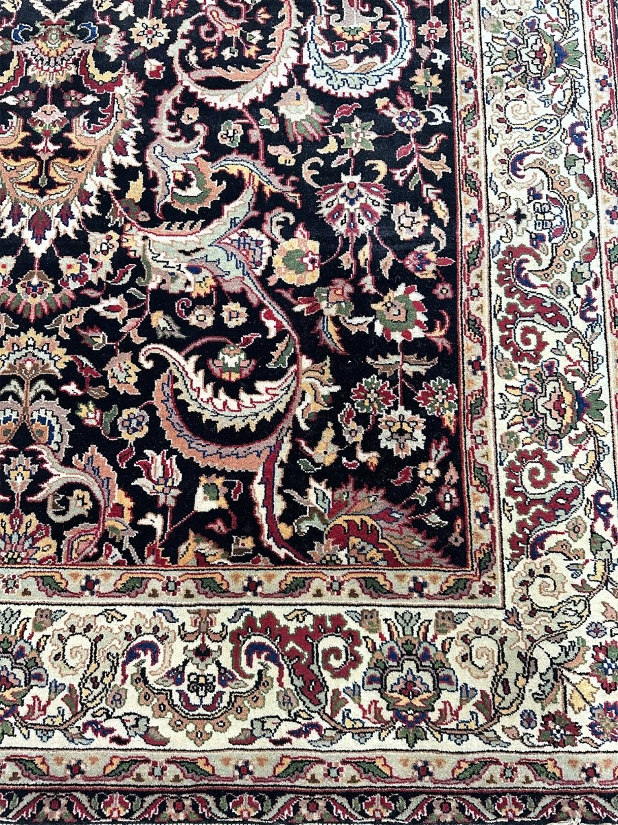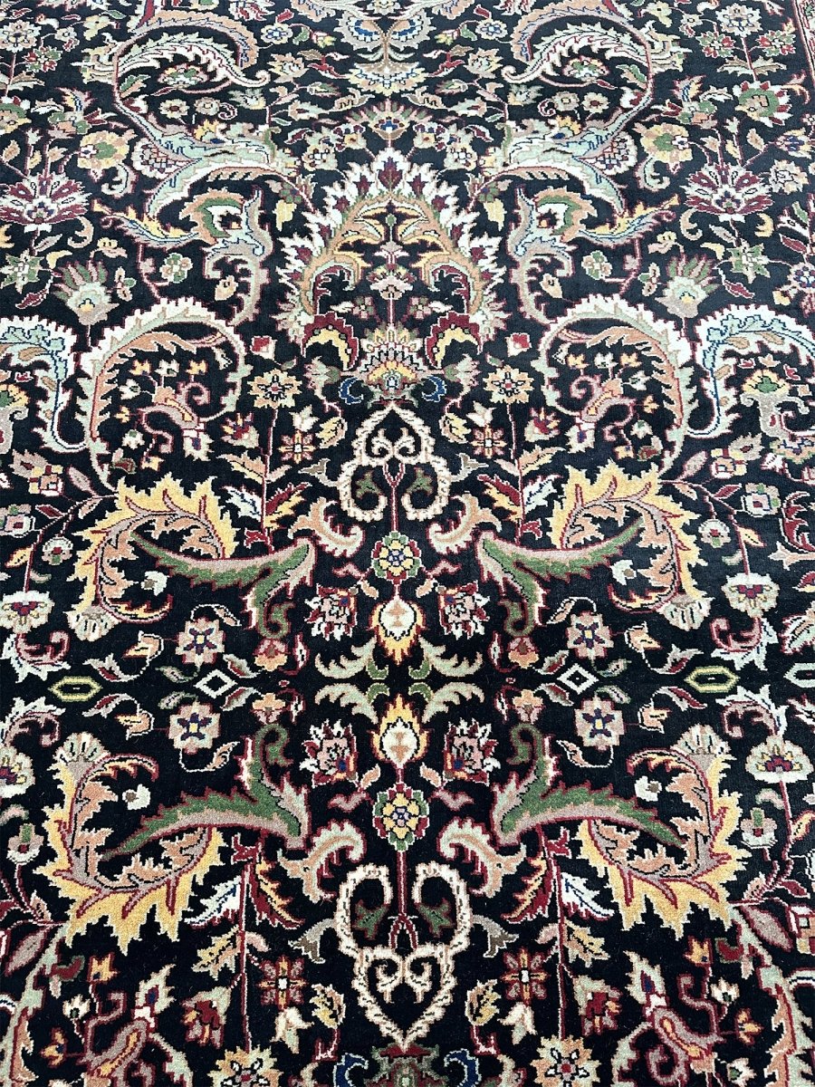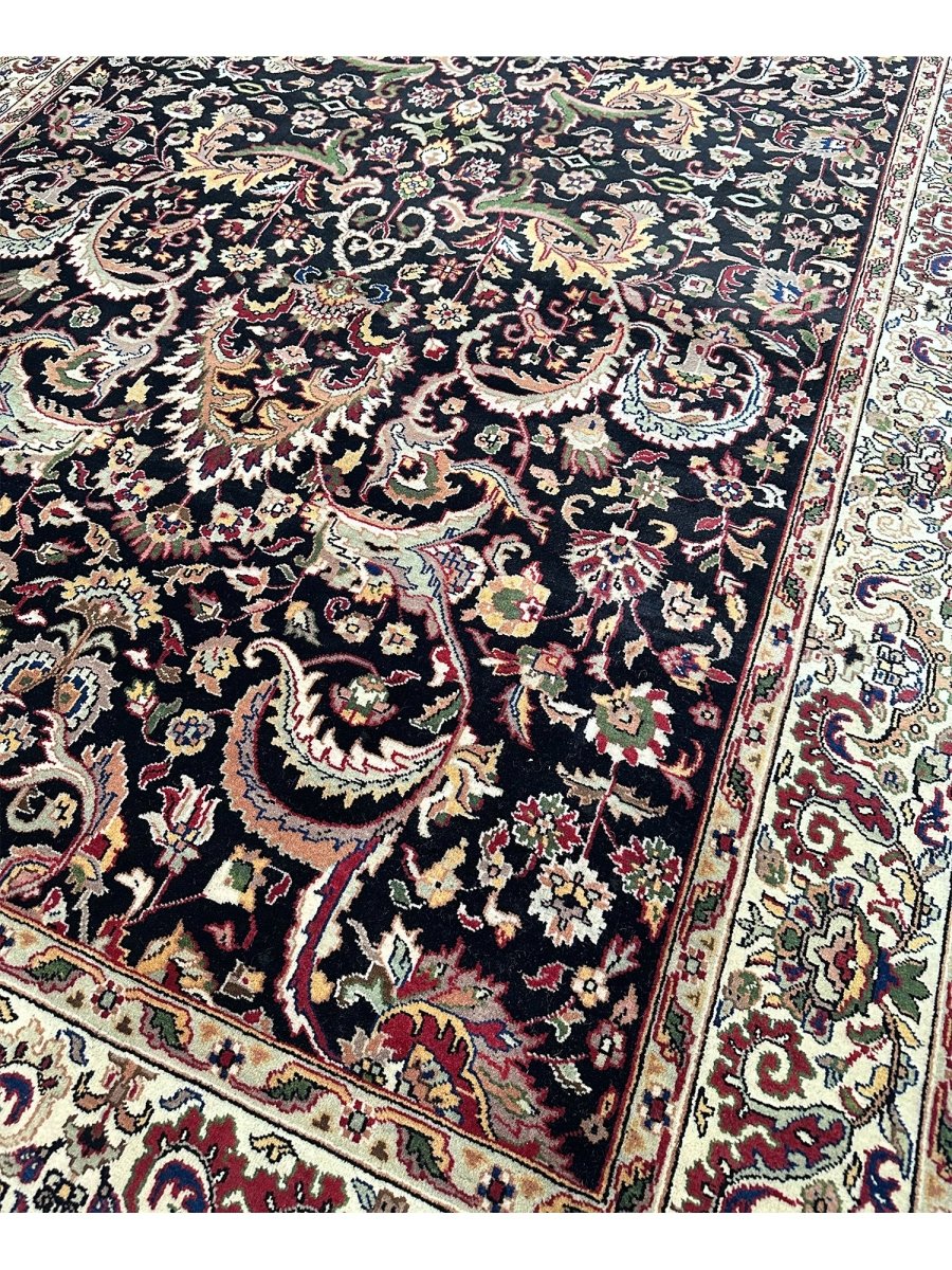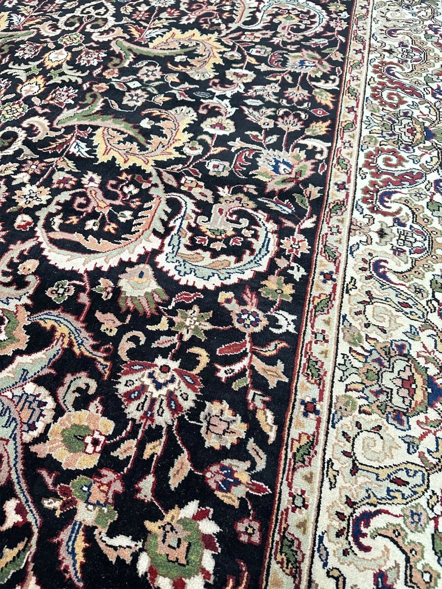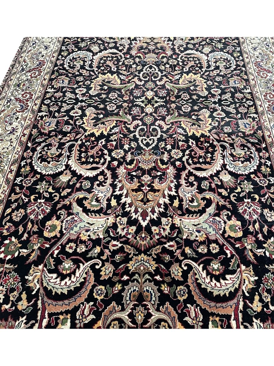 Define your long spaces with the exquisite beauty of this 6x17 Indian Agra runner rug, featuring a captivating floral pattern. Hand-knotted in India, this runner brings timeless elegance and intricate design to your home. The dense floral pattern, including delicate blossoms and graceful motifs, covers the entire field, creating a rich and detailed reflection of traditional artistry. The dark background of black provides a dramatic contrast that makes the lighter pattern details stand out beautifully. A light-colored border, in shades of beige, frames the rug and complements the central design. The pattern is filled with a lovely array of colors, including warm gold, rich red, soft beige, and subtle hints of green or blue adding both a luxurious feel and defining the area. Enjoy the convenience of free US shipping.