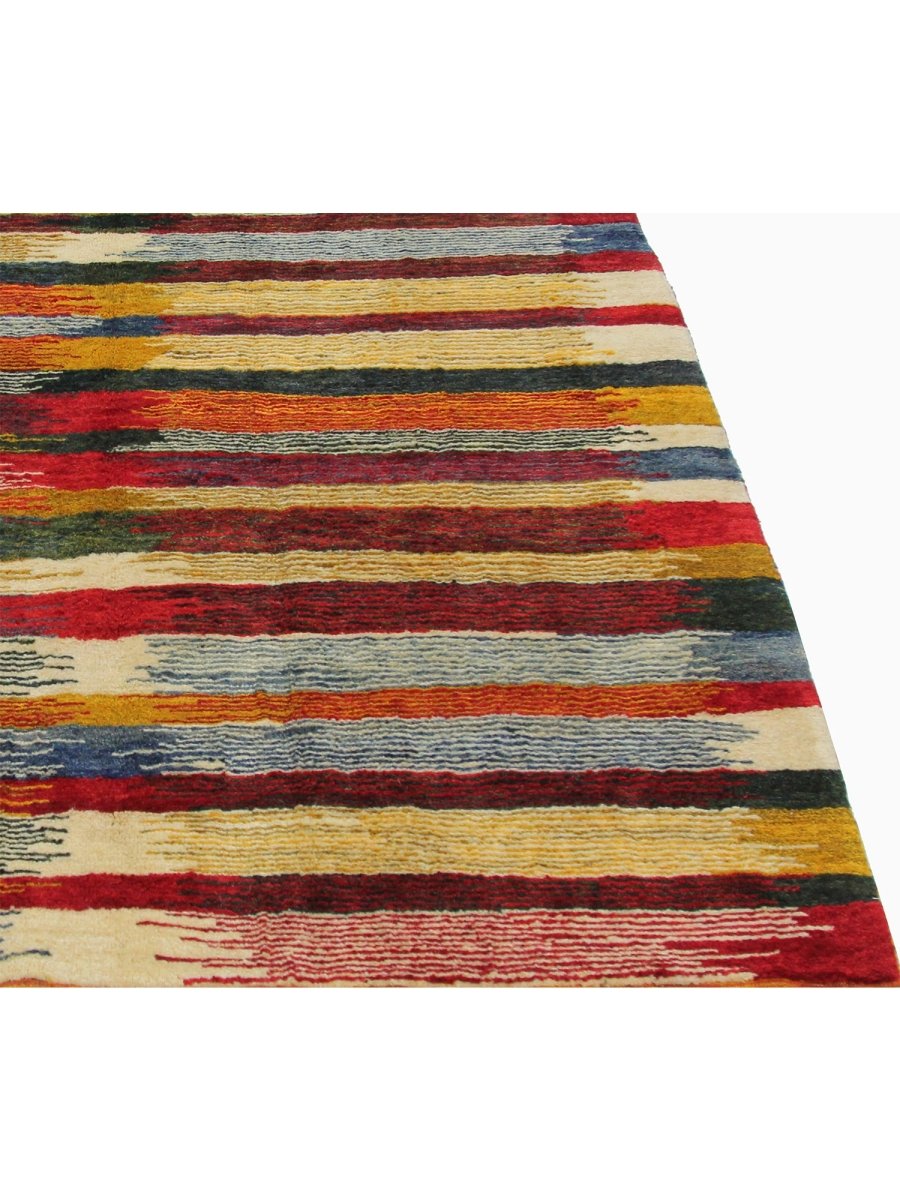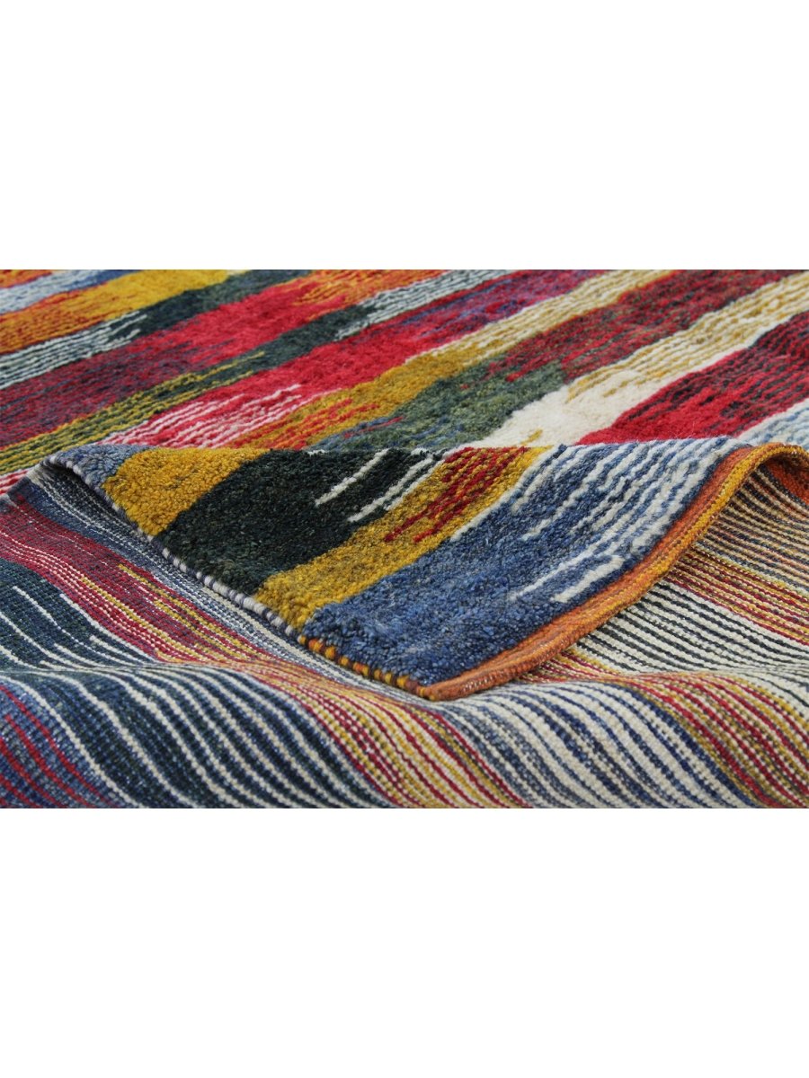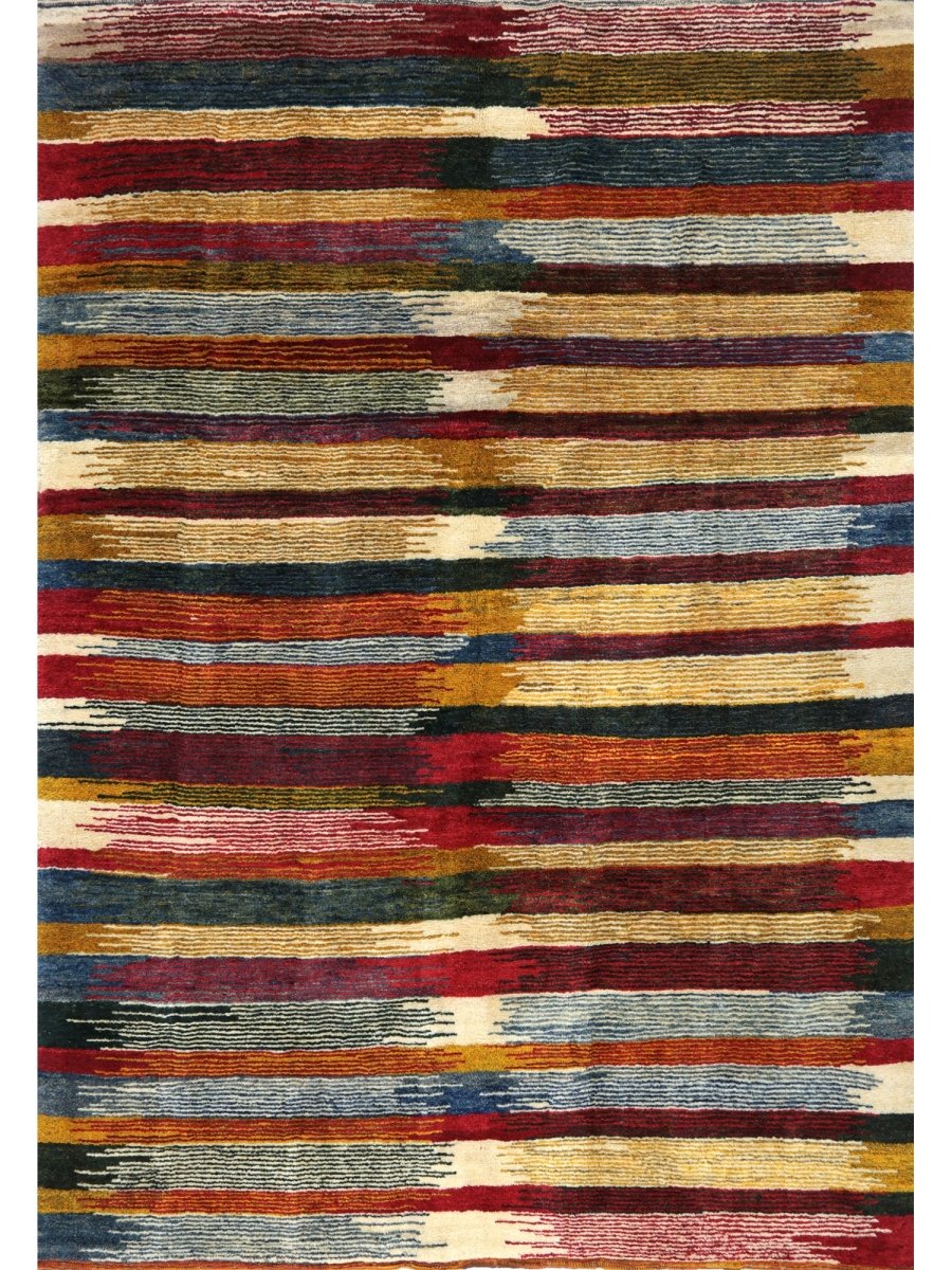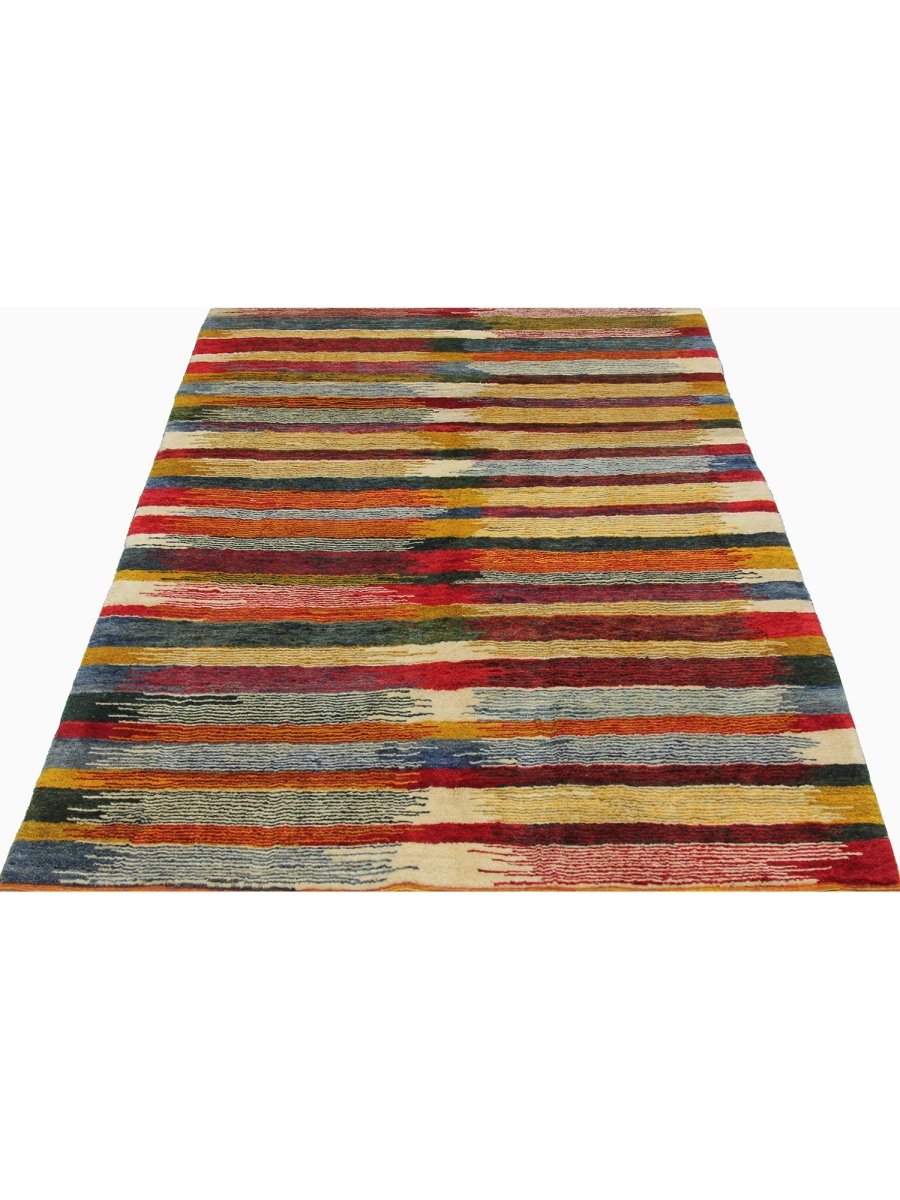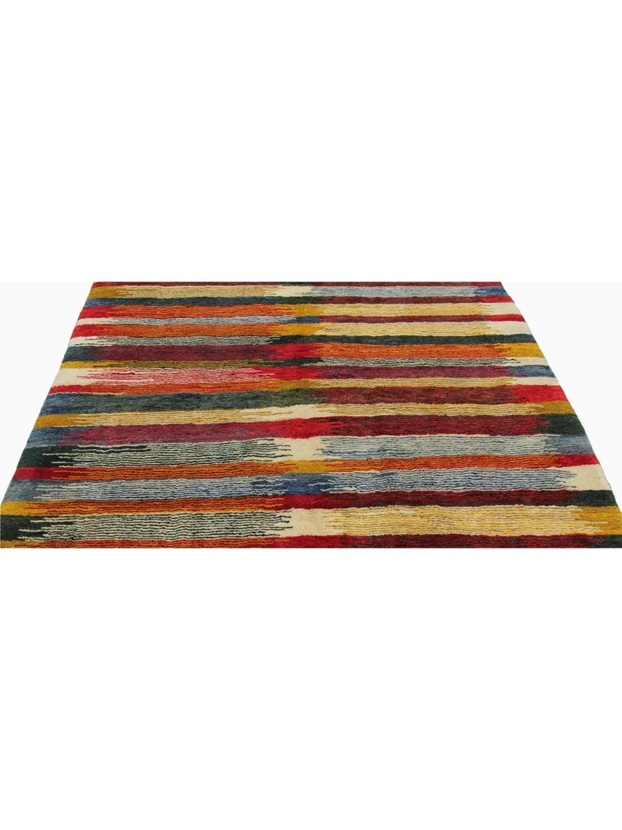 The 6x8 Persian Gabbeh Area Rug is a unique treasure that embodies the rich history of Persian weaving. This gorgeous rug made of high-quality wool features a striped design that complements many interiors. It provides a friendly atmosphere and adds a touch of antique Persian style. It is a multipurpose addition to your house, a striking blend of warm tones of yellow, orange, rust, blue, and beige that offer depth and character. Take advantage of free US delivery.