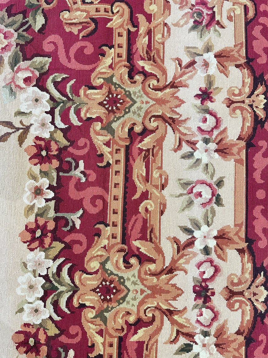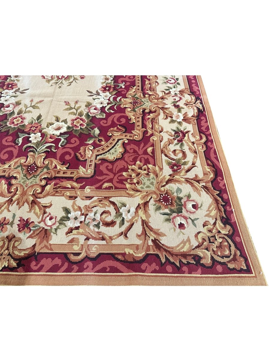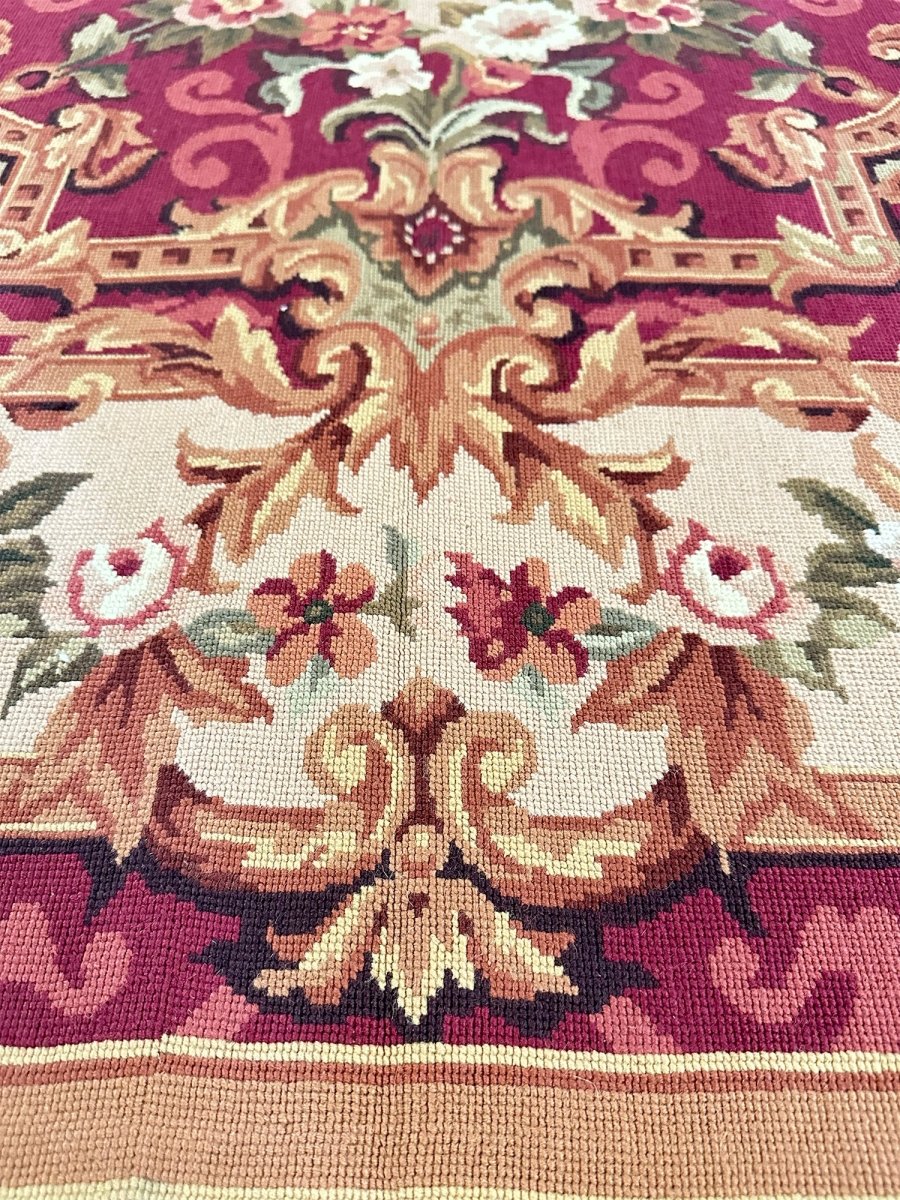 This 6x9 French Style Needlepoint Area Rug showcases rich red tones paired with soft pink accents and a refined ivory center, offering a beautifully balanced and timeless aesthetic. Hand-knotted in wool, it highlights intricate detailing, from the delicate central blossoms to the ornate floral borders that frame the design with classic needlepoint elegance. New and expertly crafted in China, this rug delivers depth, warmth, and artistry through its carefully rendered motifs. Free U.S. shipping adds convenience and value.