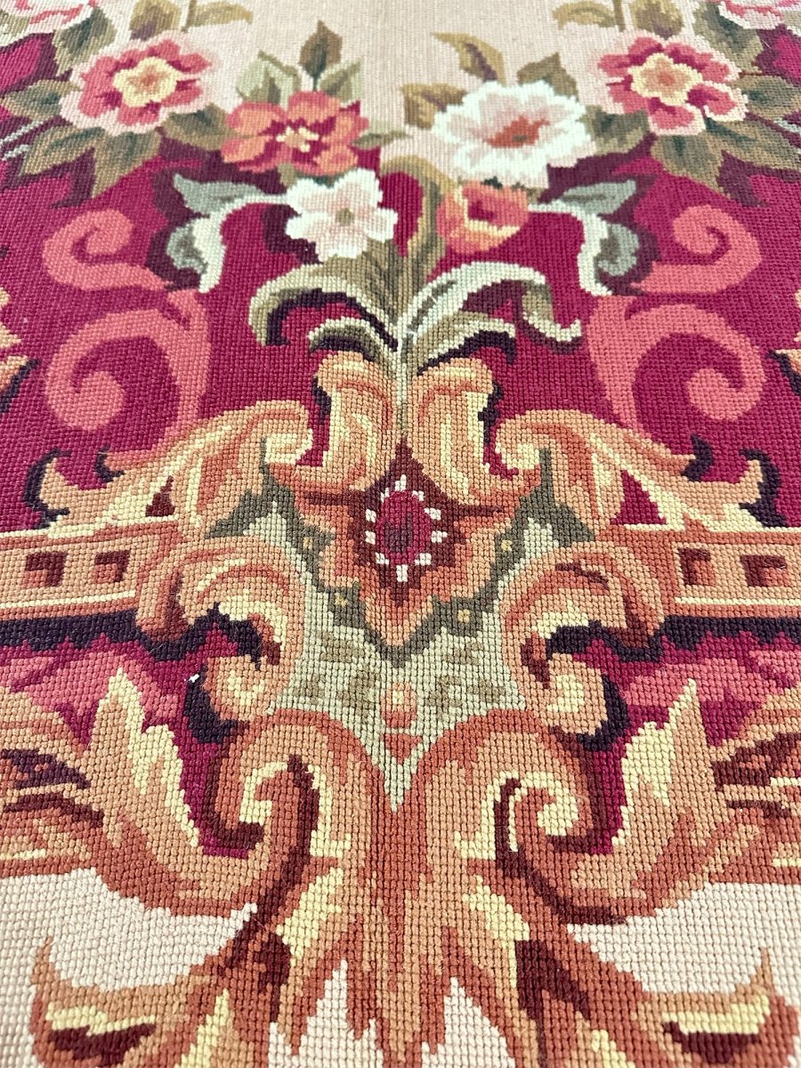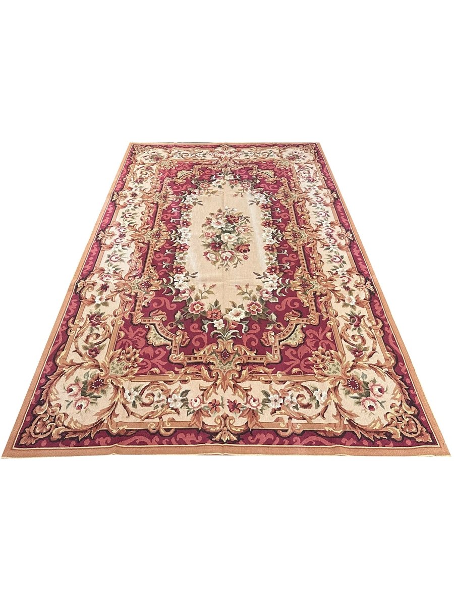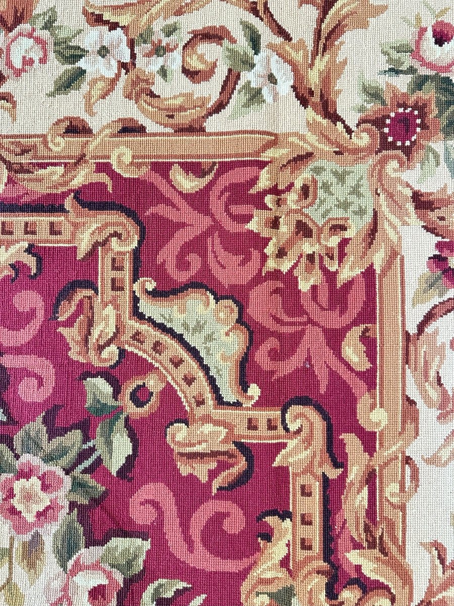 This 6x9 French Style Needlepoint Area Rug showcases rich red tones paired with soft pink accents and a refined ivory center, offering a beautifully balanced and timeless aesthetic. Hand-knotted in wool, it highlights intricate detailing, from the delicate central blossoms to the ornate floral borders that frame the design with classic needlepoint elegance. New and expertly crafted in China, this rug delivers depth, warmth, and artistry through its carefully rendered motifs. Free U.S. shipping adds convenience and value.