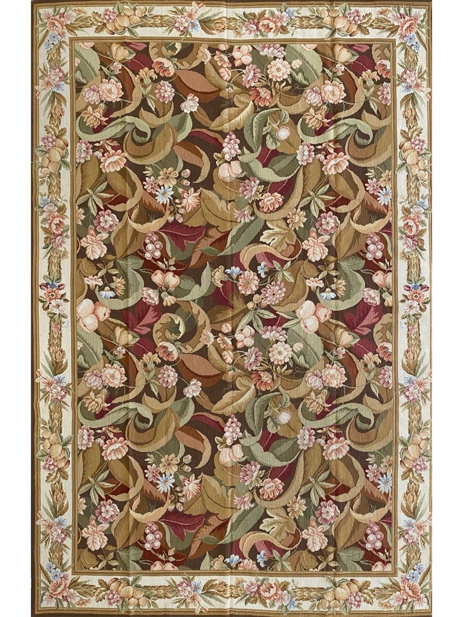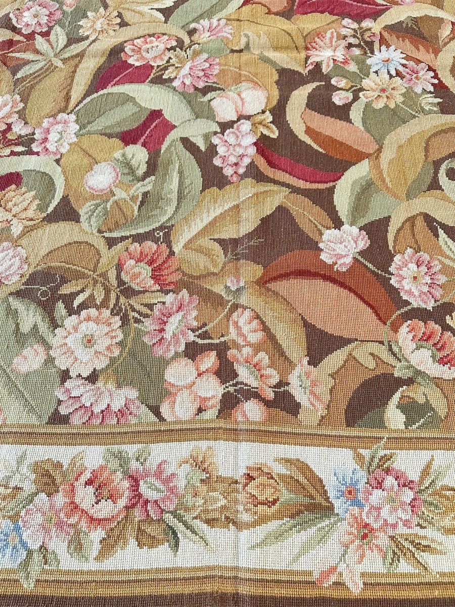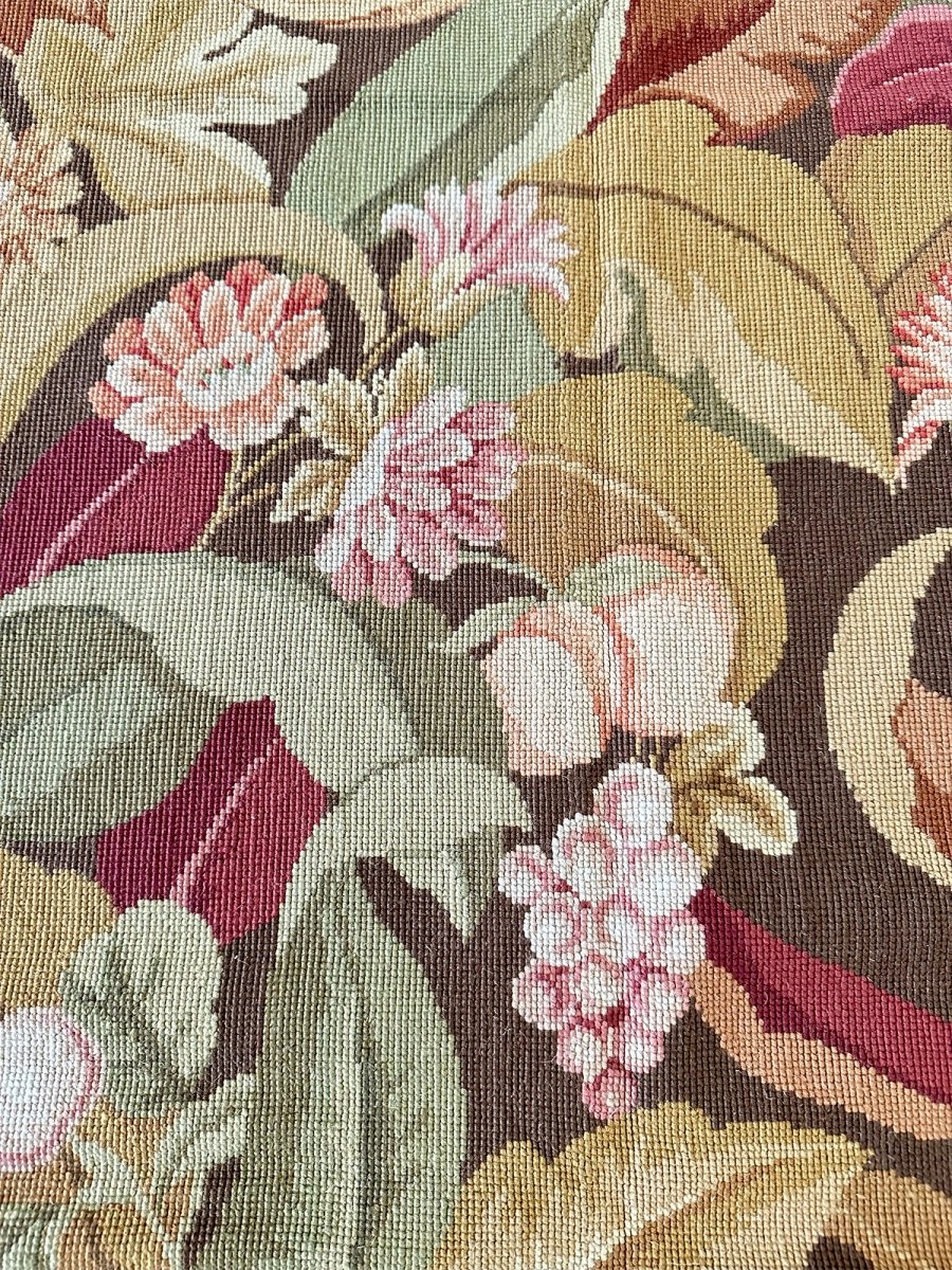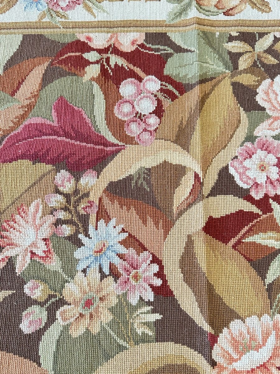 A deep brown field sets a warm and inviting foundation for the rug’s intricate floral detailing. Scrolling vines, layered foliage, and delicately rendered blossoms appear throughout the design in soft complementary hues such as sage green, burgundy, peach, rose, and subtle earth tones. These elements create a harmonious and textured needlepoint effect that echoes the charm of antique European needlework.
