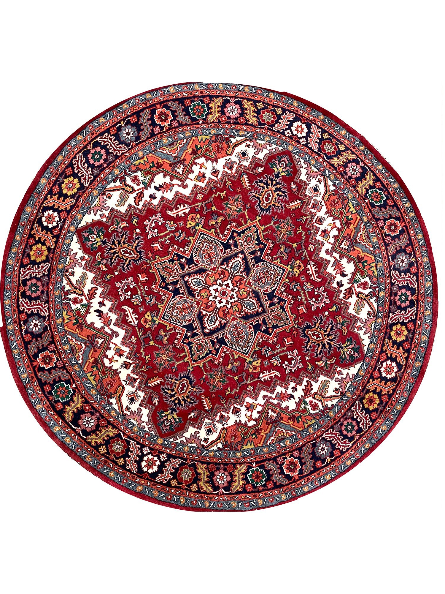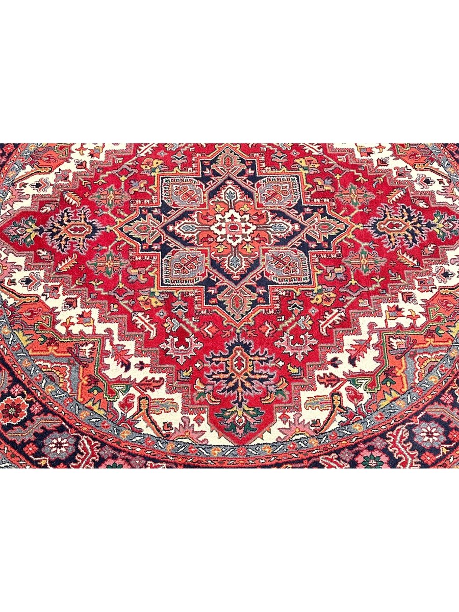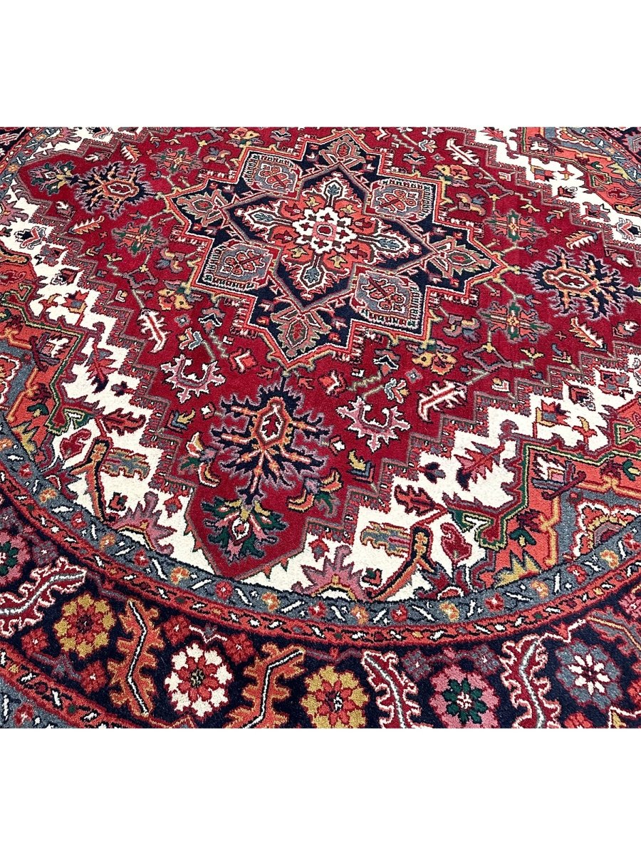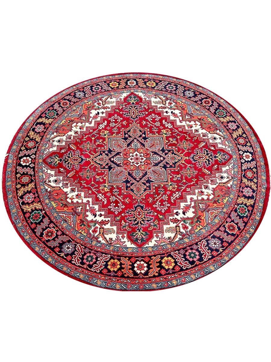 Enhance the sophistication of your home with the 8' Round Heriz Rug, a unique piece that celebrates the beauty of classic traditional handcraft in rug-making. Hand-knotted from the finest wool, this stunning rug features a Medallion pattern that infuses warmth and elegance into any room. The rich hues of red, cream, black, and yellow energize your home, making it a perfect complement to various decor styles. This exceptional rug is more than just an accessory; it's a timeless work of art that enriches the beauty of your home. Order now and enjoy free US shipping.