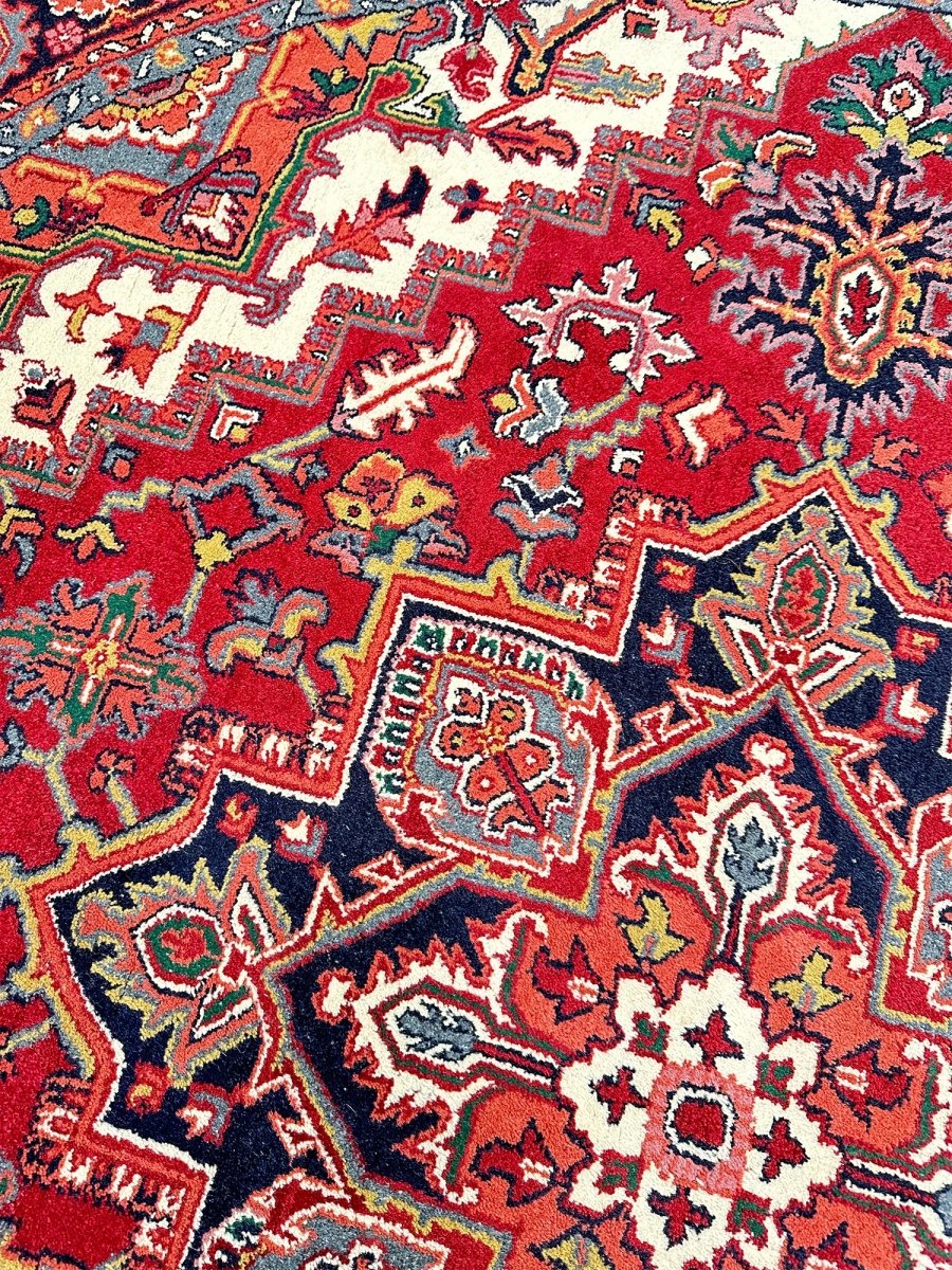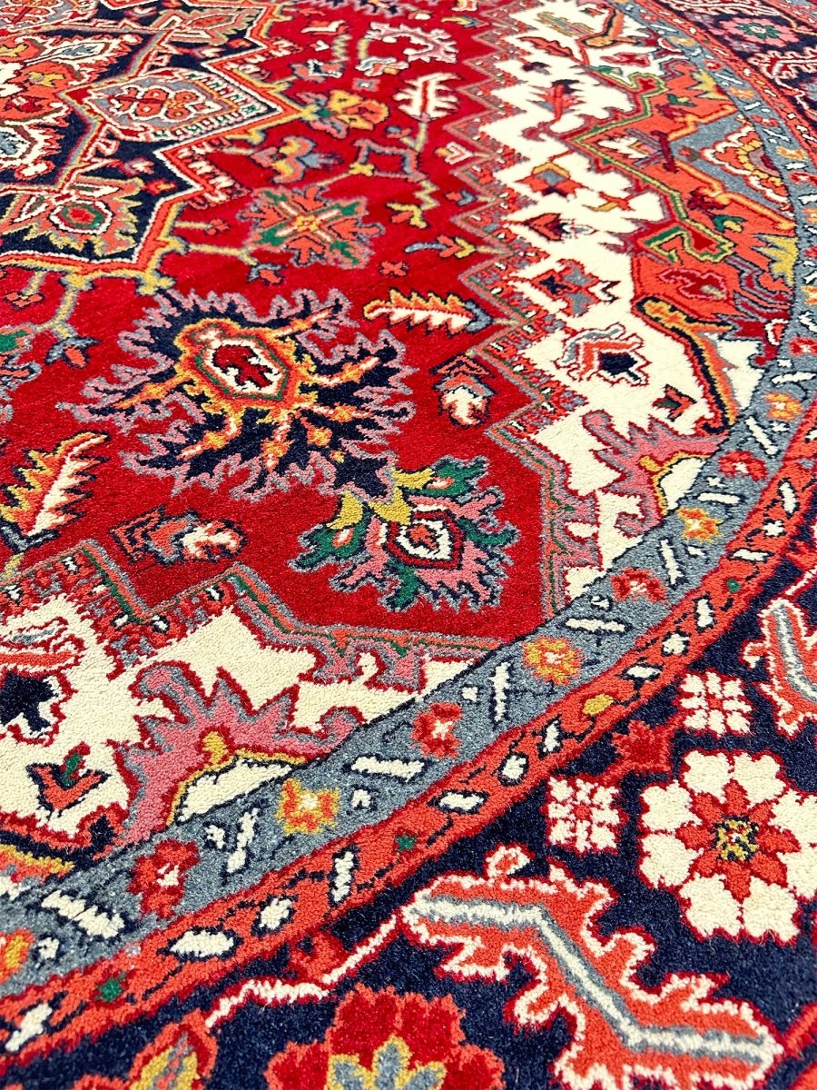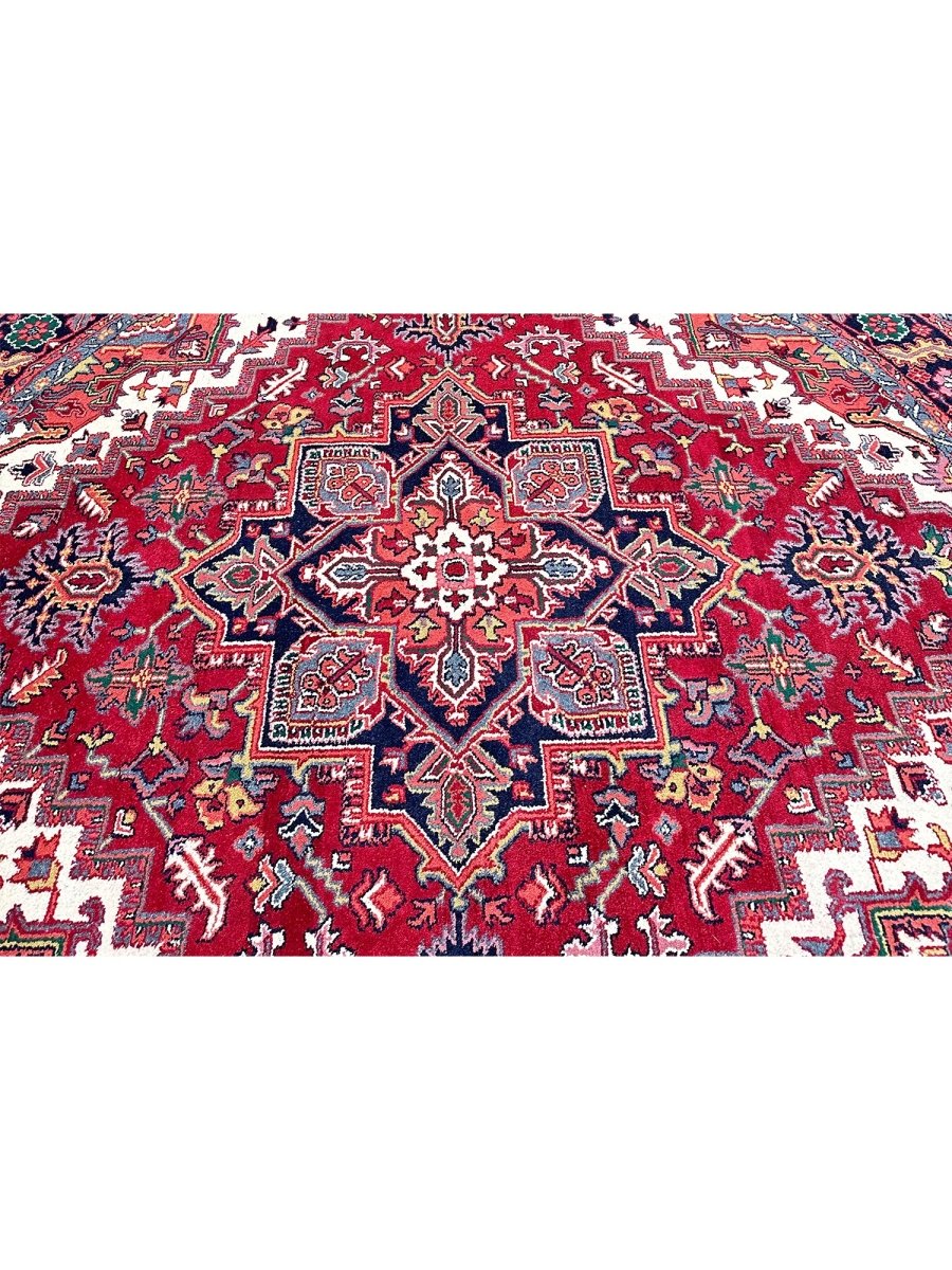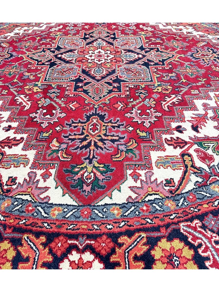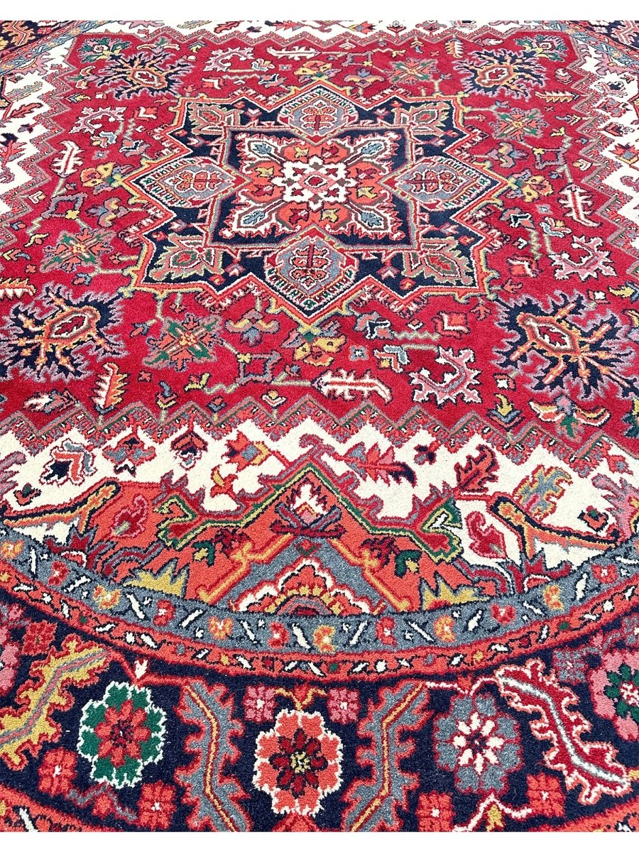 Enhance the sophistication of your home with the 8' Round Heriz Rug, a unique piece that celebrates the beauty of classic traditional handcraft in rug-making. Hand-knotted from the finest wool, this stunning rug features a Medallion pattern that infuses warmth and elegance into any room. The rich hues of red, cream, black, and yellow energize your home, making it a perfect complement to various decor styles. This exceptional rug is more than just an accessory; it's a timeless work of art that enriches the beauty of your home. Order now and enjoy free US shipping.