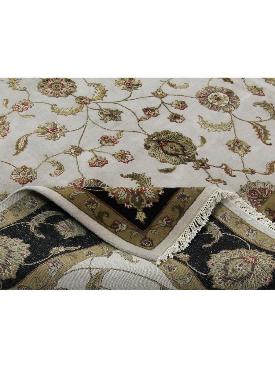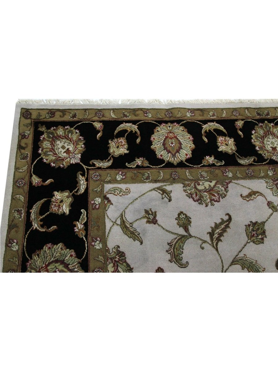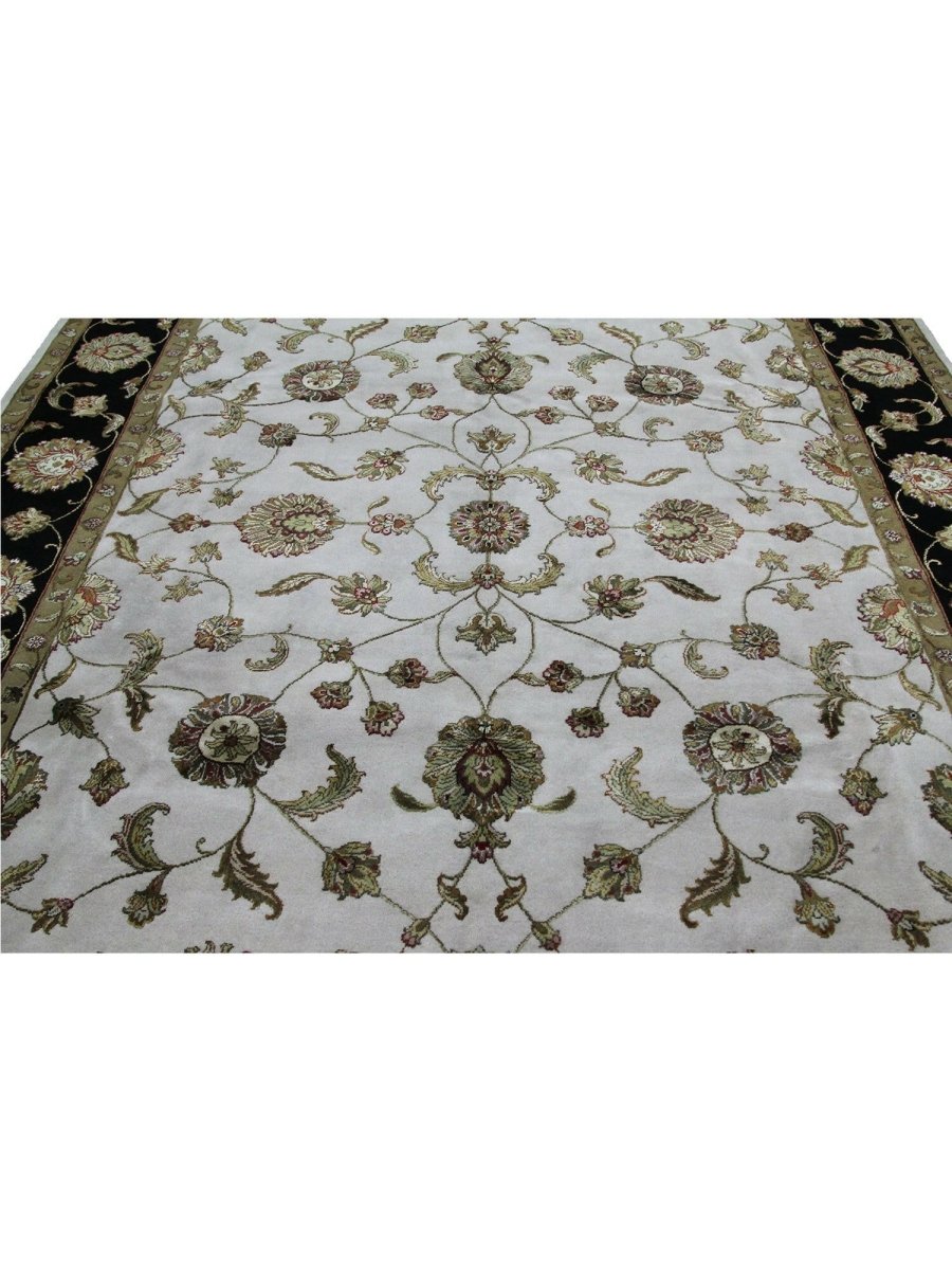 Add a touch of striking beauty to your home with this 8x10 handwoven Tabriz Style Area Rug, crafted in India. This rug features a captivating floral pattern, showcasing traditional motifs in a dramatic ivory, black, and beige palette. Its hand-knotted wool and silk construction ensures durability and lasting beauty and is perfect for living rooms, dining areas, or bedrooms. The intricate border detail reflects the artisan's skill and timeless design heritage. This piece effortlessly complements, adding warmth, texture, and sophistication. A true blend of artistry and function, it easily brings heritage charm into any space. Enjoy the benefit of free shipping across the United States. Each rug is one-of-a-kind, with subtle variations highlighting its handmade nature.