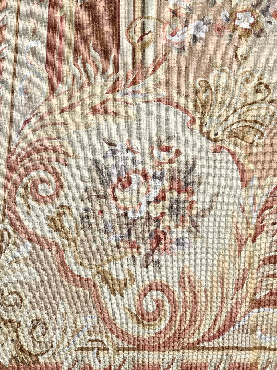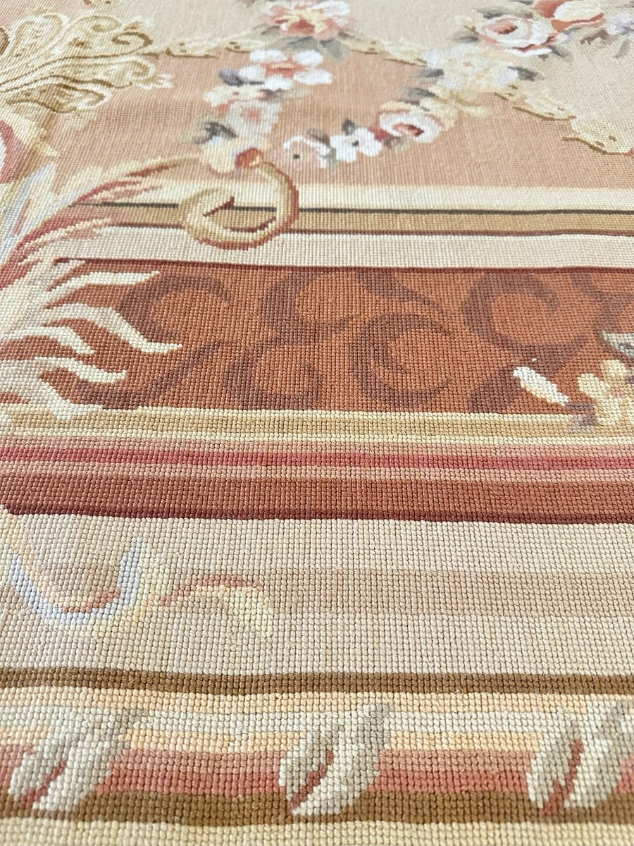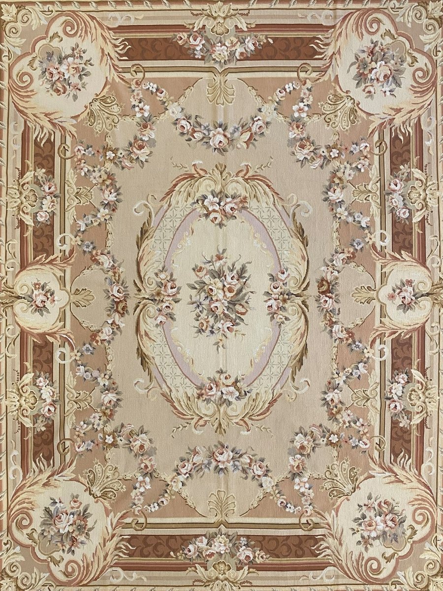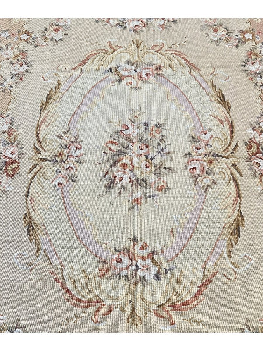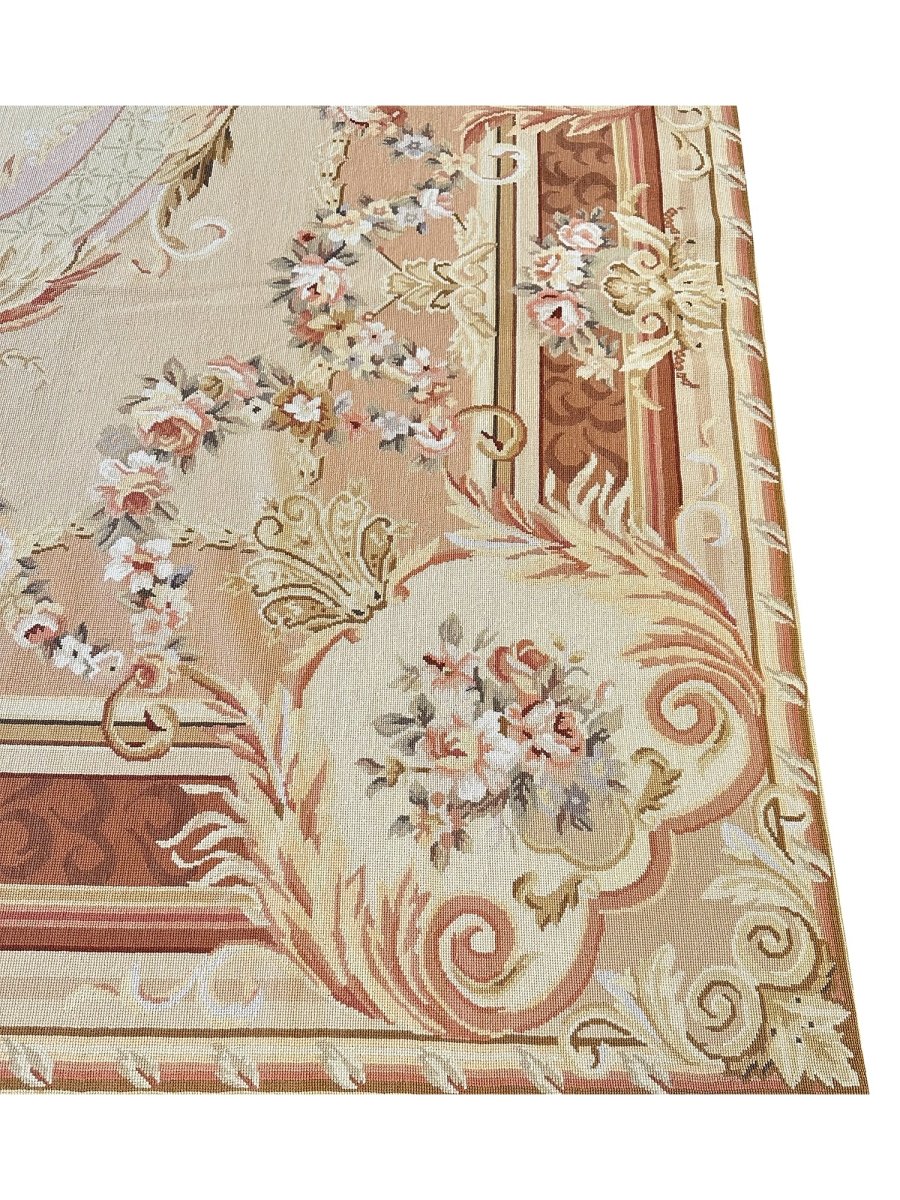 This 8' x 10' Aubusson Style Needlepoint Area Rug embodies classic French elegance with a richly detailed floral design and warm, refined tones. Set on a soft cream ground, the rug features an ornate central medallion adorned with delicate floral sprays, scrolling acanthus leaves, and symmetrical garlands highlighted with subtle gold accents. Layers of decorative borders in warm brown, beige, soft gold, and gentle blush tones frame the composition, adding depth and balanced architectural detail.