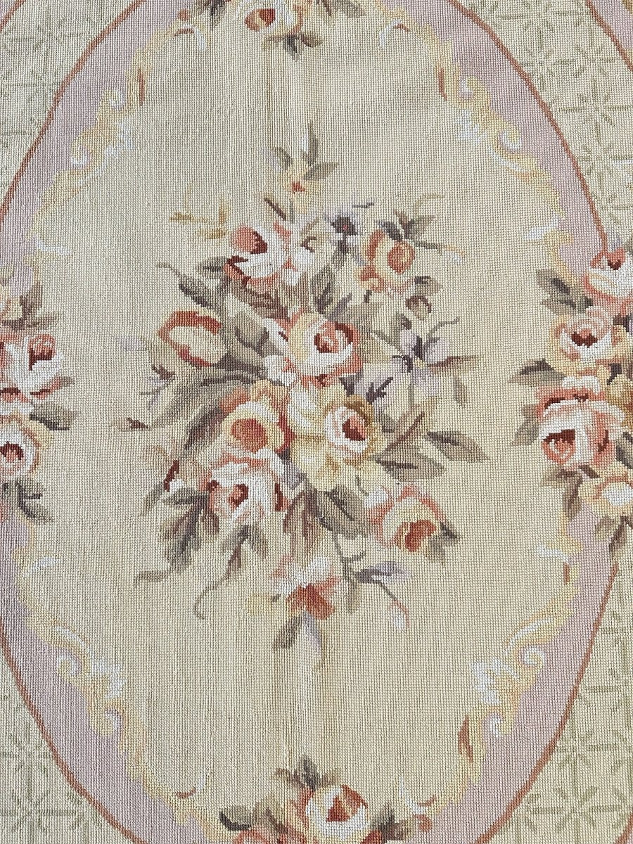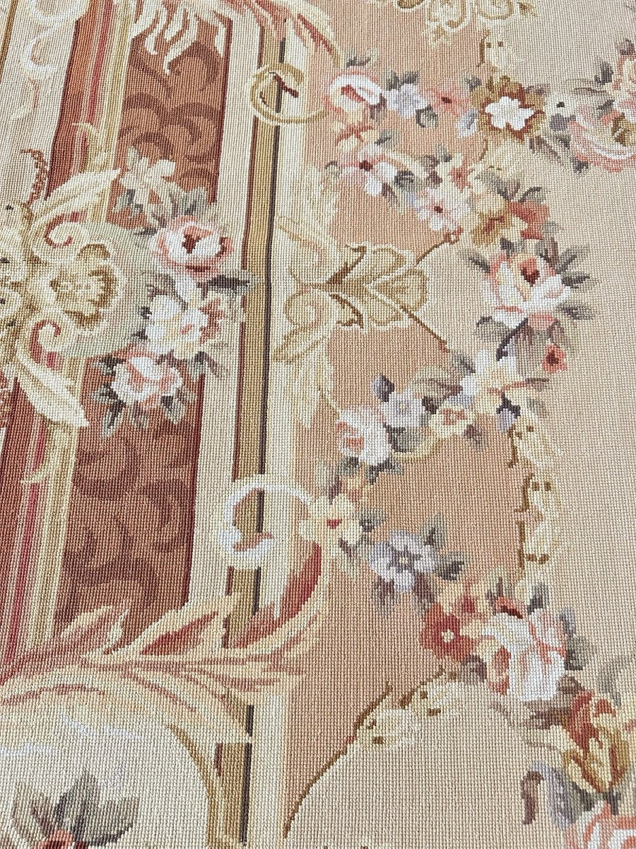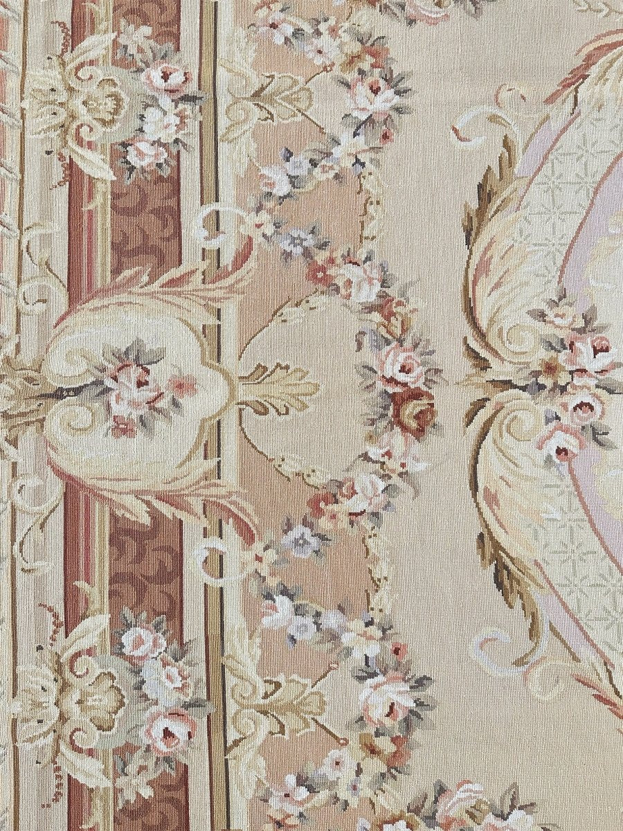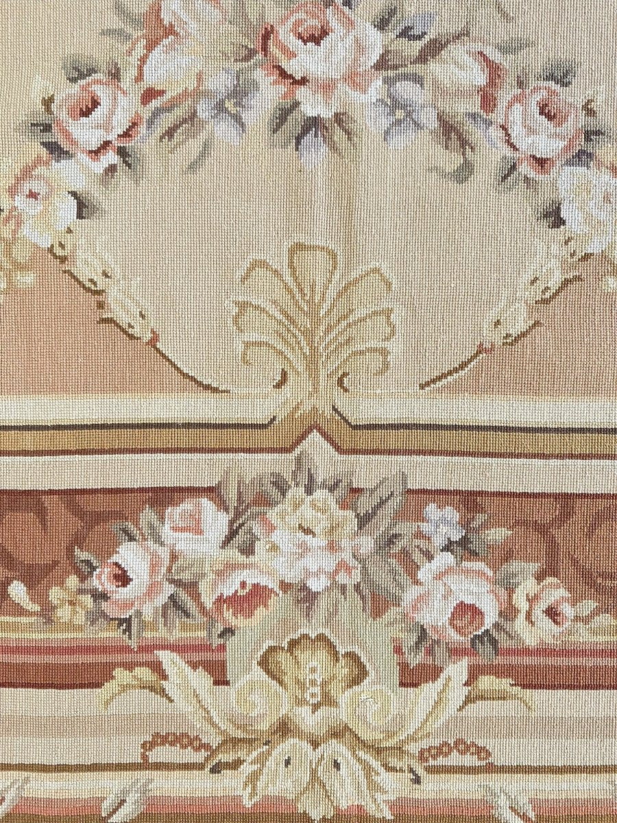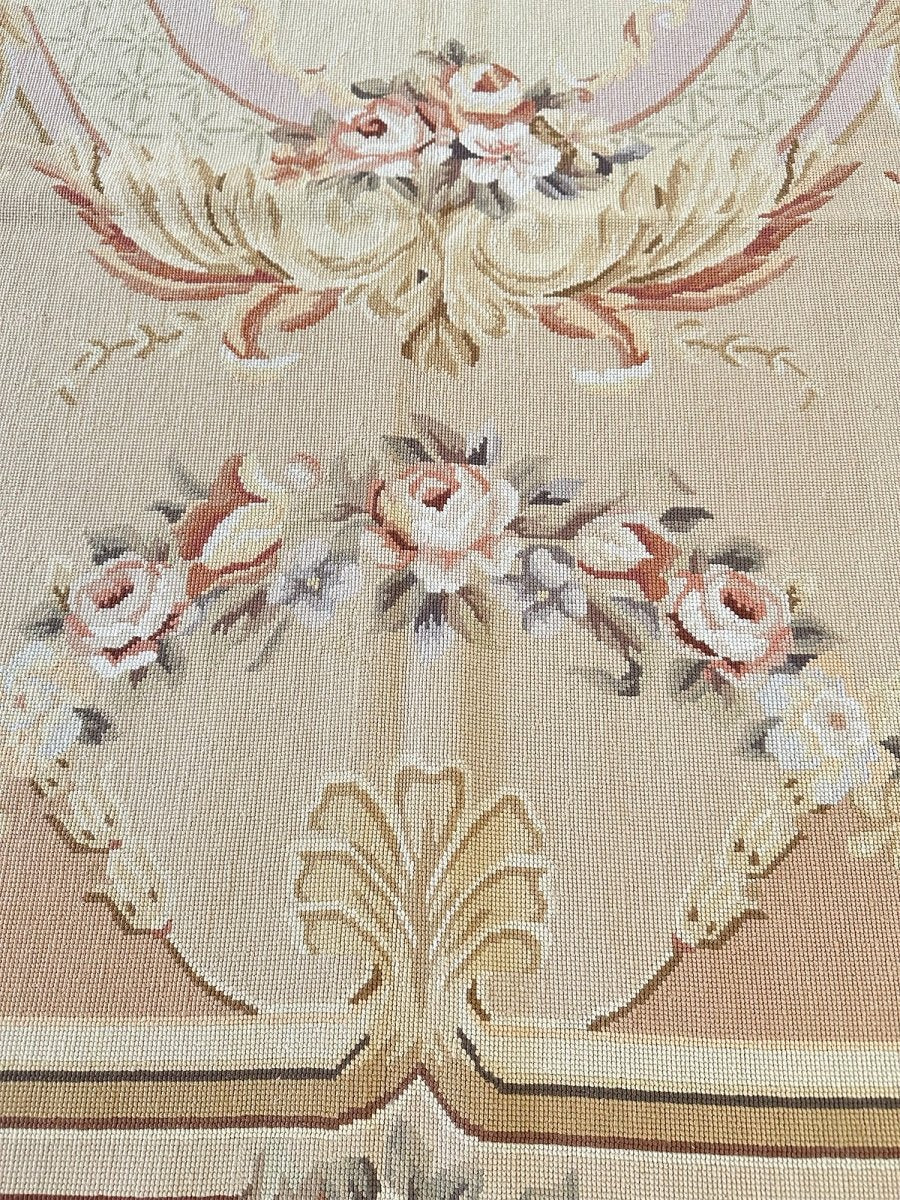This 8' x 10' Aubusson Style Needlepoint Area Rug embodies classic French elegance with a richly detailed floral design and warm, refined tones. Set on a soft cream ground, the rug features an ornate central medallion adorned with delicate floral sprays, scrolling acanthus leaves, and symmetrical garlands highlighted with subtle gold accents. Layers of decorative borders in warm brown, beige, soft gold, and gentle blush tones frame the composition, adding depth and balanced architectural detail.