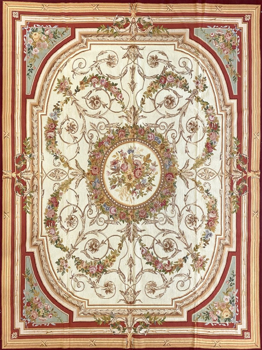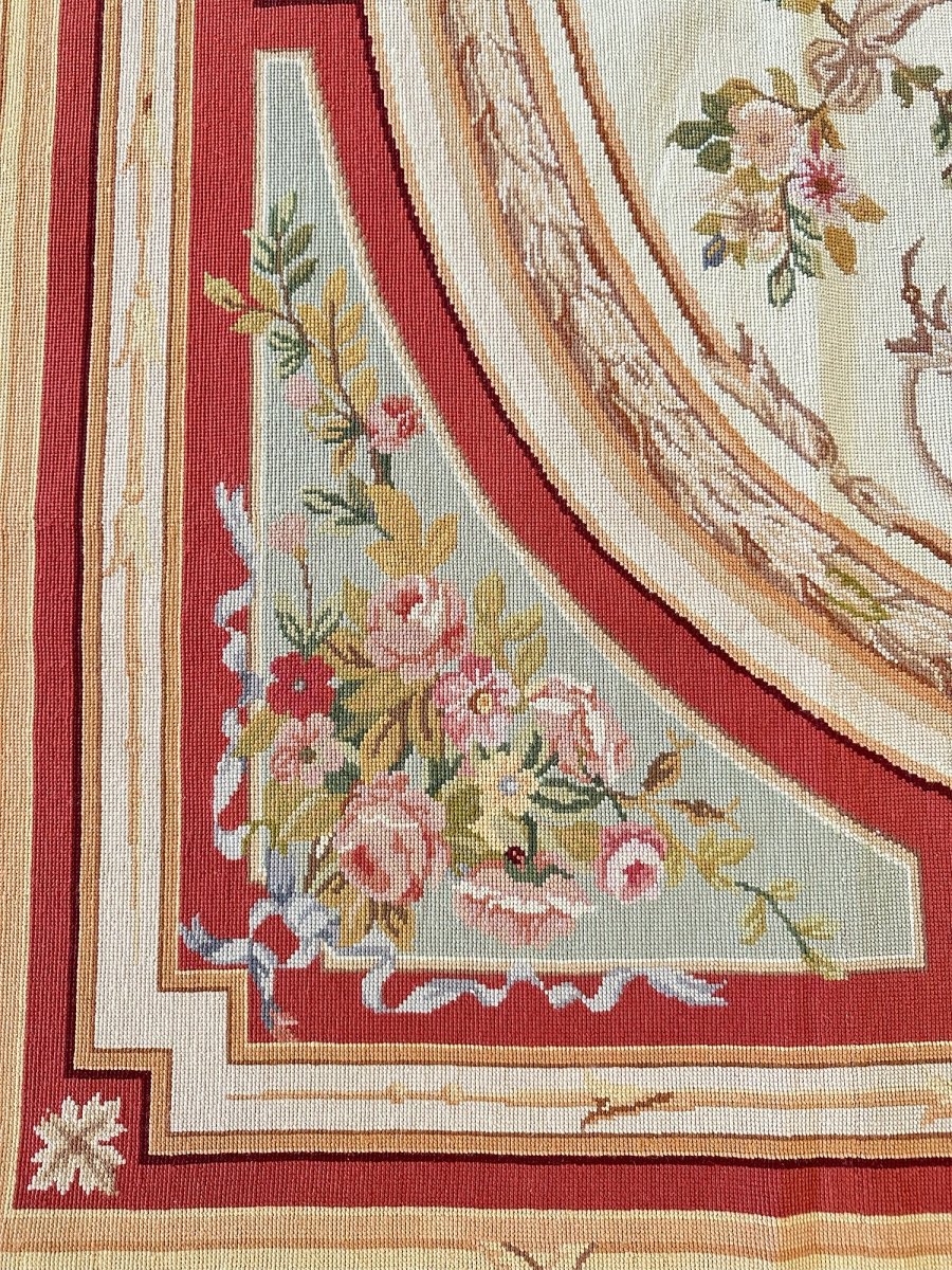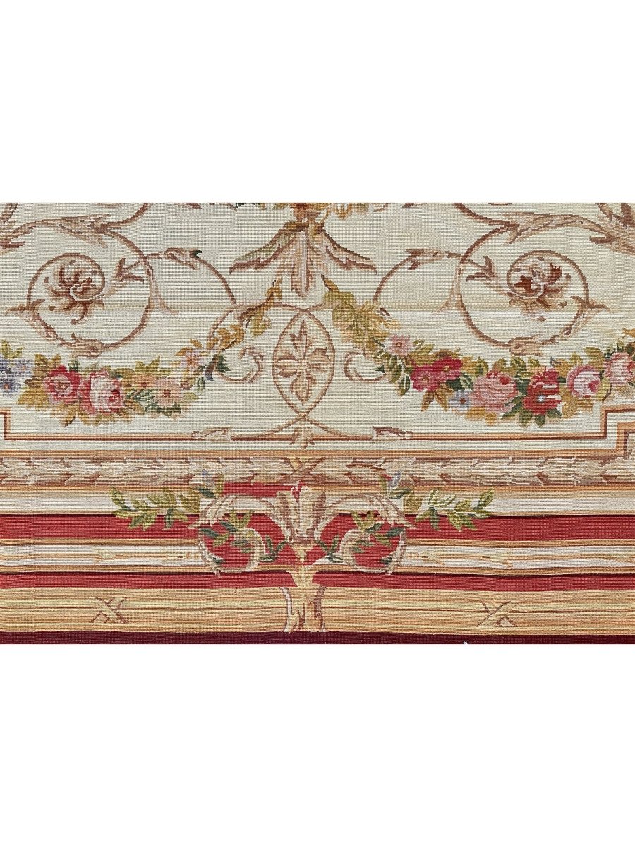 This 8' x 10' French Style Needlepoint Area Rug presents an elegant, flower-inspired design rooted in classical European tradition. An ivory ground sets the stage for a richly detailed central floral medallion, composed of roses and delicate blossoms in soft multicolor hues, surrounded by flowing acanthus scrolls, floral garlands, and symmetrical vinework. An ornate architectural border with warm accents of red, gold, sage, and blush frames the composition, adding depth and sophistication.