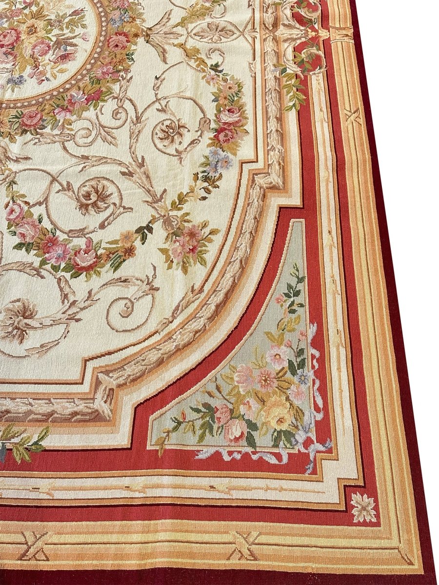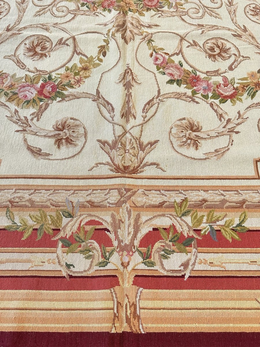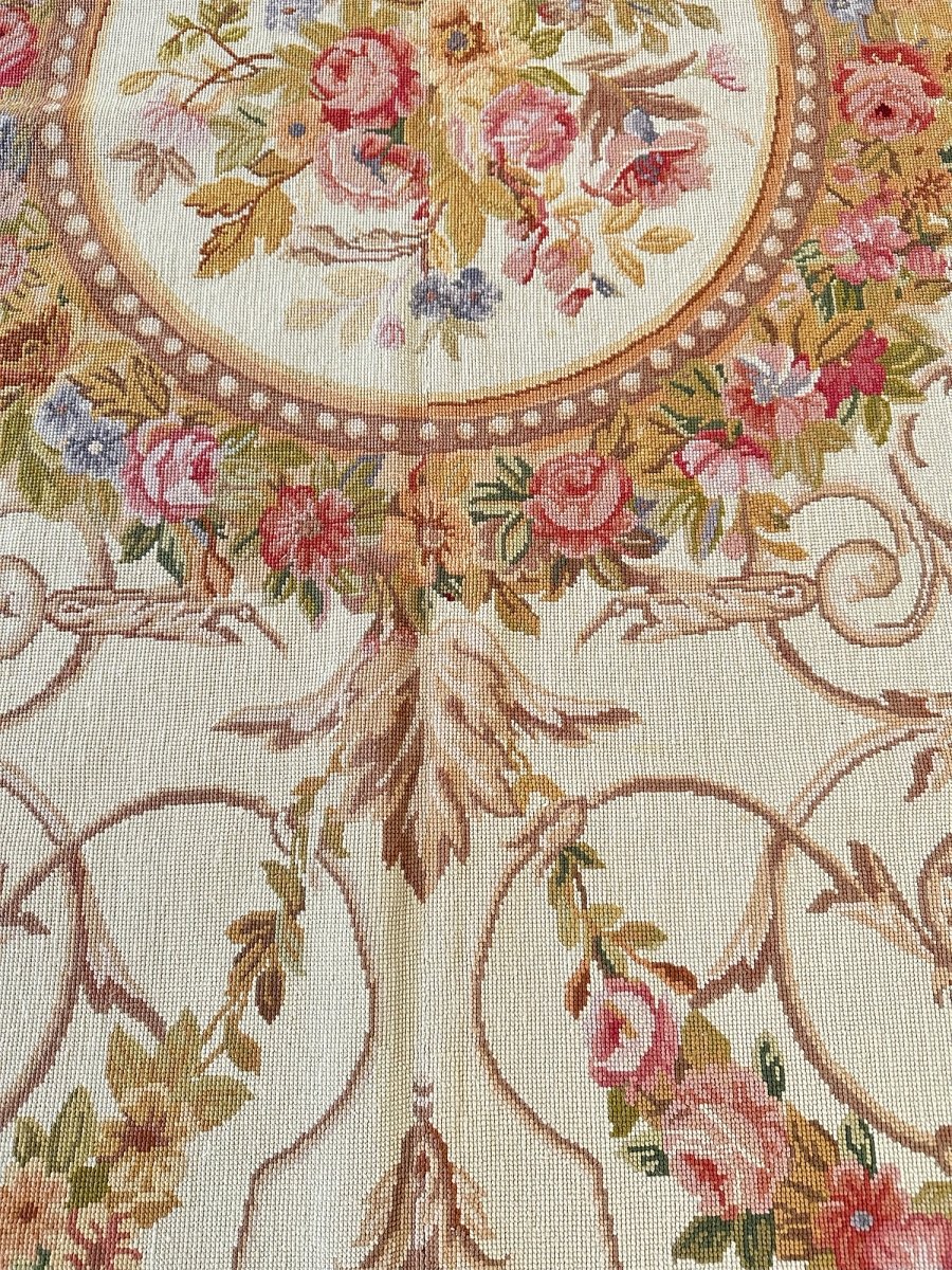 This 8' x 10' French Style Needlepoint Area Rug presents an elegant, flower-inspired design rooted in classical European tradition. An ivory ground sets the stage for a richly detailed central floral medallion, composed of roses and delicate blossoms in soft multicolor hues, surrounded by flowing acanthus scrolls, floral garlands, and symmetrical vinework. An ornate architectural border with warm accents of red, gold, sage, and blush frames the composition, adding depth and sophistication.