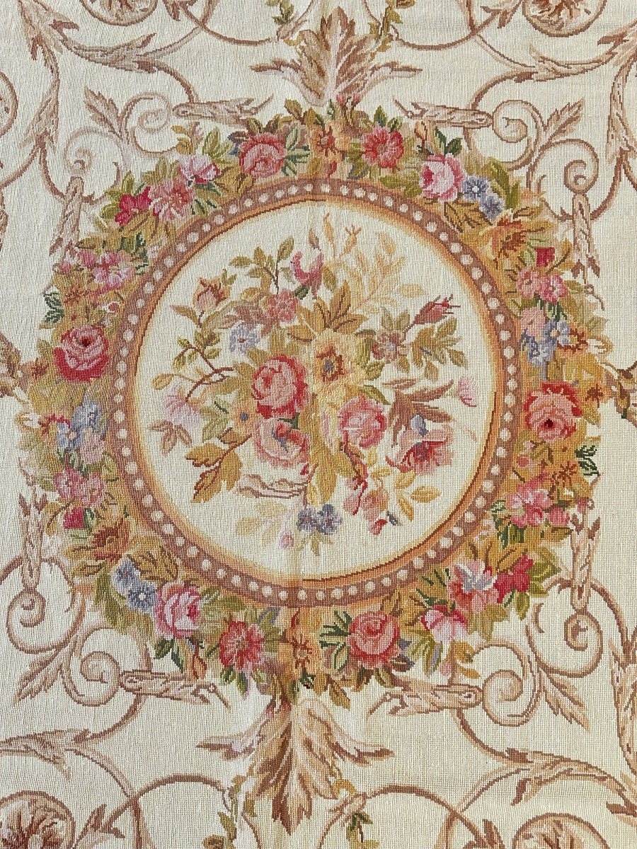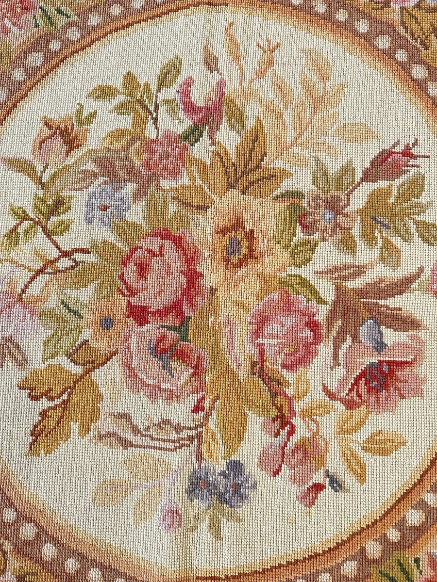 Handcrafted from wool, this needlepoint rug offers a smooth, tapestry-like texture, combining durability with decorative artistry. Made in China and new in condition, it brings timeless refinement and visual elegance.