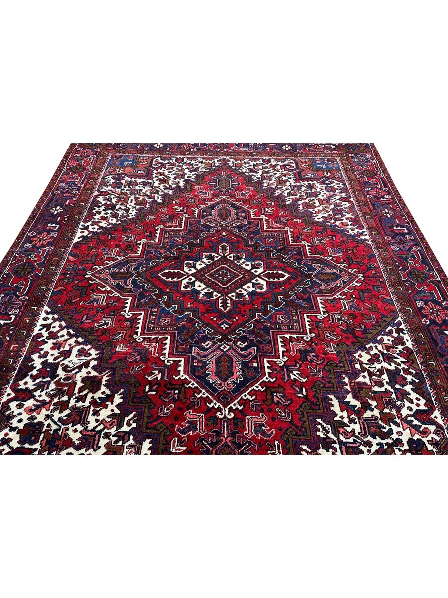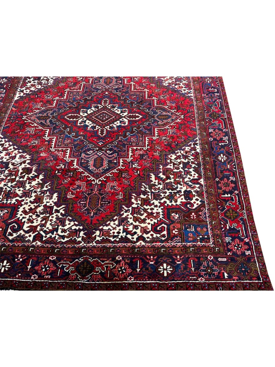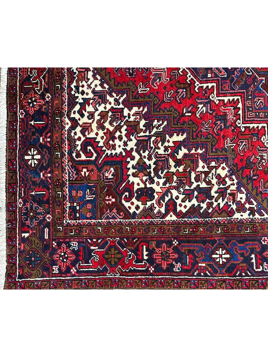 Upgrade your space with the vibrant elegance of this stunning 8x10 old Persian Heriz area rug. Originating from Persia, this rug showcases traditional craftsmanship, featuring a beautiful hand-knotted construction that showcases the skill and expertise of the artisan. The red, blue, and white hues create a bold and eye-catching color palette that's perfect for adding a touch of excitement to any room. The geometric pattern of this rug is truly eye-catching, with bright hues that seem to dance across the surface. Whether you want to add a touch of elegance to your living room or create a cozy and inviting atmosphere in your bedroom, this rug will surely impress. With its durable construction and high-quality materials, this rug will withstand the test of time and remain a beautiful addition to your home for years to come.