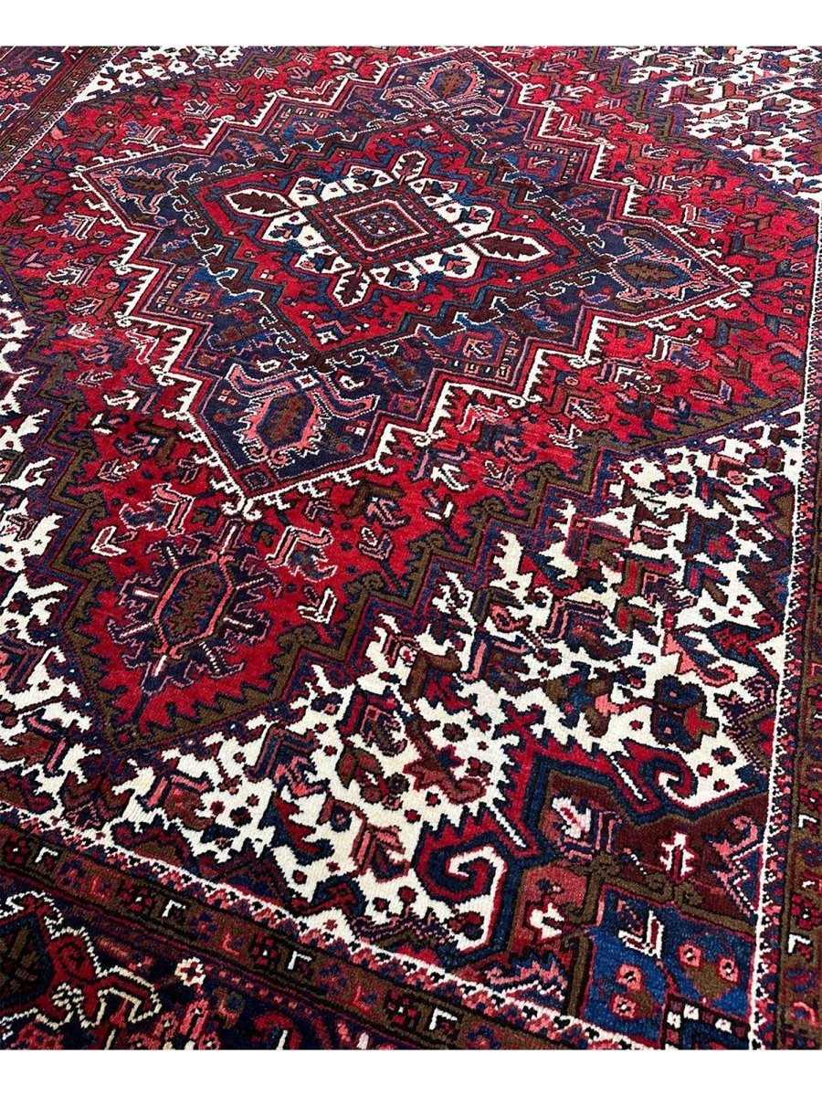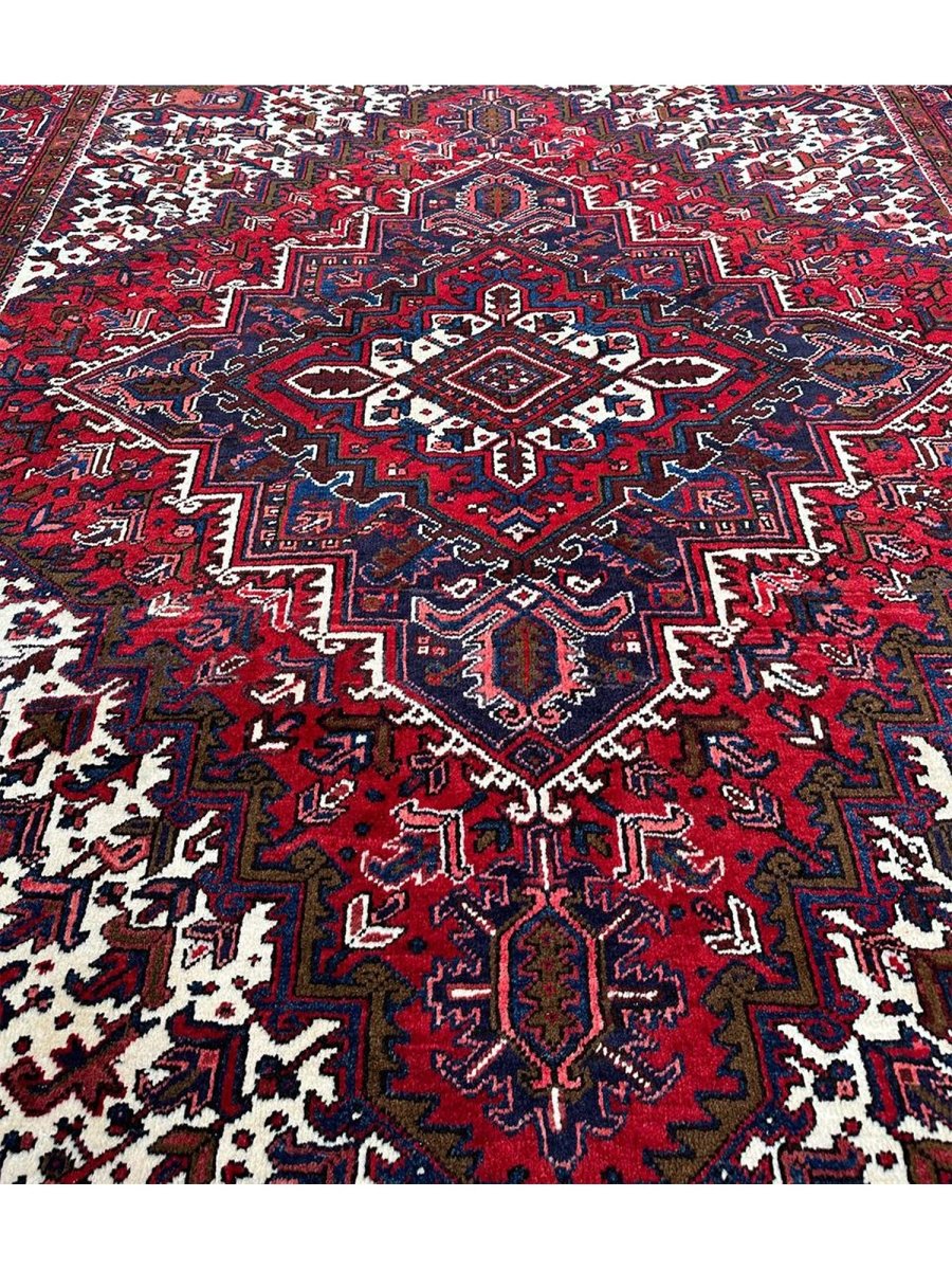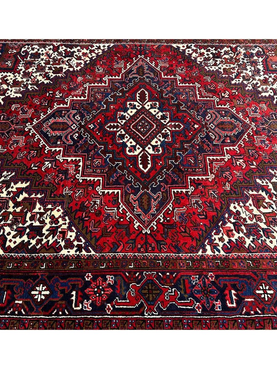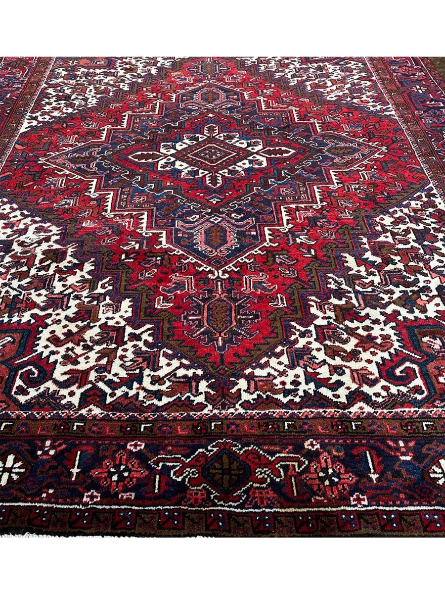 Upgrade your space with the vibrant elegance of this stunning 8x10 old Persian Heriz area rug. Originating from Persia, this rug showcases traditional craftsmanship, featuring a beautiful hand-knotted construction that showcases the skill and expertise of the artisan. The red, blue, and white hues create a bold and eye-catching color palette that's perfect for adding a touch of excitement to any room. The geometric pattern of this rug is truly eye-catching, with bright hues that seem to dance across the surface. Whether you want to add a touch of elegance to your living room or create a cozy and inviting atmosphere in your bedroom, this rug will surely impress. With its durable construction and high-quality materials, this rug will withstand the test of time and remain a beautiful addition to your home for years to come.