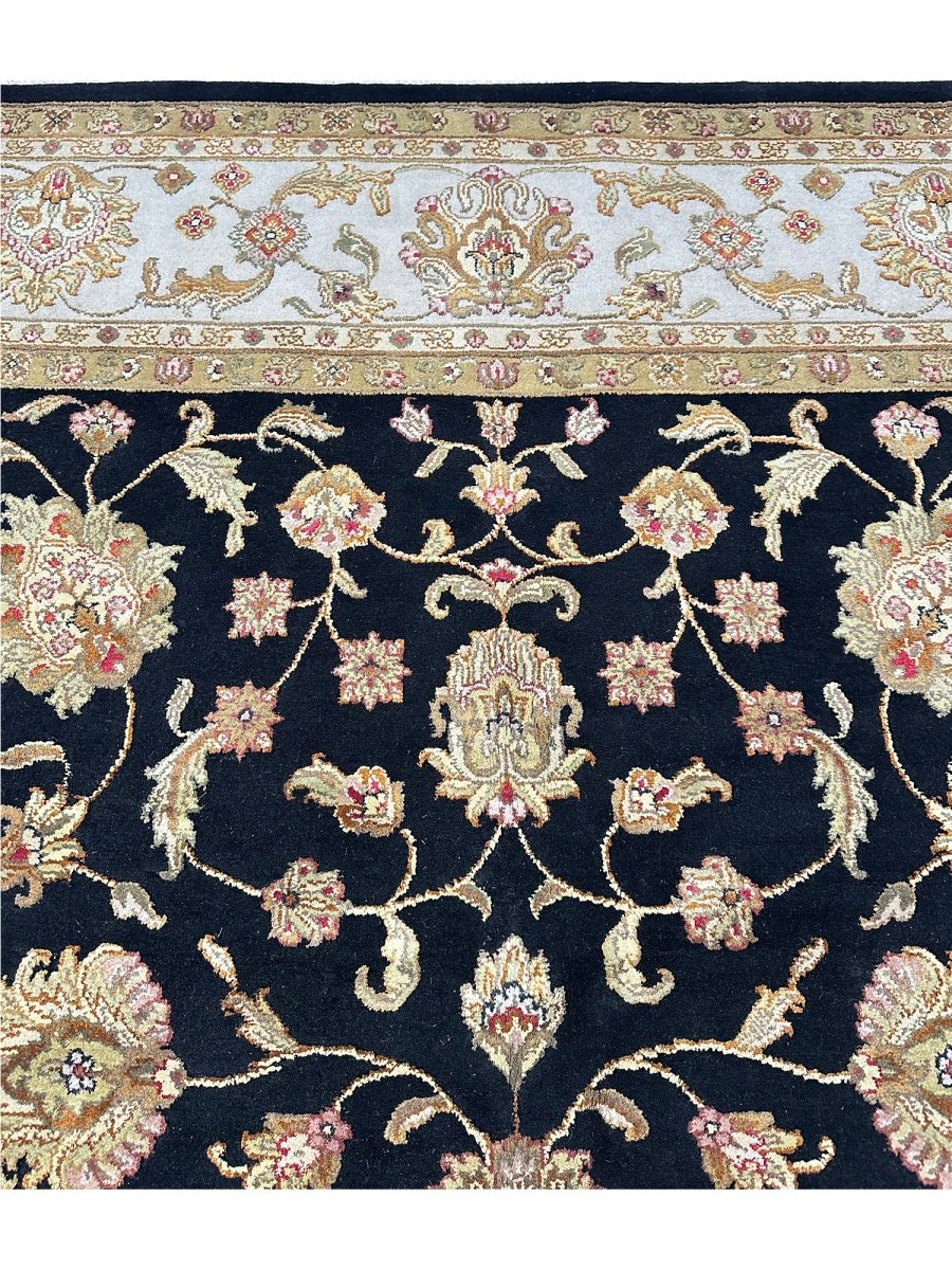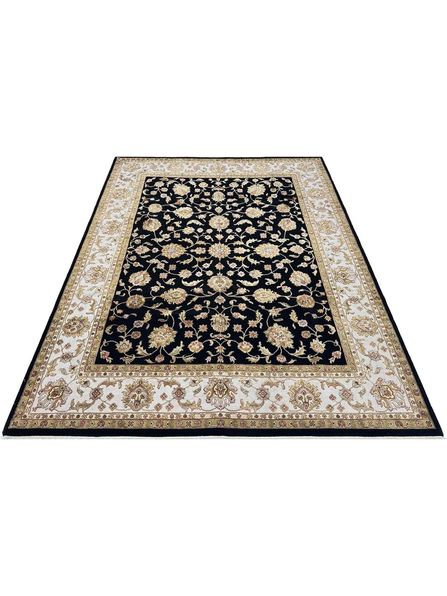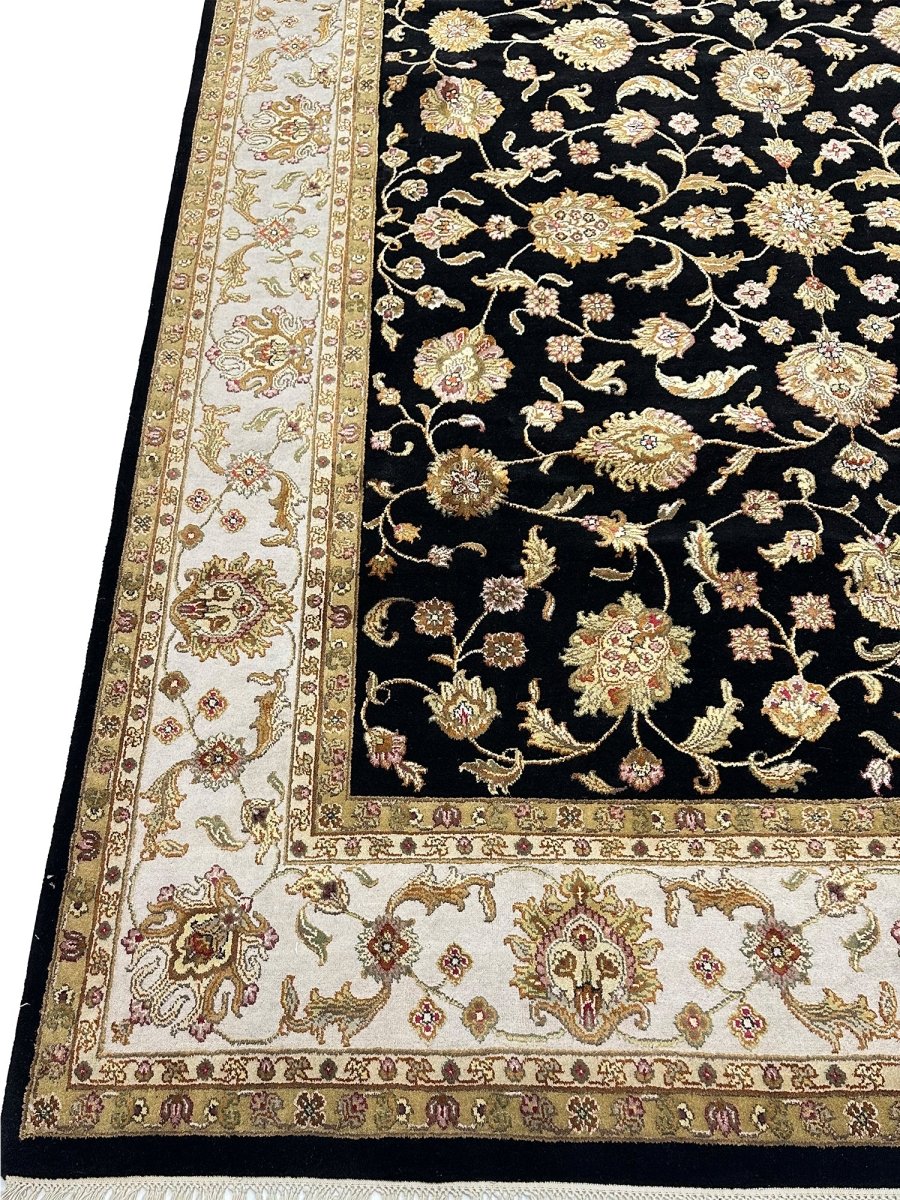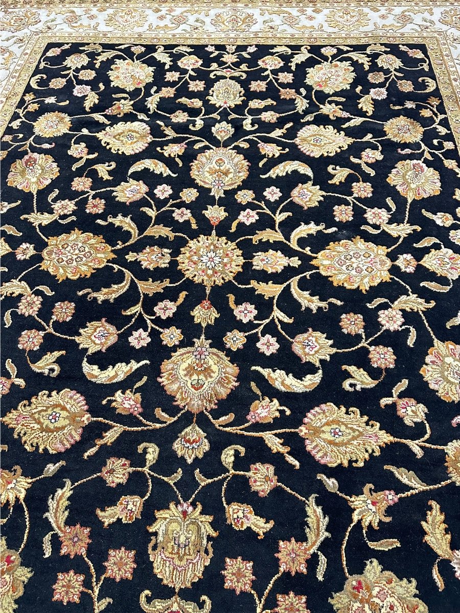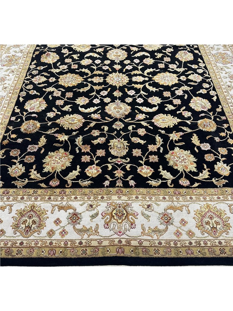 Decorate your space with the classic beauty of this 8x10 Tabriz Style area rug, handmade in India from wool. This rug features a dense, all-over floral pattern across the surface. Intricate design of blossoms, vines, and motifs brings a sense of timeless artistry. The field is rich, with a deep black hue, providing a dramatic backdrop to detailed patterns. A contrasting light border in ivory frames a rug beautifully. Floral patterns within the field are detailed with a palette that includes soft beige, warm gold, brown, red, and pink, adding visual complexity. Crafted using traditional hand-knotting techniques, this high-quality wool rug offers lasting durability and a soft, luxurious feel underfoot. Enjoy free US shipping.