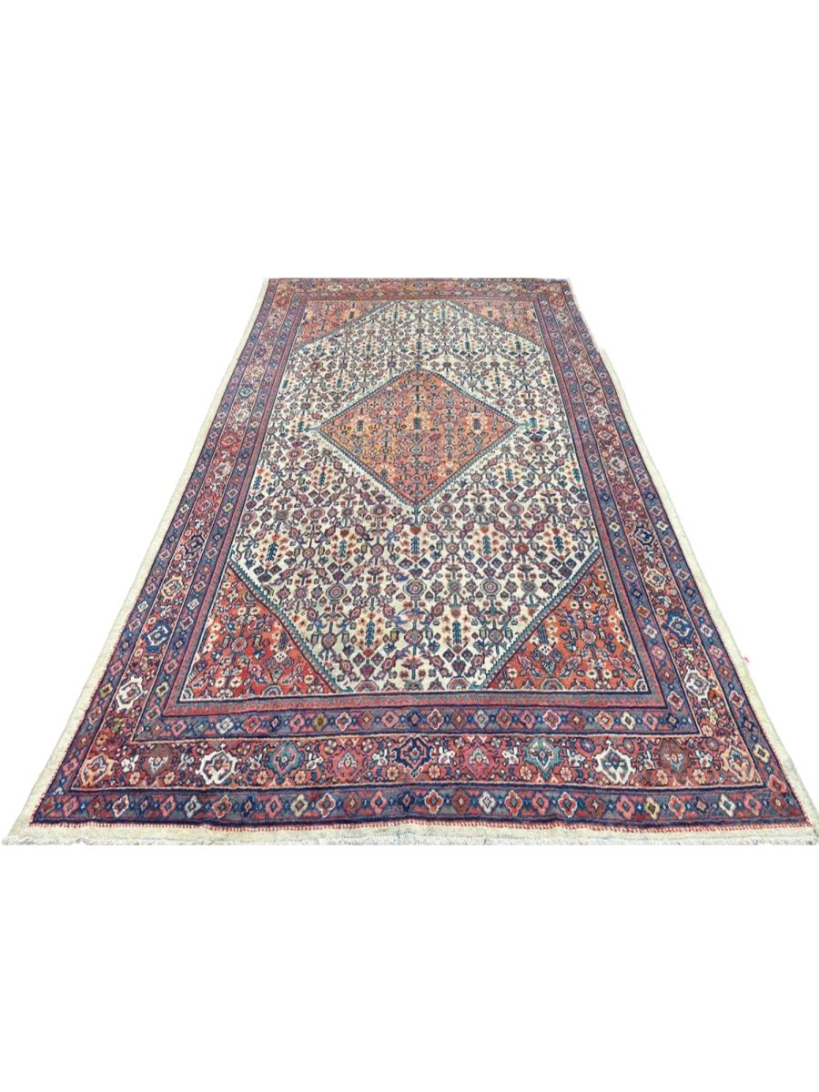 Decorate your space with the striking beauty of this 9x13 Antique Persian Mahal area rug. Handmade in Persia from wool, the magnificent rug showcases a commanding central medallion design. The background presents a beautiful ivory tone, providing a classic backdrop to vibrant patterns. The rich, intricate design and geometric motifs have a color palette of rich red, striking blue, rust, and a hint of orange accents. This generously sized piece is perfect for anchoring spacious bedrooms, living rooms, or dining areas. Crafted with traditional hand-making techniques, this wool rug offers enduring durability and a soft touch underfoot. Enjoy the convenience of free and fast delivery within the United States.