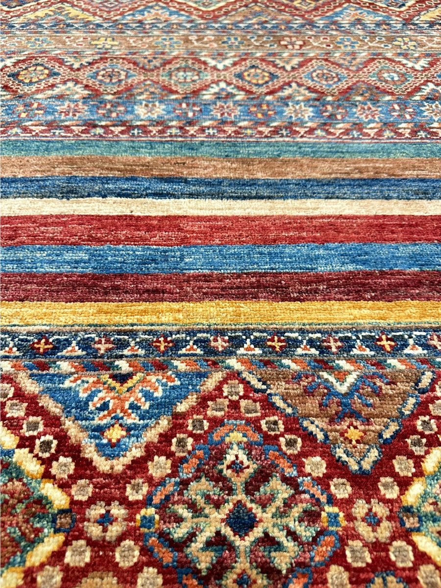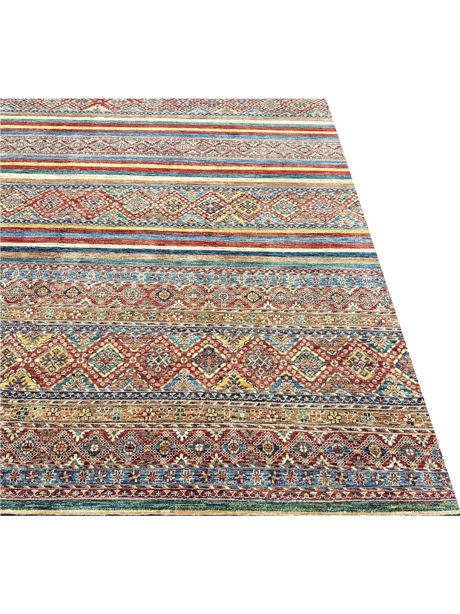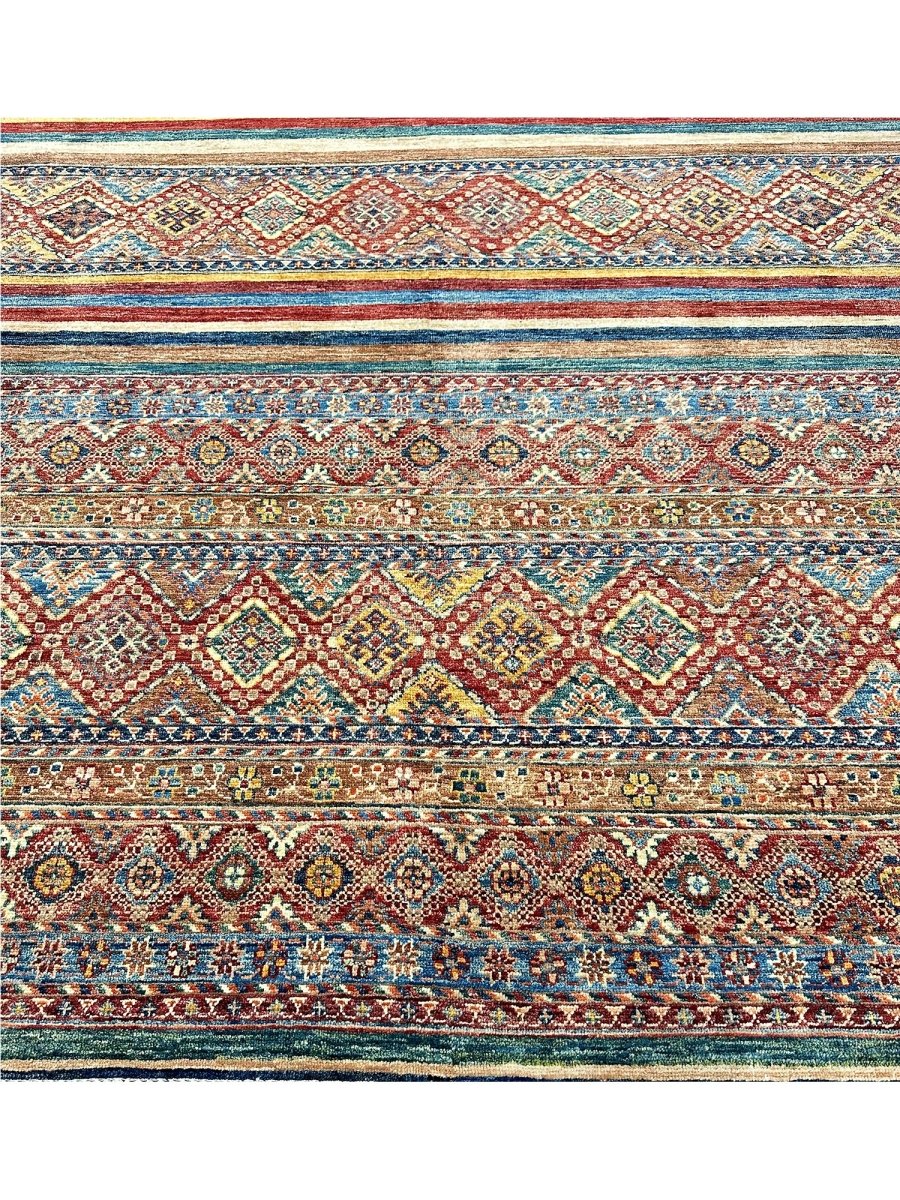 Make a bold statement with the 9x13 Handwoven Tribal Area Rug, a one-of-a-kind creation that adds striking visual texture to your space. Hand-knotted from pure wool, this rug showcases a vivid geometric pattern in rust, yellow, and blue, making it a standout piece for spacious living rooms, dining spaces, or offices. Its generous size provides ample coverage, anchoring furniture arrangements while enhancing the overall ambiance. The distinctive pattern adds artistic flair, while the soft wool offers inviting warmth underfoot. Designed in Pakistan, this rug combines timeless design with everyday functionality. A true conversation starter, it enhances any interior with comfort and style. Free shipping in the US.