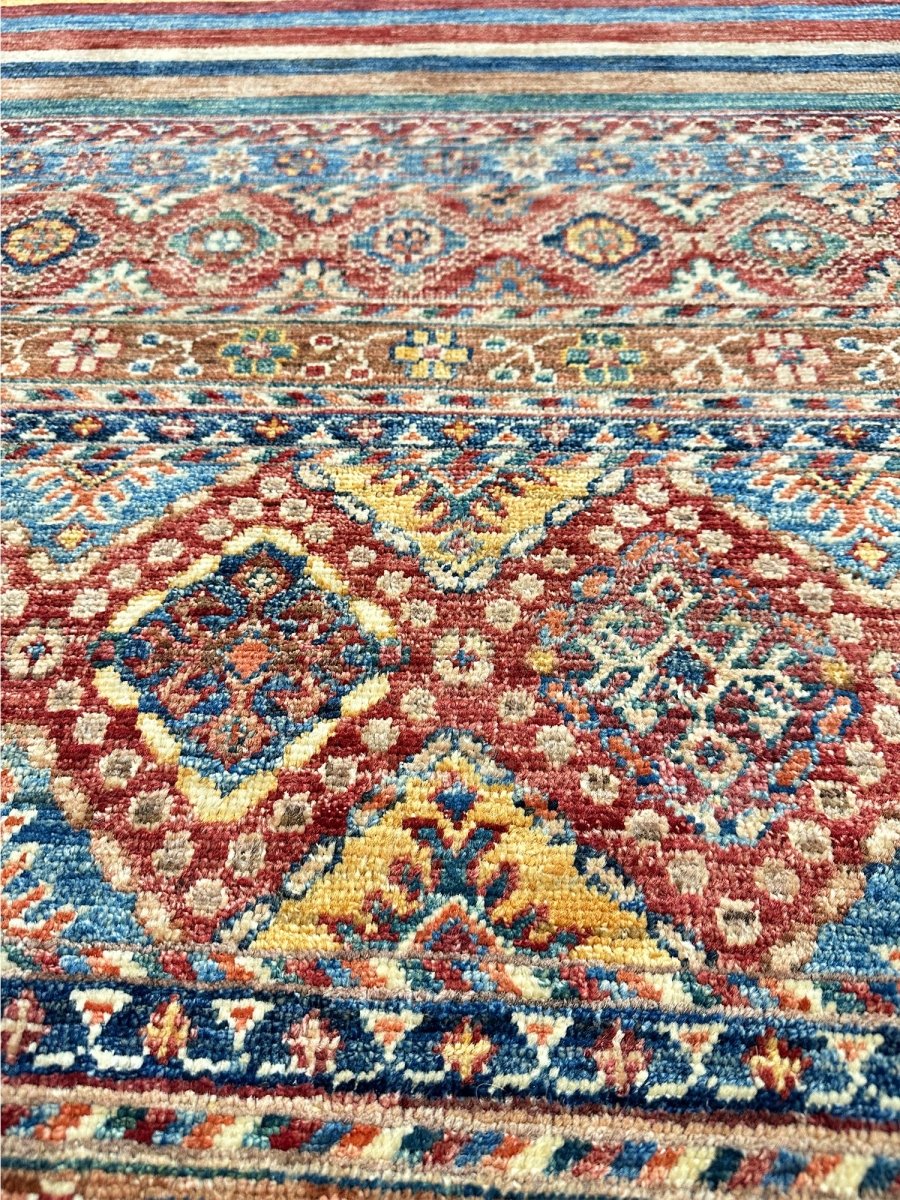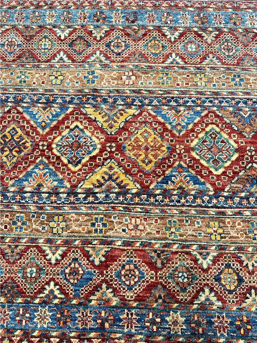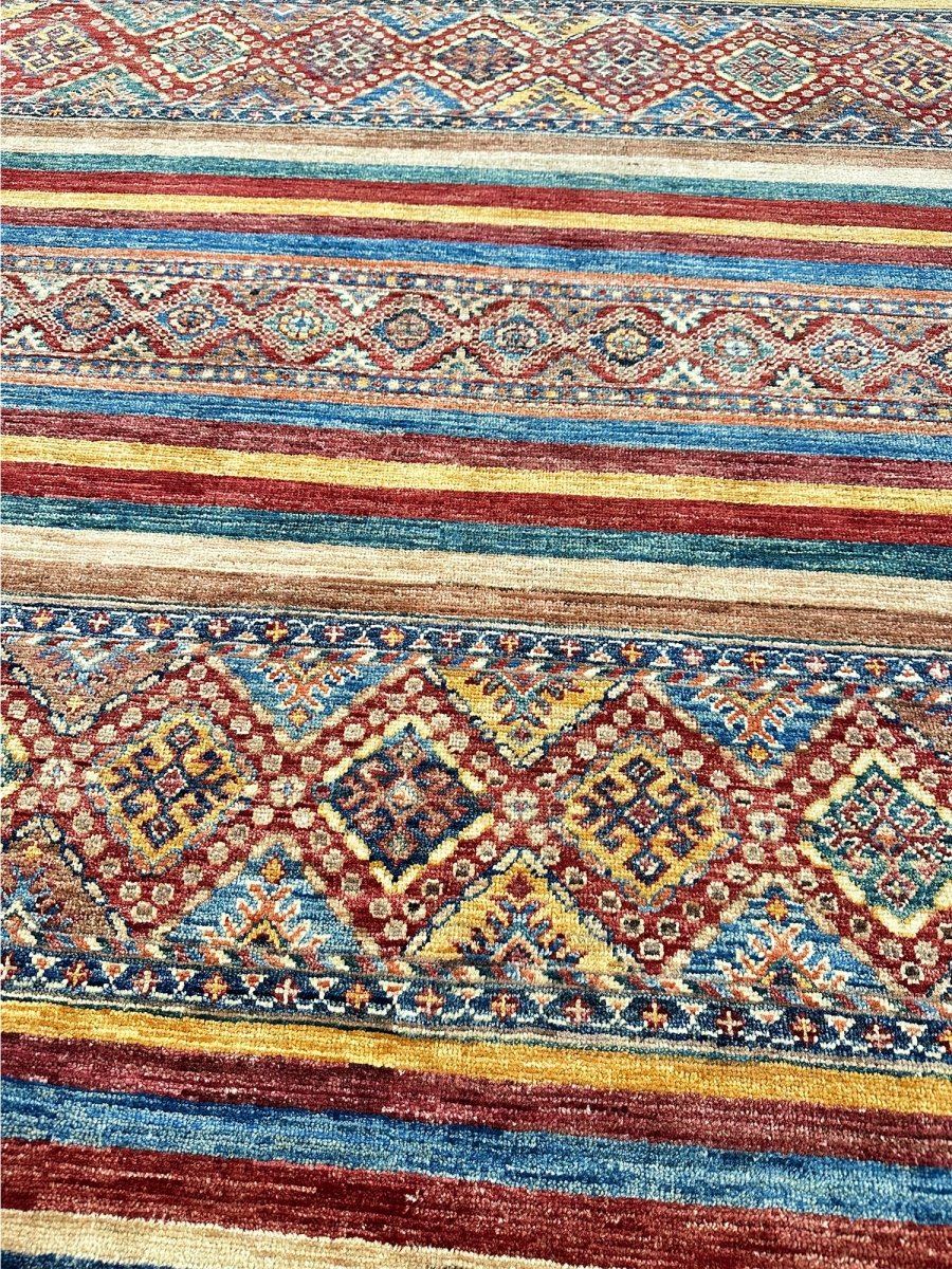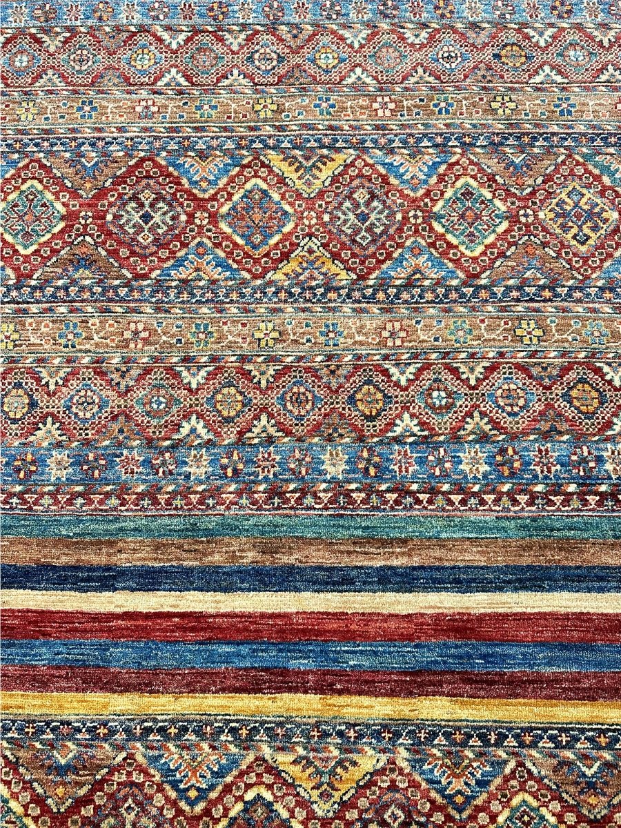 Make a bold statement with the 9x13 Handwoven Tribal Area Rug, a one-of-a-kind creation that adds striking visual texture to your space. Hand-knotted from pure wool, this rug showcases a vivid geometric pattern in rust, yellow, and blue, making it a standout piece for spacious living rooms, dining spaces, or offices. Its generous size provides ample coverage, anchoring furniture arrangements while enhancing the overall ambiance. The distinctive pattern adds artistic flair, while the soft wool offers inviting warmth underfoot. Designed in Pakistan, this rug combines timeless design with everyday functionality. A true conversation starter, it enhances any interior with comfort and style. Free shipping in the US.