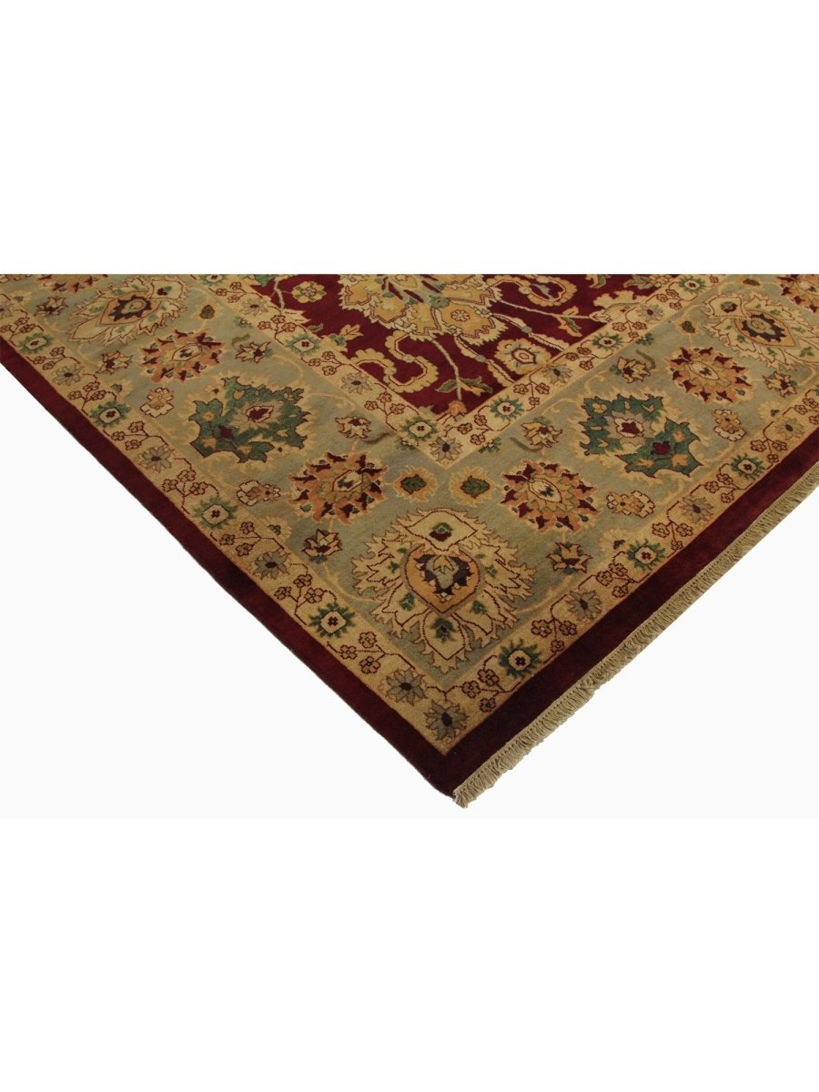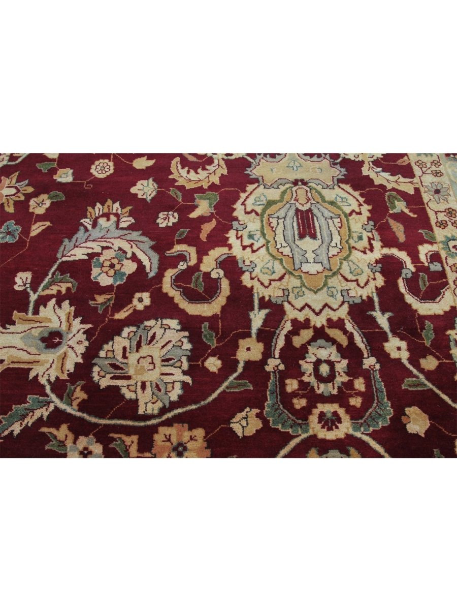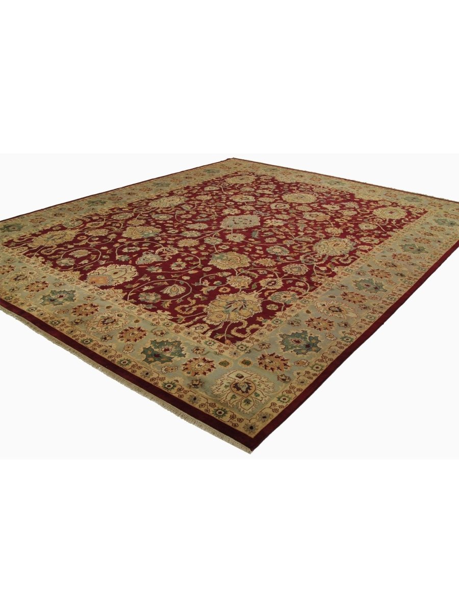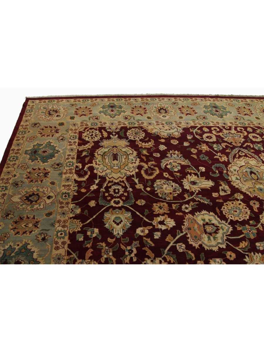 This unique 12x15 Handwoven Indian Agra Area Rug will add a touch of elegance to your home. Its floral pattern has roots in traditional design. Thanks to its burgundy base and delicate beige and green accents, it exudes old-world charm. Hand-knotted from wool, it boasts a sophisticated appearance and is long-lasting. This exquisite piece blends craftsmanship with cultural richness, making it perfect for large living rooms, executive offices, or formal dining rooms. Take advantage of free shipping on this gorgeous rug within the United States!