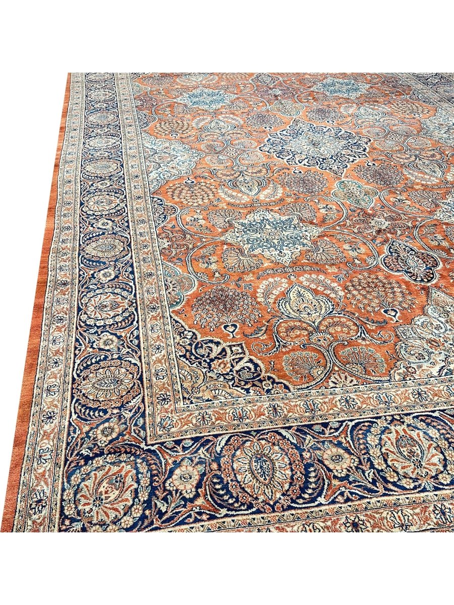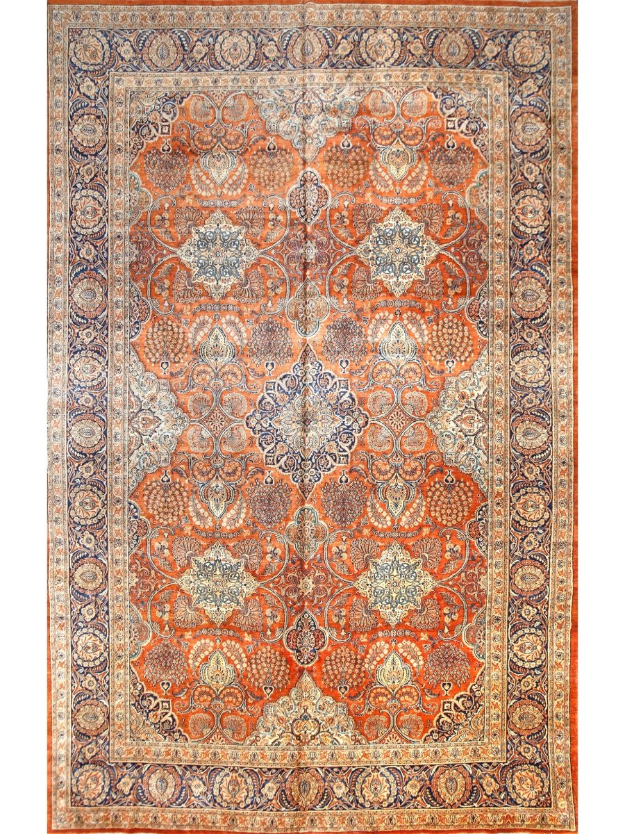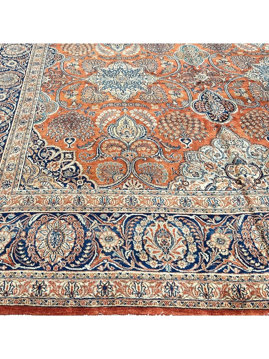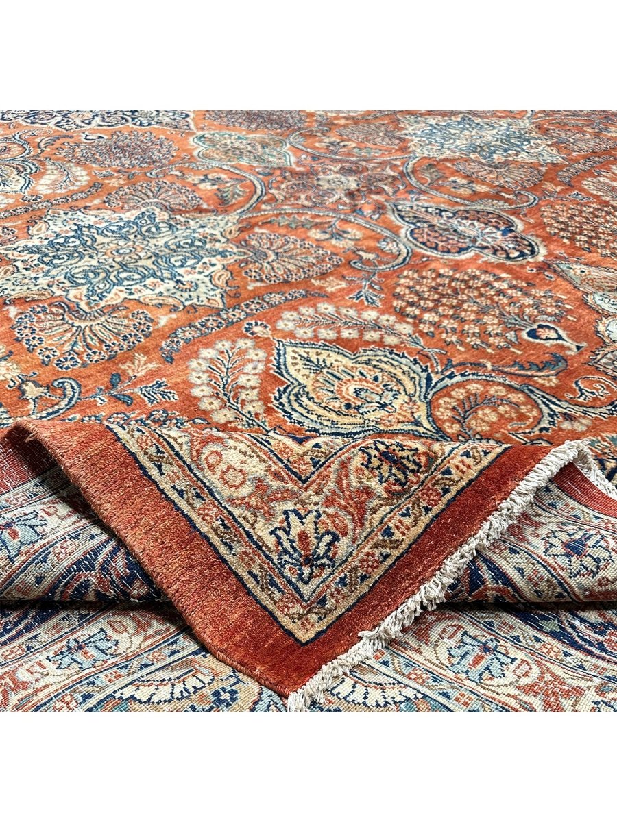 Introducing this magnificent 12x19 Old Persian Qazvin area rug, a true testament to Persian weaving artistry. Hand-knotted in Persia, this grand rug features a captivating central medallion design, beautifully complemented by intricate corner motifs and a detailed border. The color palette is rich and warm, dominated by a rust field, with medallions and accent details in striking blue ,orange, and soft ivory. Crafted from fine wool, this rug offers both exceptional durability and a luxurious feel beneath your feet. The medallion pattern is a timeless choice, perfect for anchoring an ample living space, formal dining room, or a spacious hall, creating a focal point of enduring beauty. Enjoy the convenience of free US shipping.