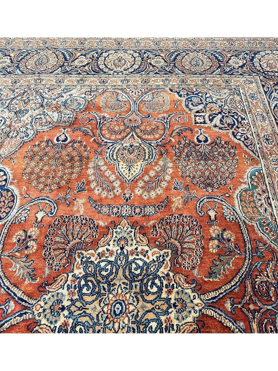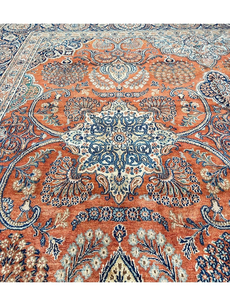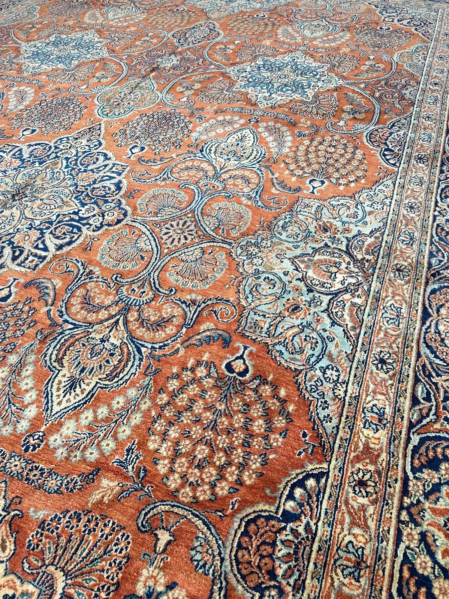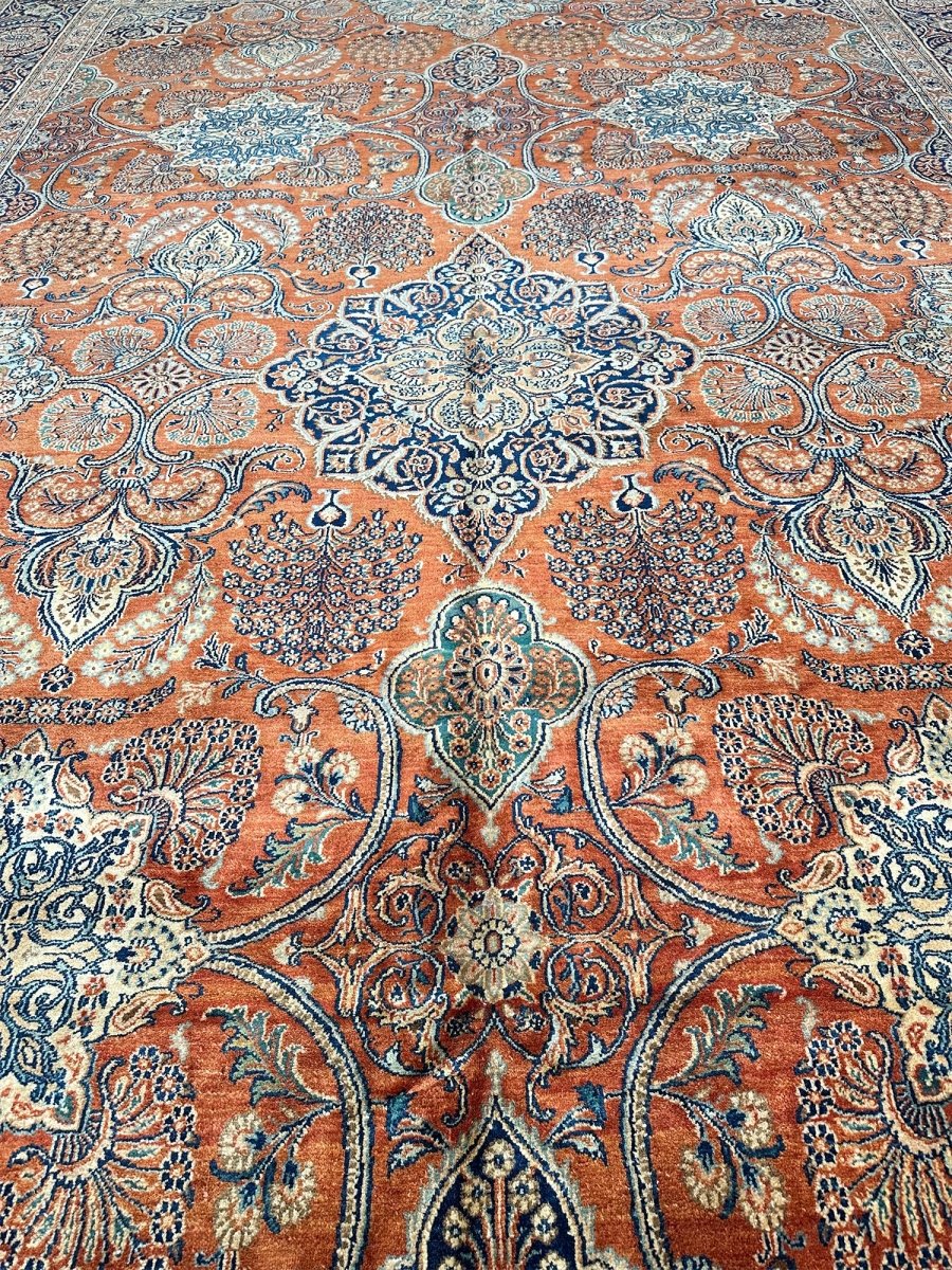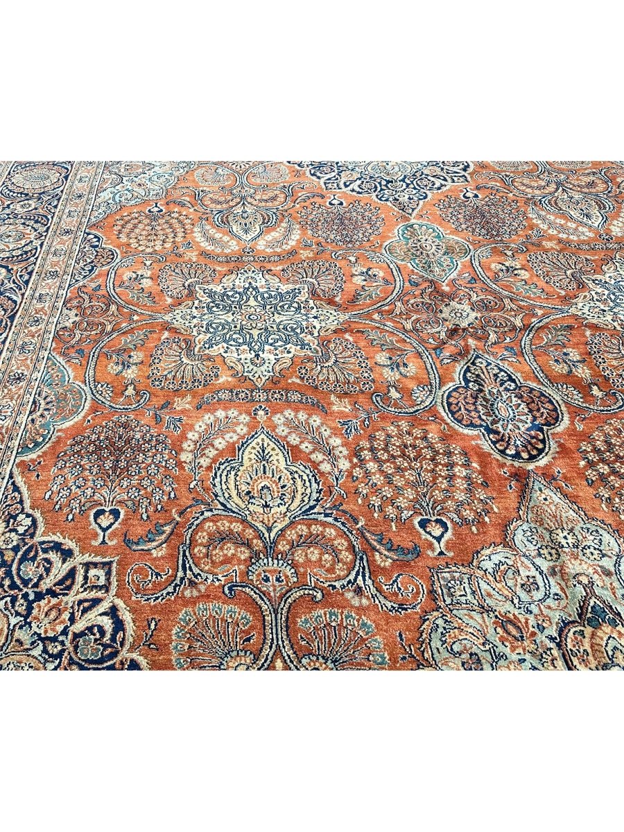 Introducing this magnificent 12x19 Old Persian Qazvin area rug, a true testament to Persian weaving artistry. Hand-knotted in Persia, this grand rug features a captivating central medallion design, beautifully complemented by intricate corner motifs and a detailed border. The color palette is rich and warm, dominated by a rust field, with medallions and accent details in striking blue ,orange, and soft ivory. Crafted from fine wool, this rug offers both exceptional durability and a luxurious feel beneath your feet. The medallion pattern is a timeless choice, perfect for anchoring an ample living space, formal dining room, or a spacious hall, creating a focal point of enduring beauty. Enjoy the convenience of free US shipping.