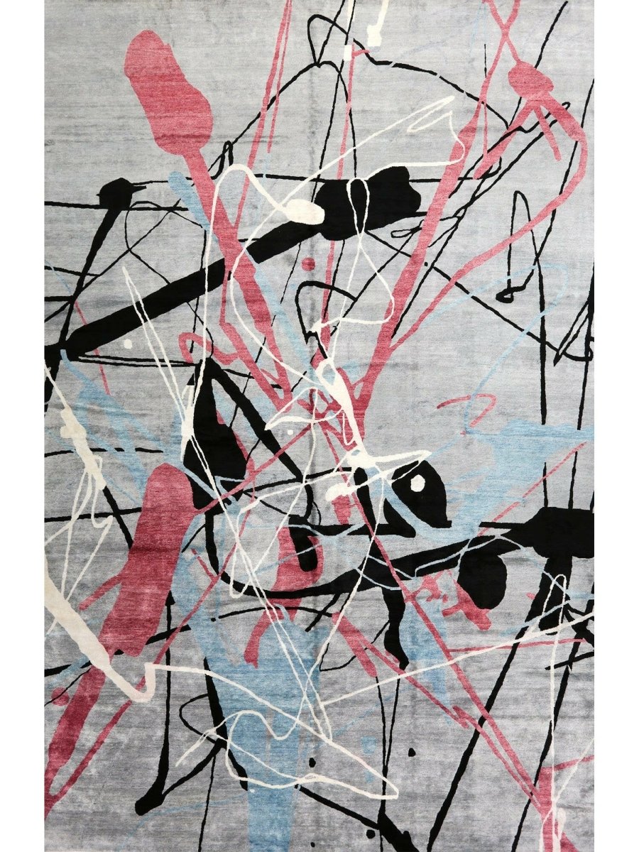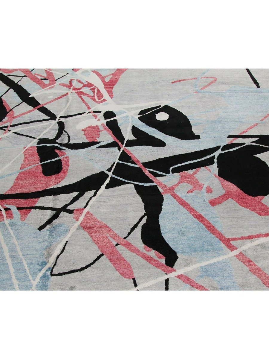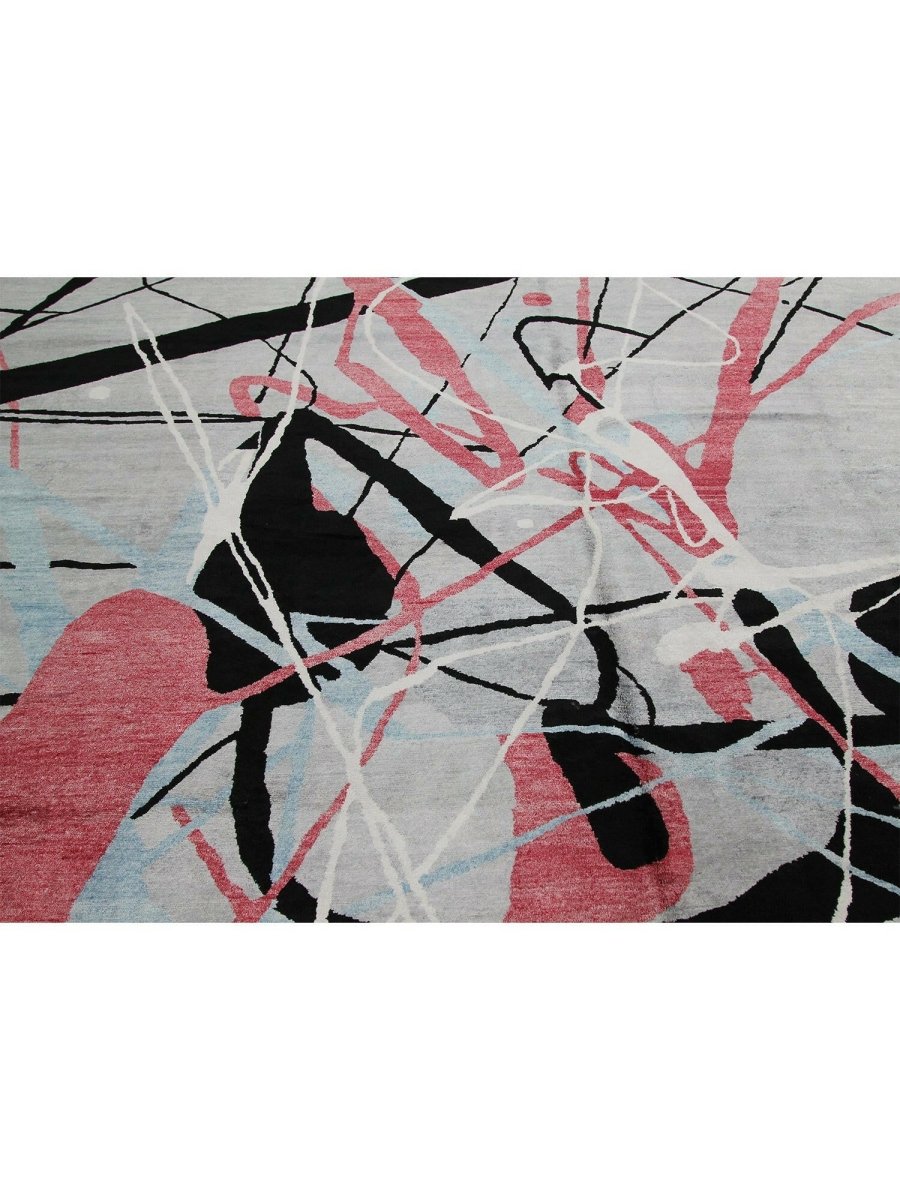 Immerse your space in the dynamic artistry of this magnificent 12x18 Contemporary Area Rug. Hand-knotted by skilled artisans in India from a luxurious blend of premium wool and bamboo silk, this new rug offers a soft underfoot feel coupled with exceptional durability. The captivating abstract pattern features bold strokes and splashes of vibrant pink, deep black, and refreshing light blue against a serene light gray ground, creating a visually compelling and modern statement.