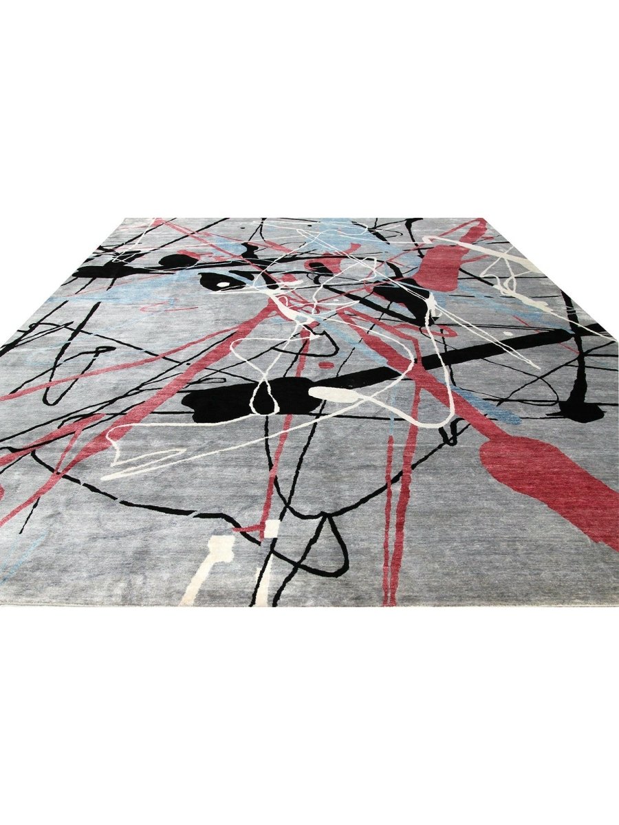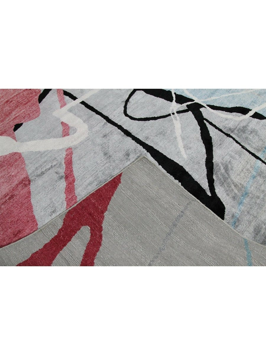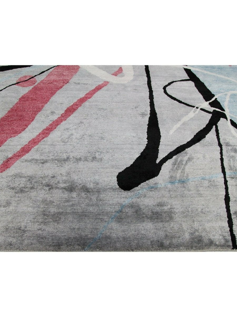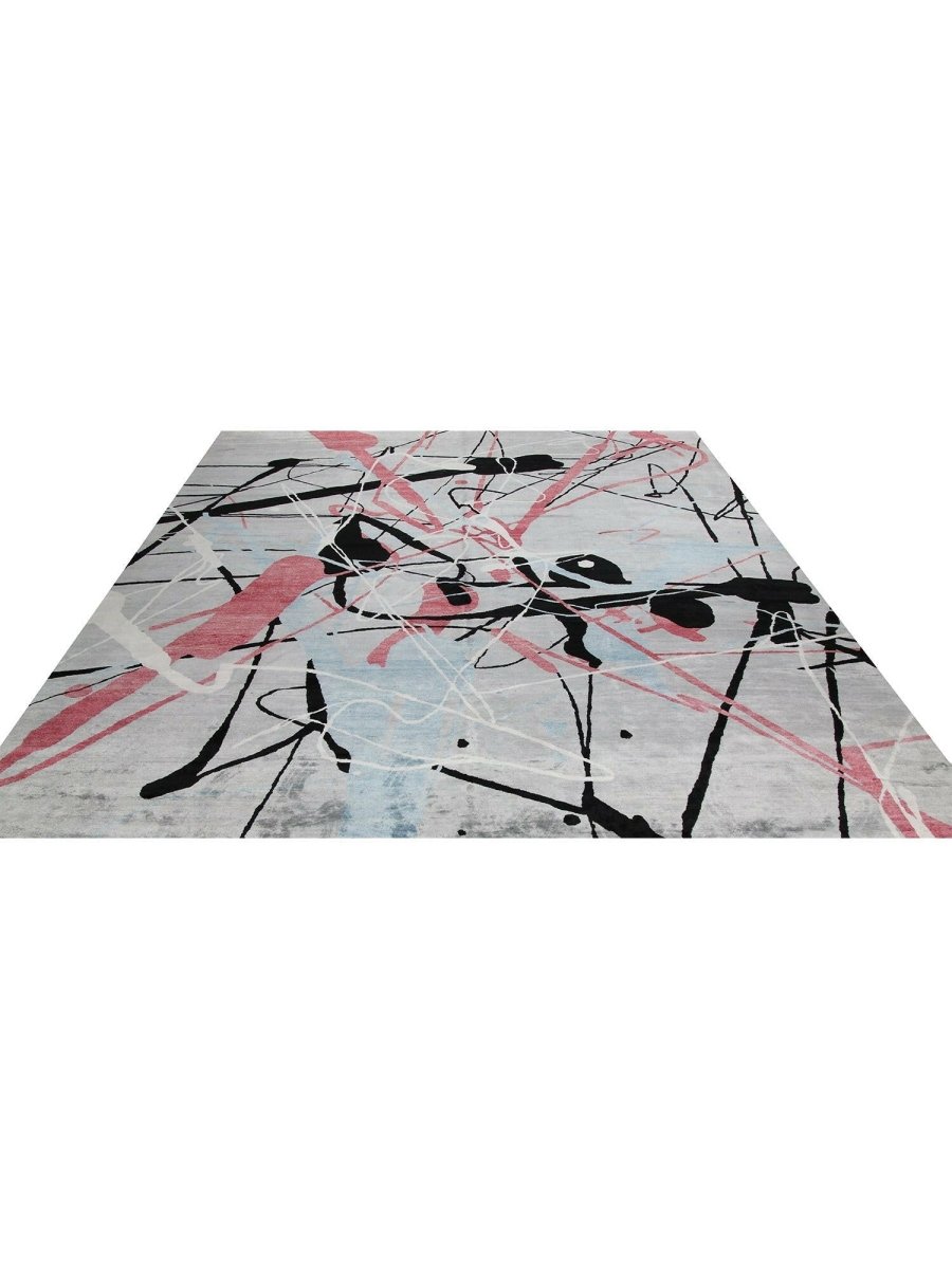 Immerse your space in the dynamic artistry of this magnificent 12x18 Contemporary Area Rug. Hand-knotted by skilled artisans in India from a luxurious blend of premium wool and bamboo silk, this new rug offers a soft underfoot feel coupled with exceptional durability. The captivating abstract pattern features bold strokes and splashes of vibrant pink, deep black, and refreshing light blue against a serene light gray ground, creating a visually compelling and modern statement.