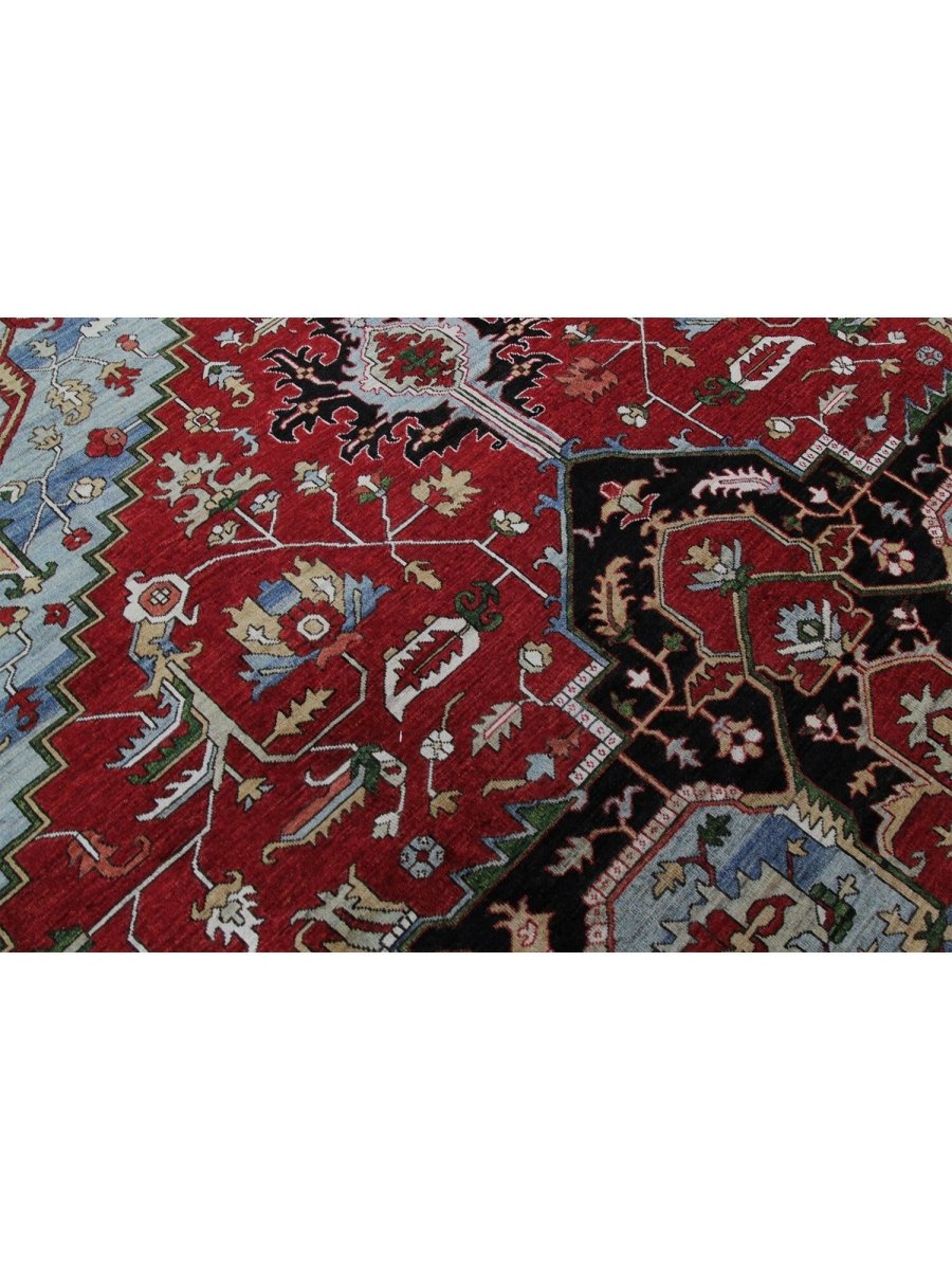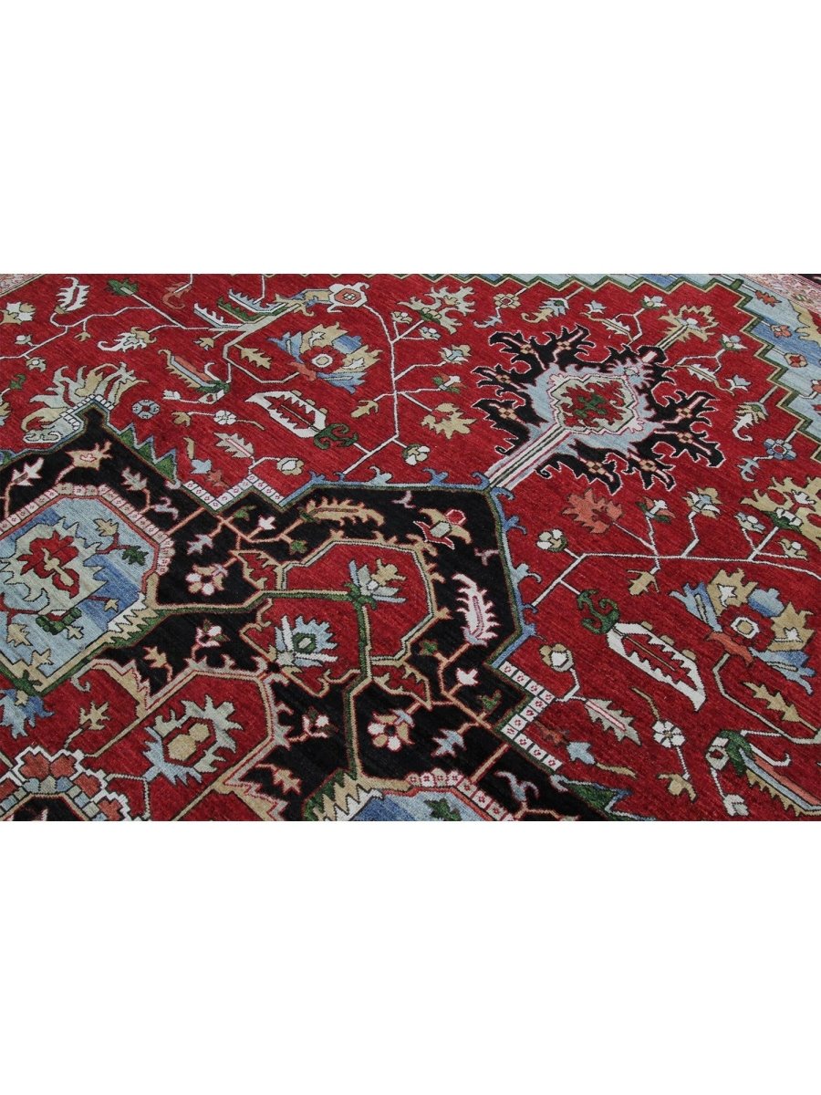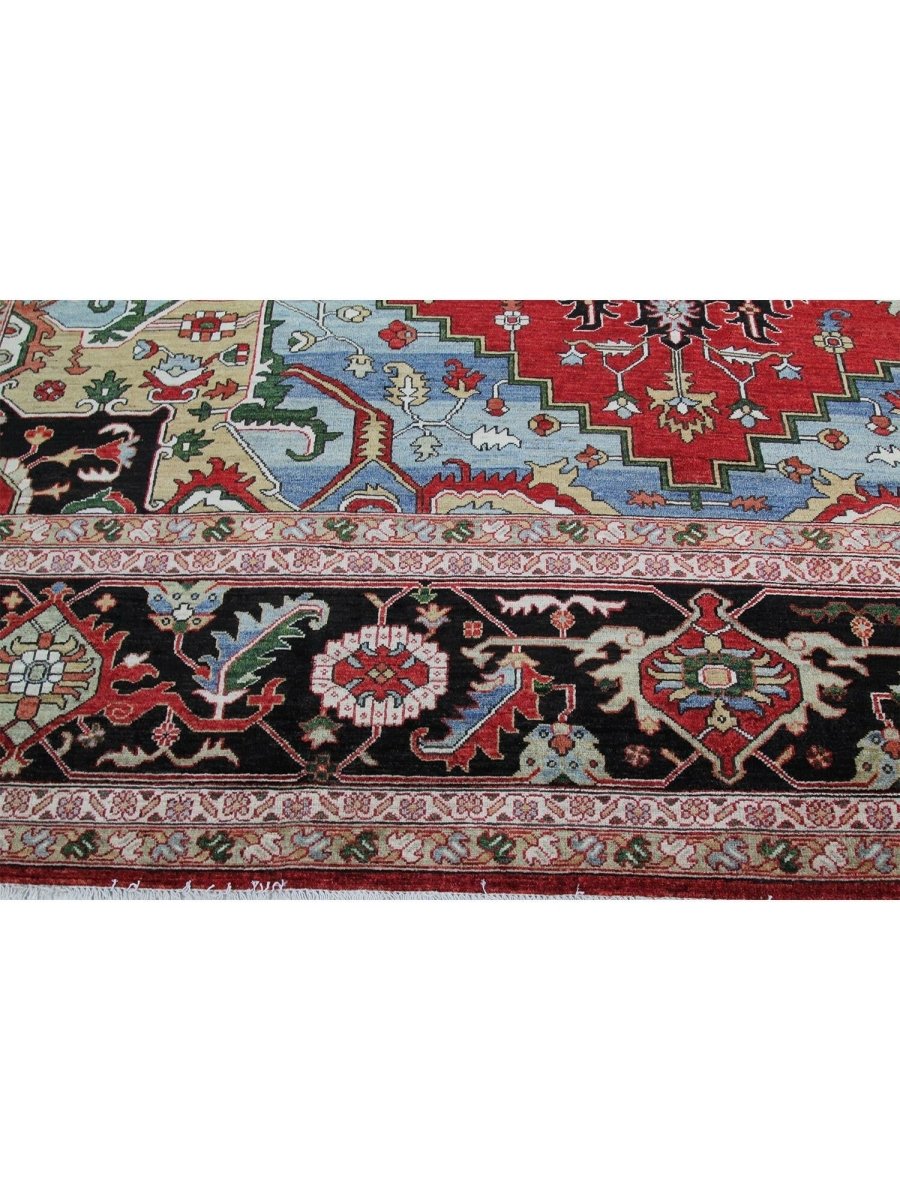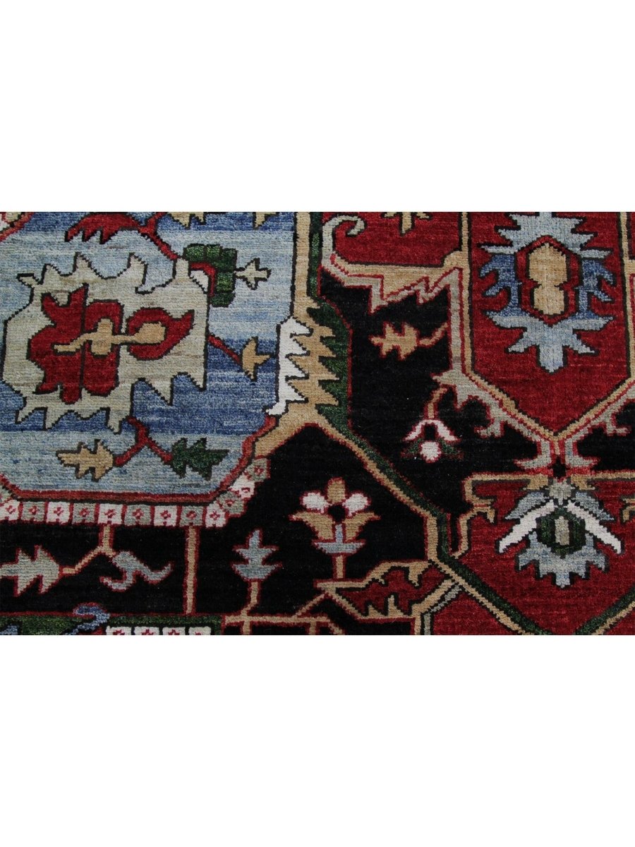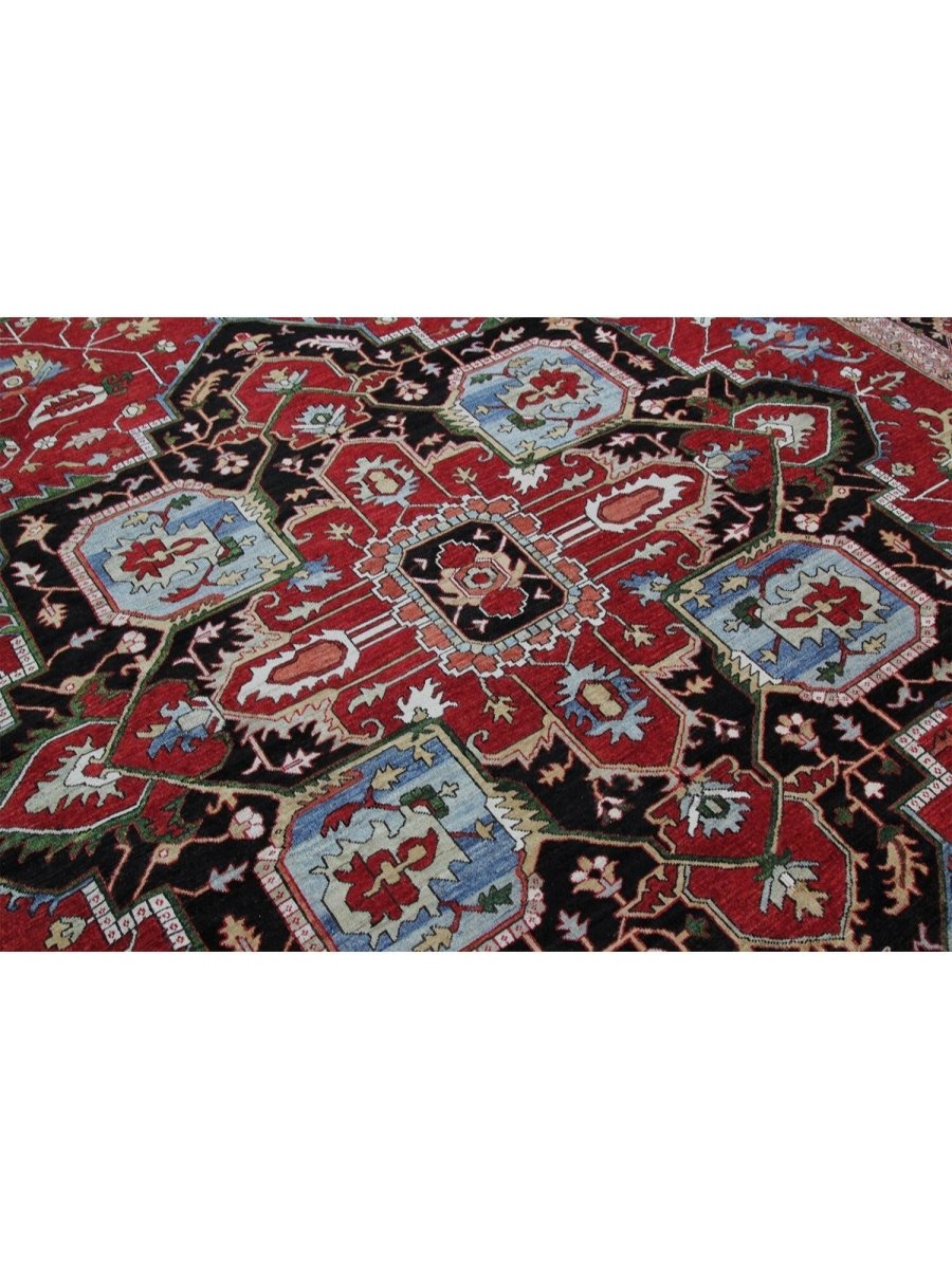 Designed in Pakistan, this 12x18 Heriz Style area rug brings classic artistry to your space. Crafted from high-quality wool, it possesses a soft texture and durable weave, making it a beautiful, long-lasting addition to the home. It features a captivating geometric pattern with a prominent central medallion. Rug displays vibrant tones including deep red, deep blue, black, and ivory, creating a refined, balanced look. Its expansive size makes this area rug perfect for anchoring grand living rooms, formal dining halls, and immense open areas, adding warmth and character. Artisan craftsmanship reflects heritage skill and detail, making it a subtle, standout piece. With free shipping across the United States, this wool rug is an inviting addition to decor. Surely it's a perfect addition for years to come.