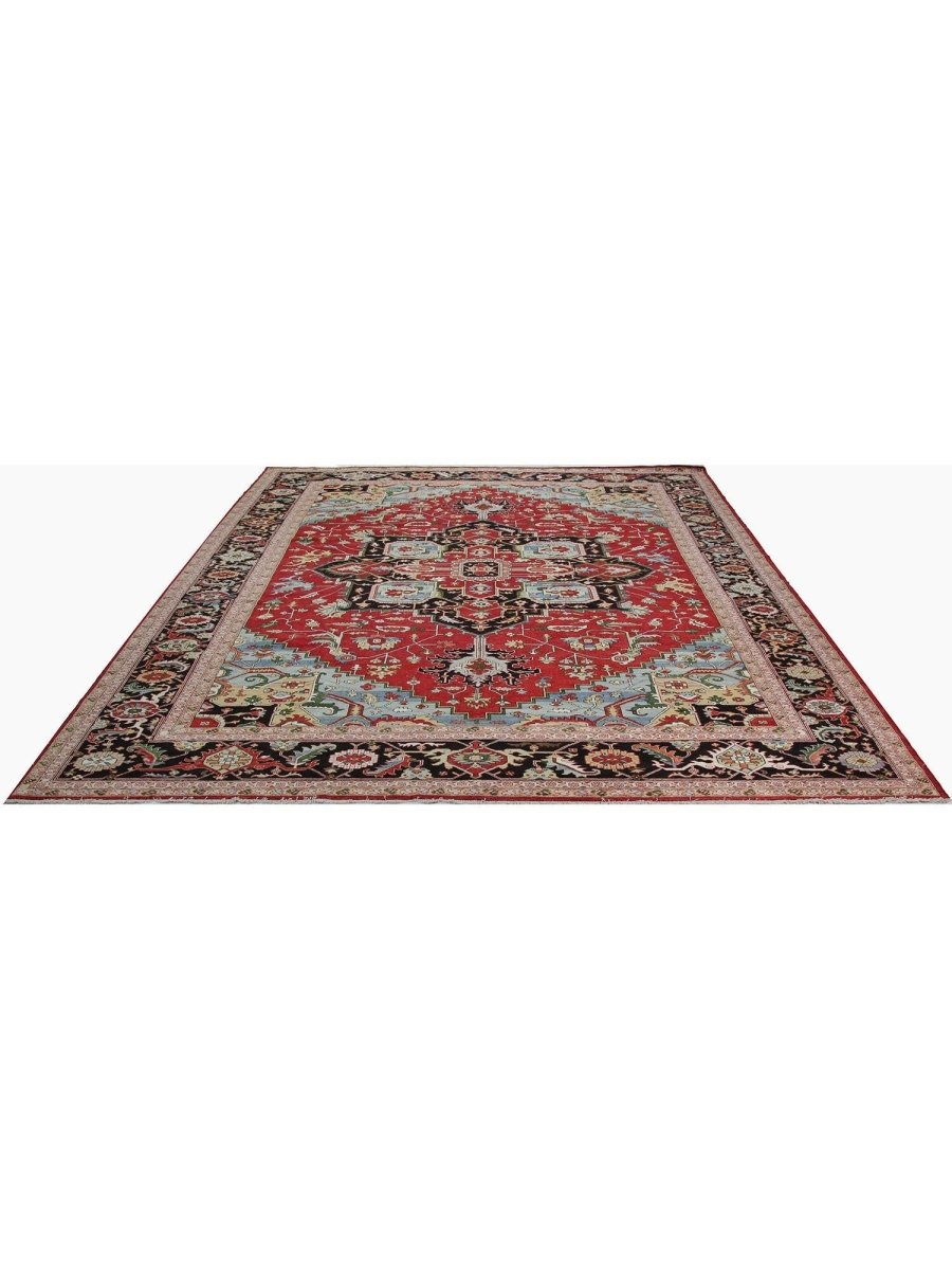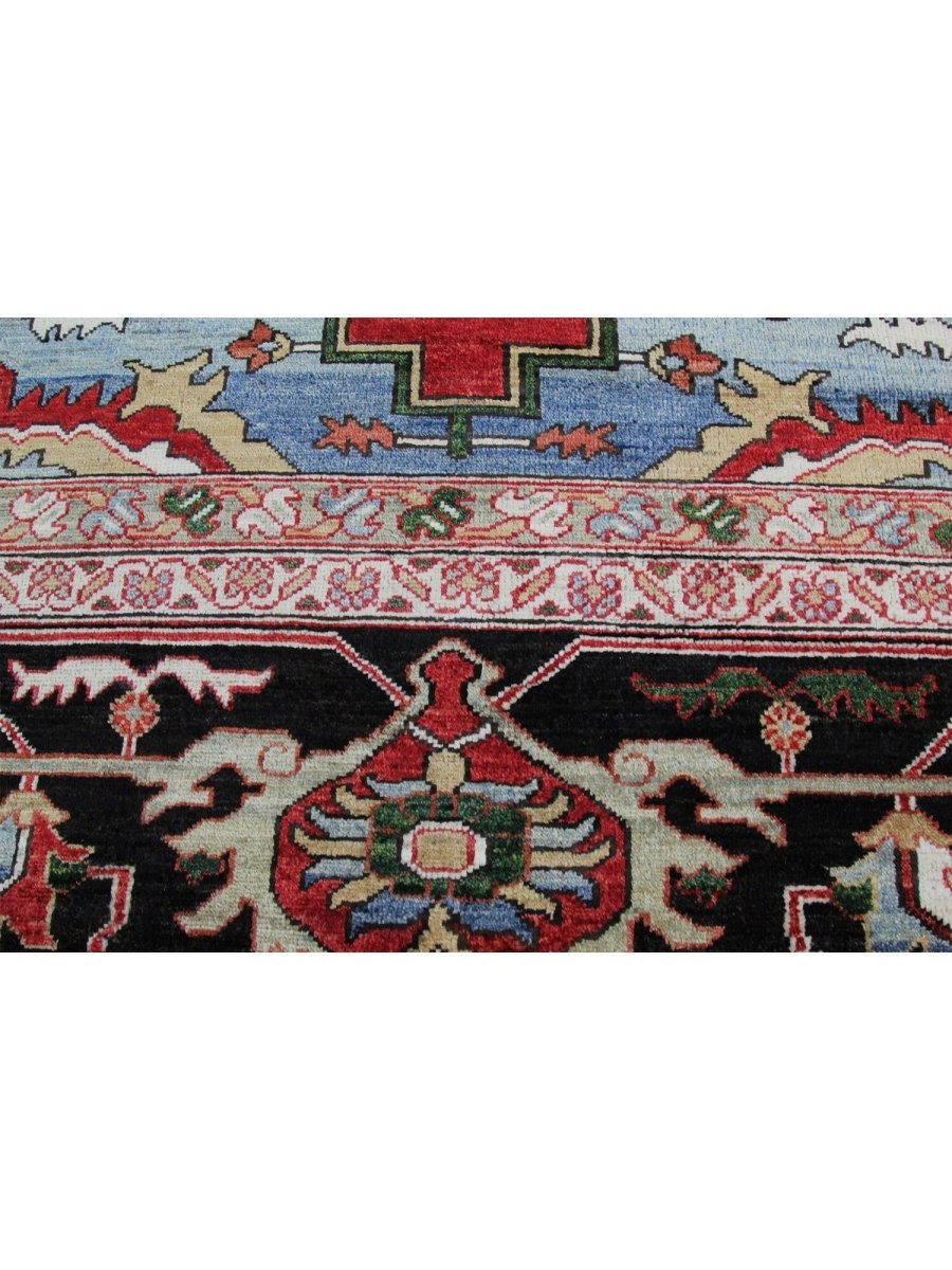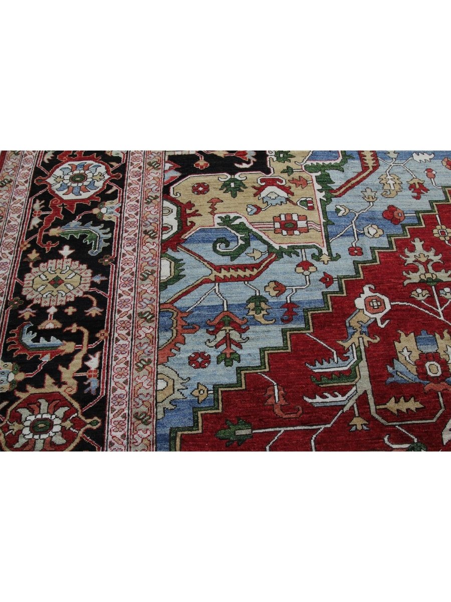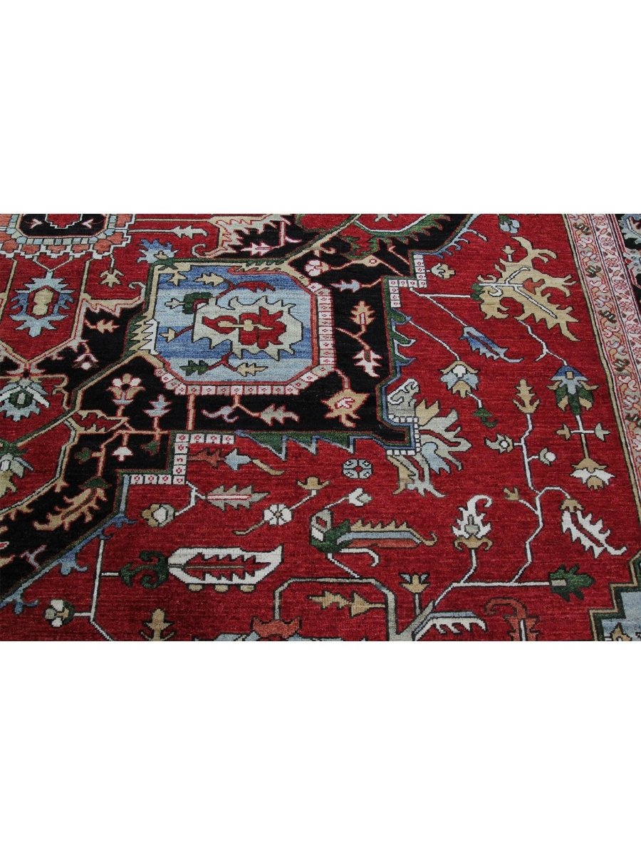 Designed in Pakistan, this 12x18 Heriz Style area rug brings classic artistry to your space. Crafted from high-quality wool, it possesses a soft texture and durable weave, making it a beautiful, long-lasting addition to the home. It features a captivating geometric pattern with a prominent central medallion. Rug displays vibrant tones including deep red, deep blue, black, and ivory, creating a refined, balanced look. Its expansive size makes this area rug perfect for anchoring grand living rooms, formal dining halls, and immense open areas, adding warmth and character. Artisan craftsmanship reflects heritage skill and detail, making it a subtle, standout piece. With free shipping across the United States, this wool rug is an inviting addition to decor. Surely it's a perfect addition for years to come.
