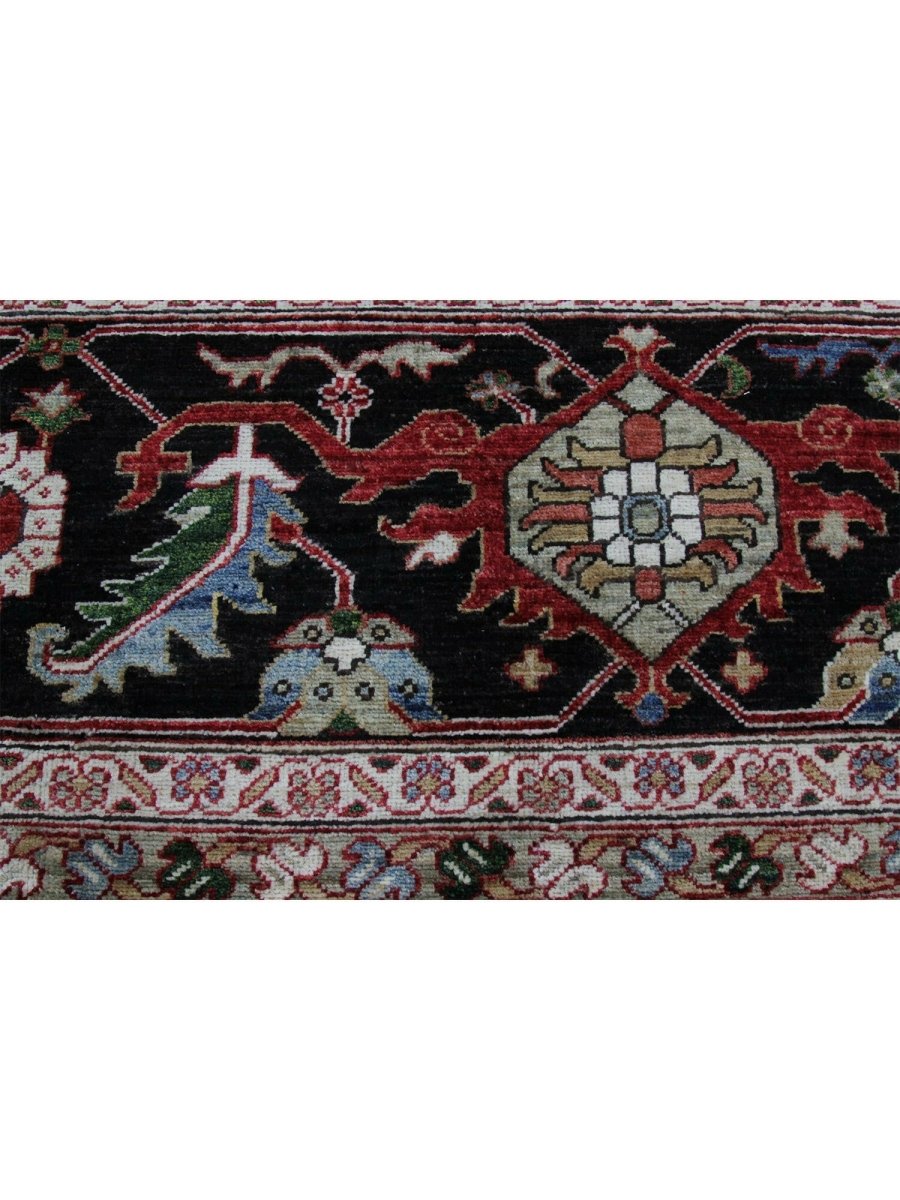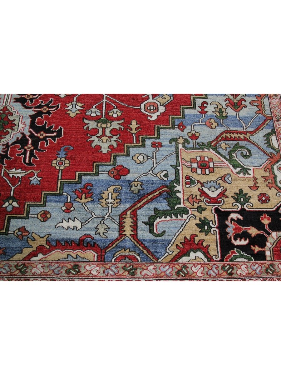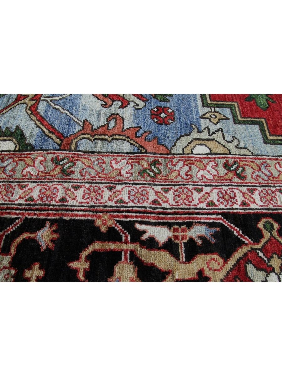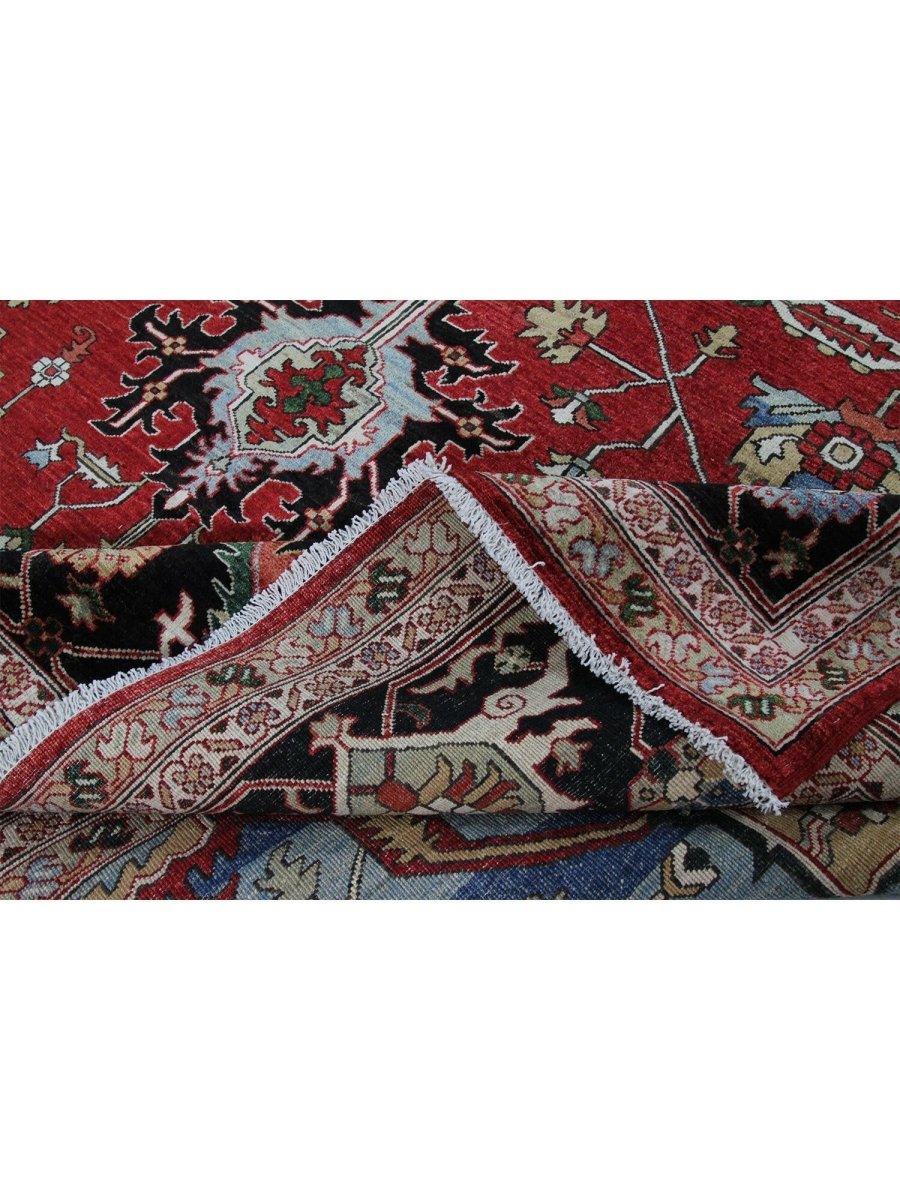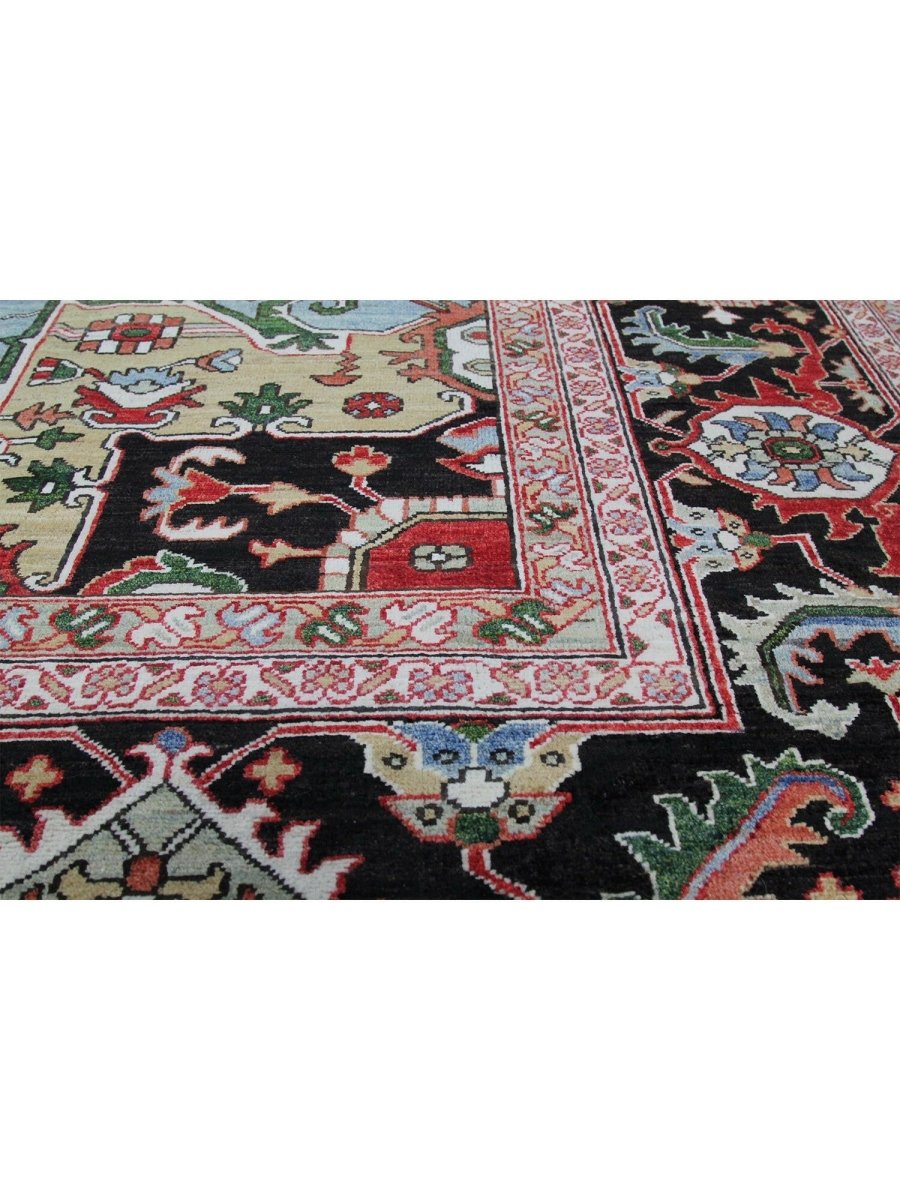 Designed in Pakistan, this 12x18 Heriz Style area rug brings classic artistry to your space. Crafted from high-quality wool, it possesses a soft texture and durable weave, making it a beautiful, long-lasting addition to the home. It features a captivating geometric pattern with a prominent central medallion. Rug displays vibrant tones including deep red, deep blue, black, and ivory, creating a refined, balanced look. Its expansive size makes this area rug perfect for anchoring grand living rooms, formal dining halls, and immense open areas, adding warmth and character. Artisan craftsmanship reflects heritage skill and detail, making it a subtle, standout piece. With free shipping across the United States, this wool rug is an inviting addition to decor. Surely it's a perfect addition for years to come.