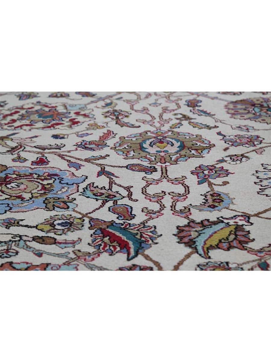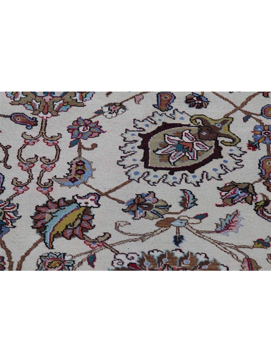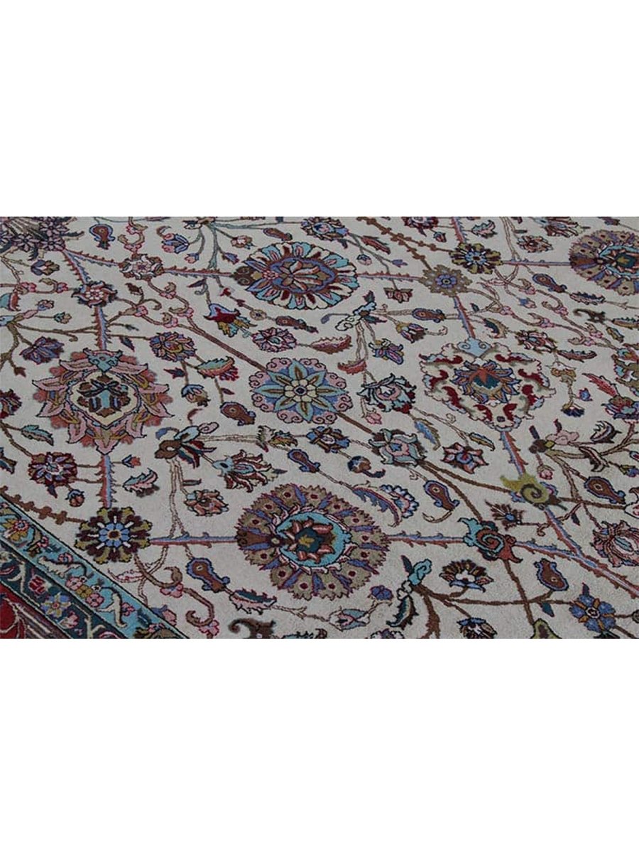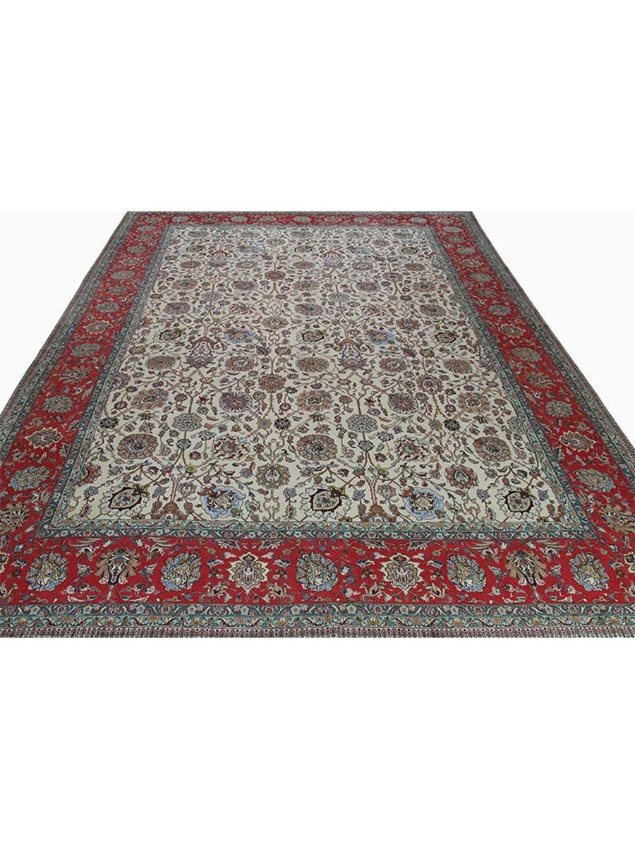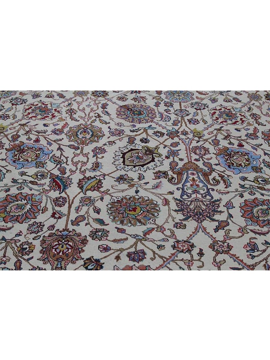 It is a lovely hand-knotted 12x18 Persian Tabriz area rug manufactured in Persia. There is a gorgeous floral pattern with flowers over a pale cream base. The ornaments are carefully finished, revealing the craftsmanship and delicacy of the weaver. The gentle color tones have variations of brown, blue, and ivory that blend peacefully to form a stylish appearance. This rug adds warmth and character to any space.